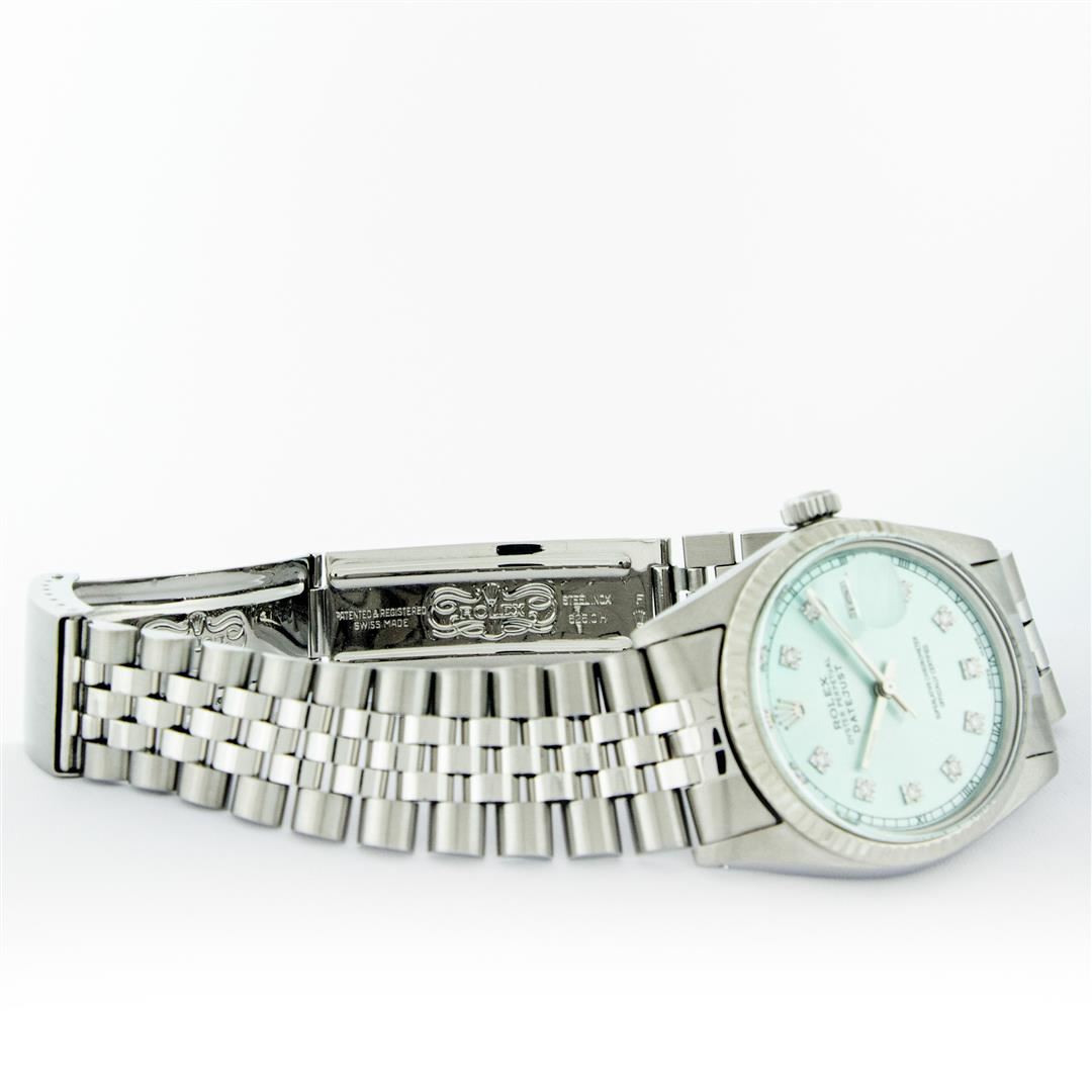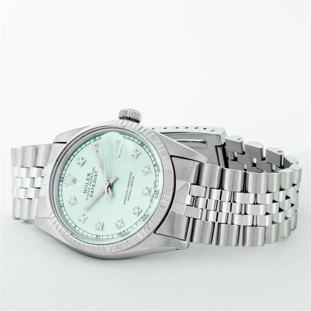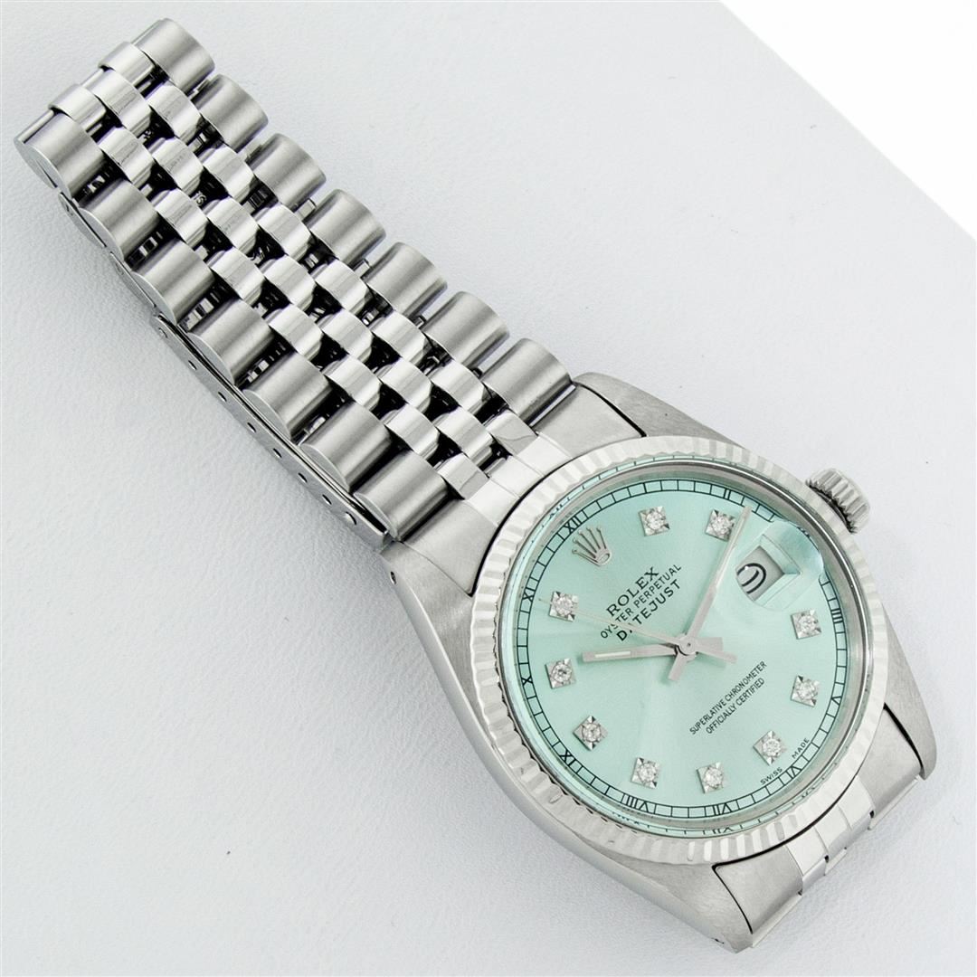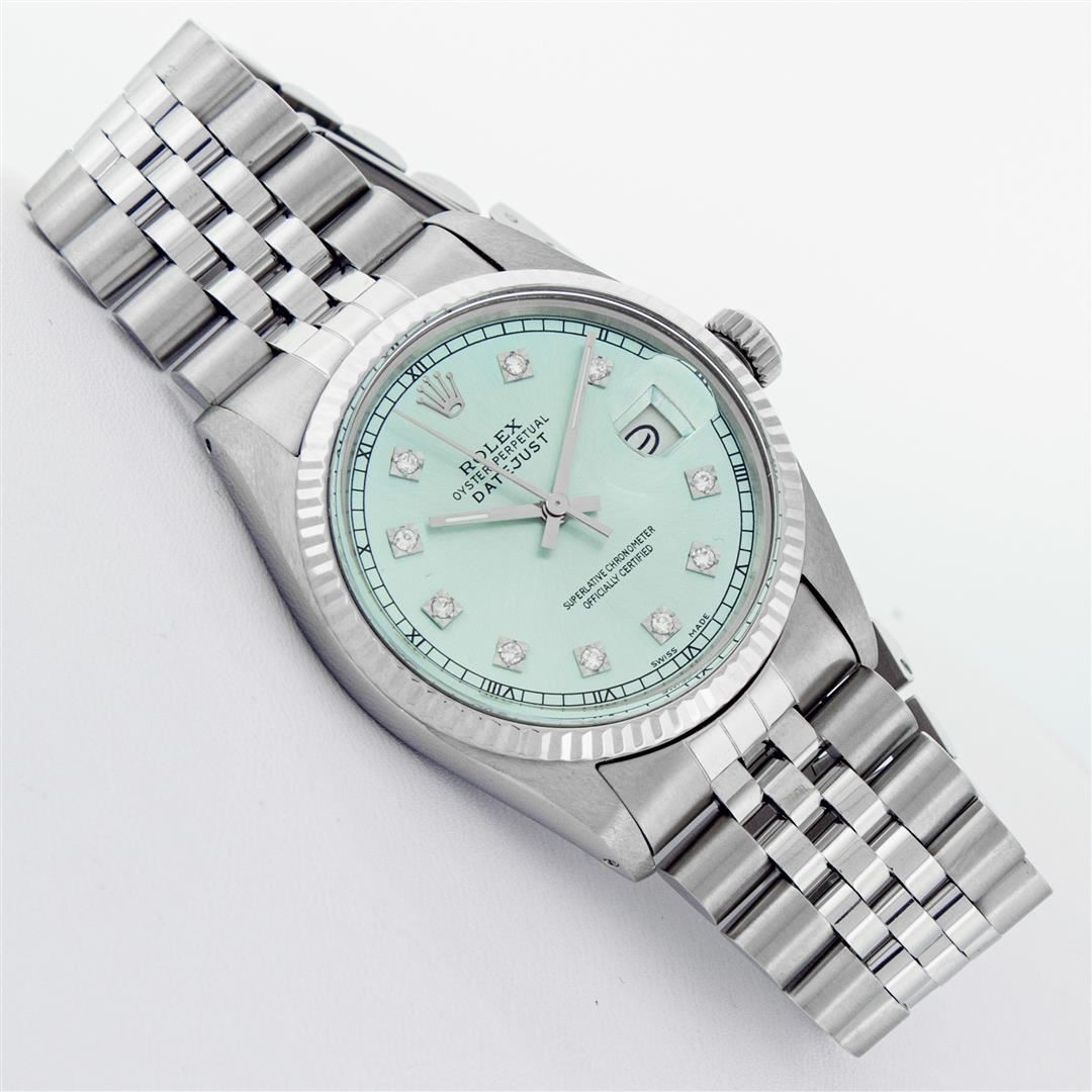 One Mens Stainless Steel Rolex Datejust Polished Bright with Satin Finish, This Watch Has Been Serviced & Electronically Tested, Stainless Steel Case: 36mm, Stainless Steel Crown, Bezel: 14K White Gold Fluted Bezel. Custom Crystal: New Acrylic Cyclops Len