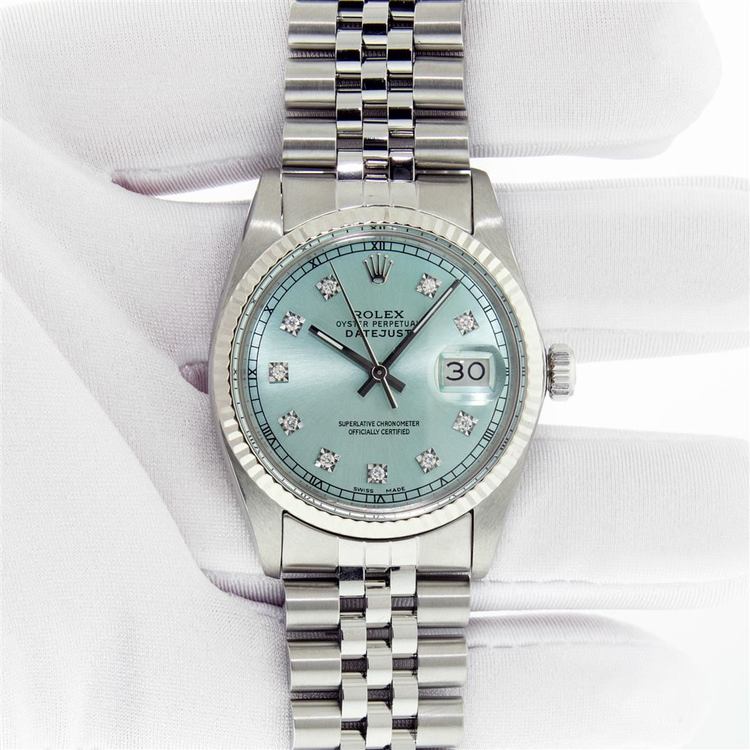 One Mens Pre Owned Stainless Steel Rolex Datejust Polished Bright with Satin Finish, This Watch Has Been Serviced & Electronically Tested, Rolex Stainless Steel Case: 36mm, Rolex Stainless Steel Crown, Rolex Bezel: 14K White Gold Fluted Bezel. Custom Crys