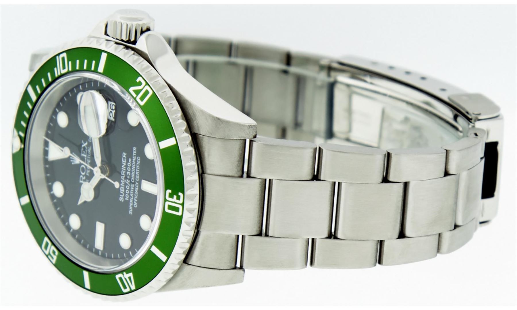 One Mens Pre Owned Rolex Anniversary Edition Stainless Steel Submariner "Kermit" With Date Polished, Serviced & Electronically Tested, Rolex Stainless Steel Case: 40mm, Rolex Stainless Steel Crown, Rolex Bezel: Stainless Steel Rotatable Bezel With Green Insert. Crystal: Sapphire With Magnified Date Window. Rolex Movement: Automatic Winding Movement Caliber 3135. Rolex Dial: Black Submariner Dial, Hands: Submariner Hands. Date Window: 3 O'Clock Position Date Display, Model: Submariner, Quickset, Condition: G-6 Extra Fine. Rolex Bracelet: Stainless Steel Oyster Band. Bright Polish & Satin Finish. 7.0 Inch Length, Adjustable. Standard Clasp, With Rolex Logo.