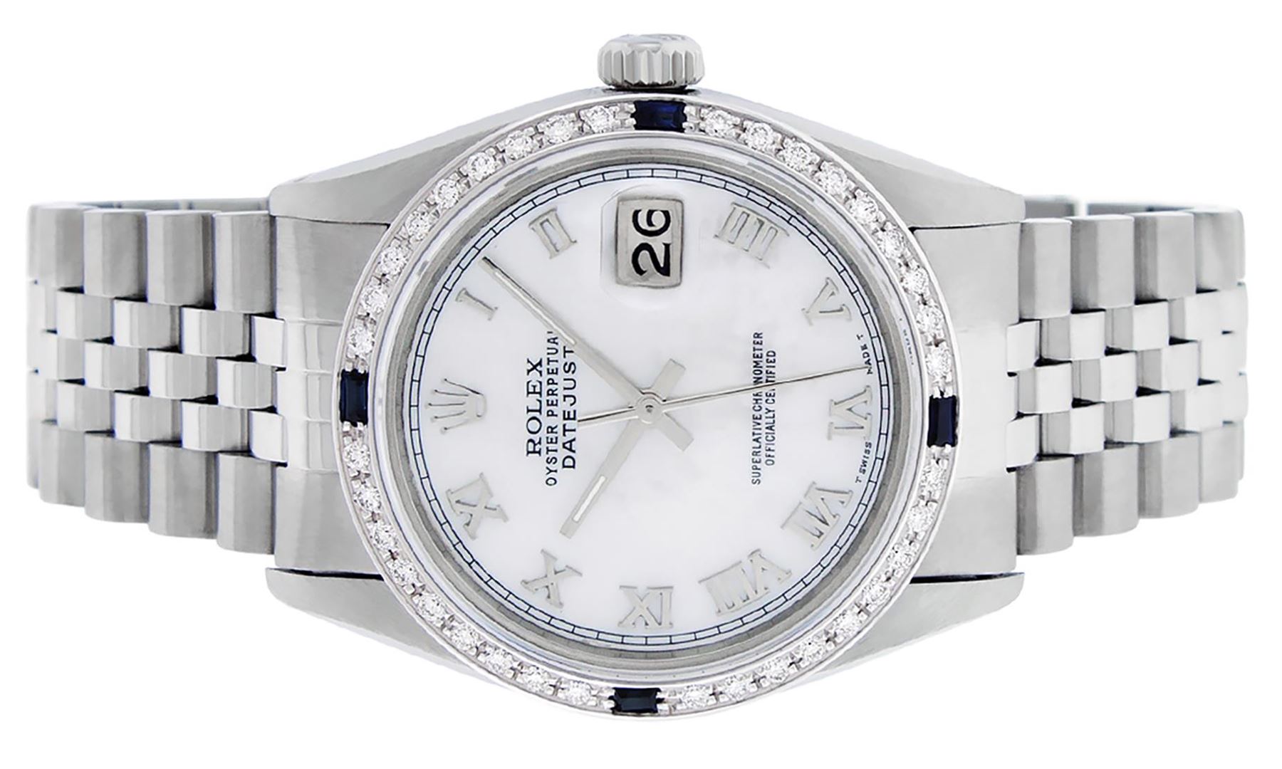 One Mens Stainless Steel Rolex Datejust Polished Bright with Satin Finish, This Watch Has Been Serviced & Electronically Tested, Stainless Steel Case: 36mm, Stainless Steel Crown, Custom Bezel: New 18K White Gold Sapphire Beadset Diamond Bezel, Diamond + Gem Count: 36 Diamonds + 4 Sapphires, Total Weight 1.00 Carat, Clarity: SI-VS, Color: G to H. Custom Crystal: New Synthetic Sapphire Cyclops Lens. Custom Hands: New Luminescent Hands. Movement: Automatic Winding Movement Caliber 3035. Custom Dial: Mother Of Pearl With Roman Track. Date Window: 3 O'Clock Position Date Display, Quickset, Model: Datejust, Condition: G-6 Extra Fine. Bracelet: Stainless Steel Jubilee. Bracelet: 7.0 Inch Length, Adjustable. Standard Clasp, With Rolex Logo. This Watch Has Been Serviced Time Tested And Is In Excellent Condition It Is Free Of All Scratches And Dents.