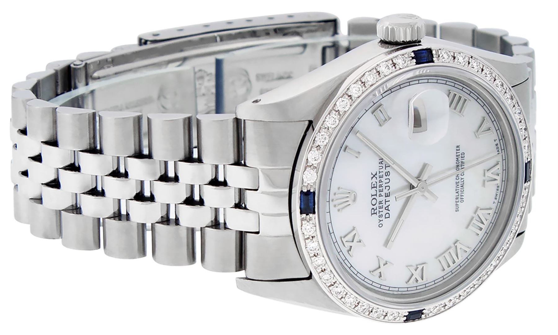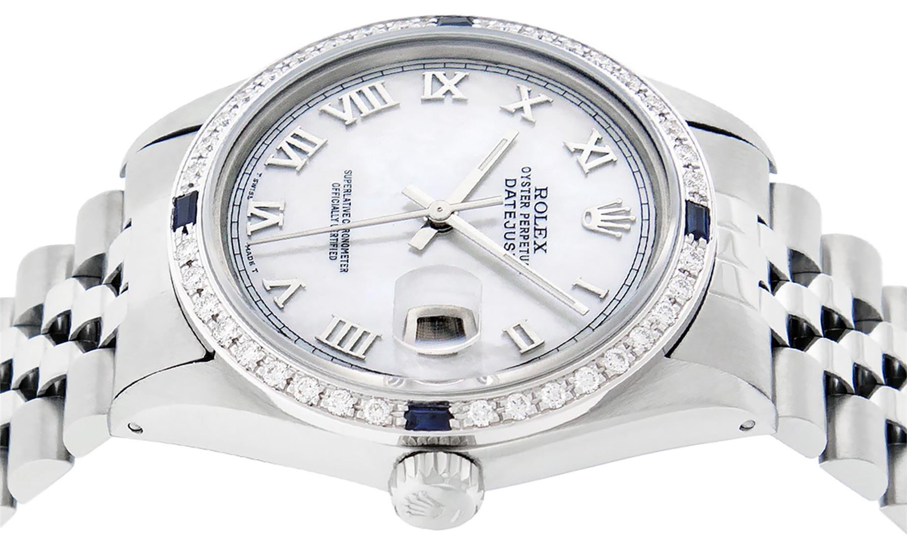 One Mens Stainless Steel Rolex Datejust Polished Bright with Satin Finish, This Watch Has Been Serviced & Electronically Tested, Stainless Steel Case: 36mm, Stainless Steel Crown, Custom Bezel: New 18K White Gold Sapphire Beadset Diamond Bezel, Diamond + Gem Count: 36 Diamonds + 4 Sapphires, Total Weight 1.00 Carat, Clarity: SI-VS, Color: G to H. Custom Crystal: New Synthetic Sapphire Cyclops Lens. Custom Hands: New Luminescent Hands. Movement: Automatic Winding Movement Caliber 3035. Custom Dial: Mother Of Pearl With Roman Track. Date Window: 3 O'Clock Position Date Display, Quickset, Model: Datejust, Condition: G-6 Extra Fine. Bracelet: Stainless Steel Jubilee. Bracelet: 7.0 Inch Length, Adjustable. Standard Clasp, With Rolex Logo. This Watch Has Been Serviced Time Tested And Is In Excellent Condition It Is Free Of All Scratches And Dents.