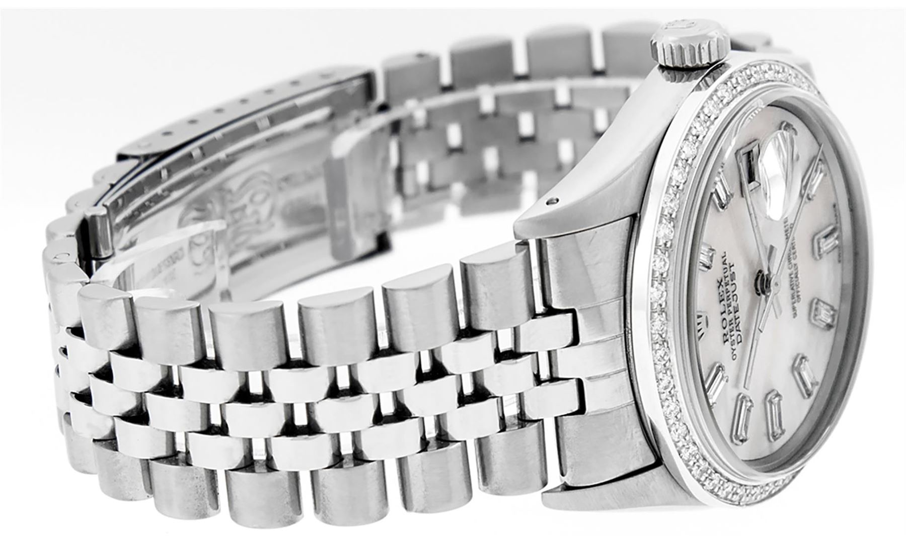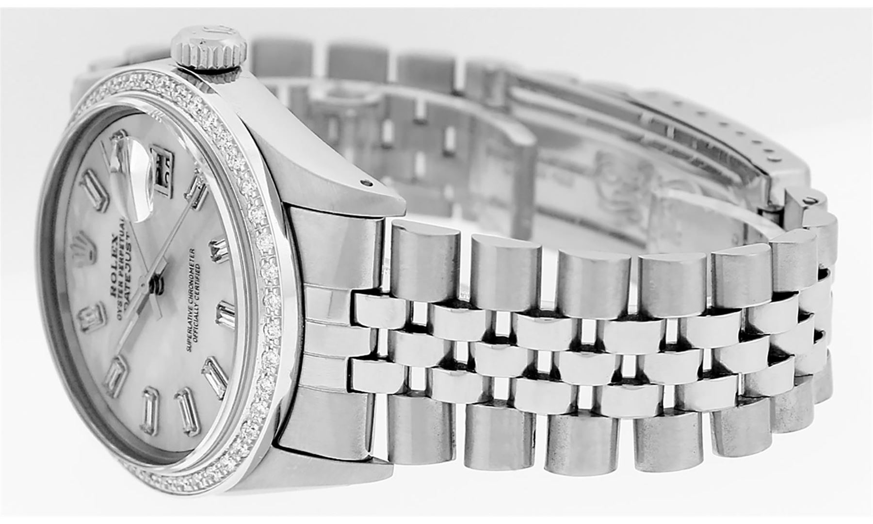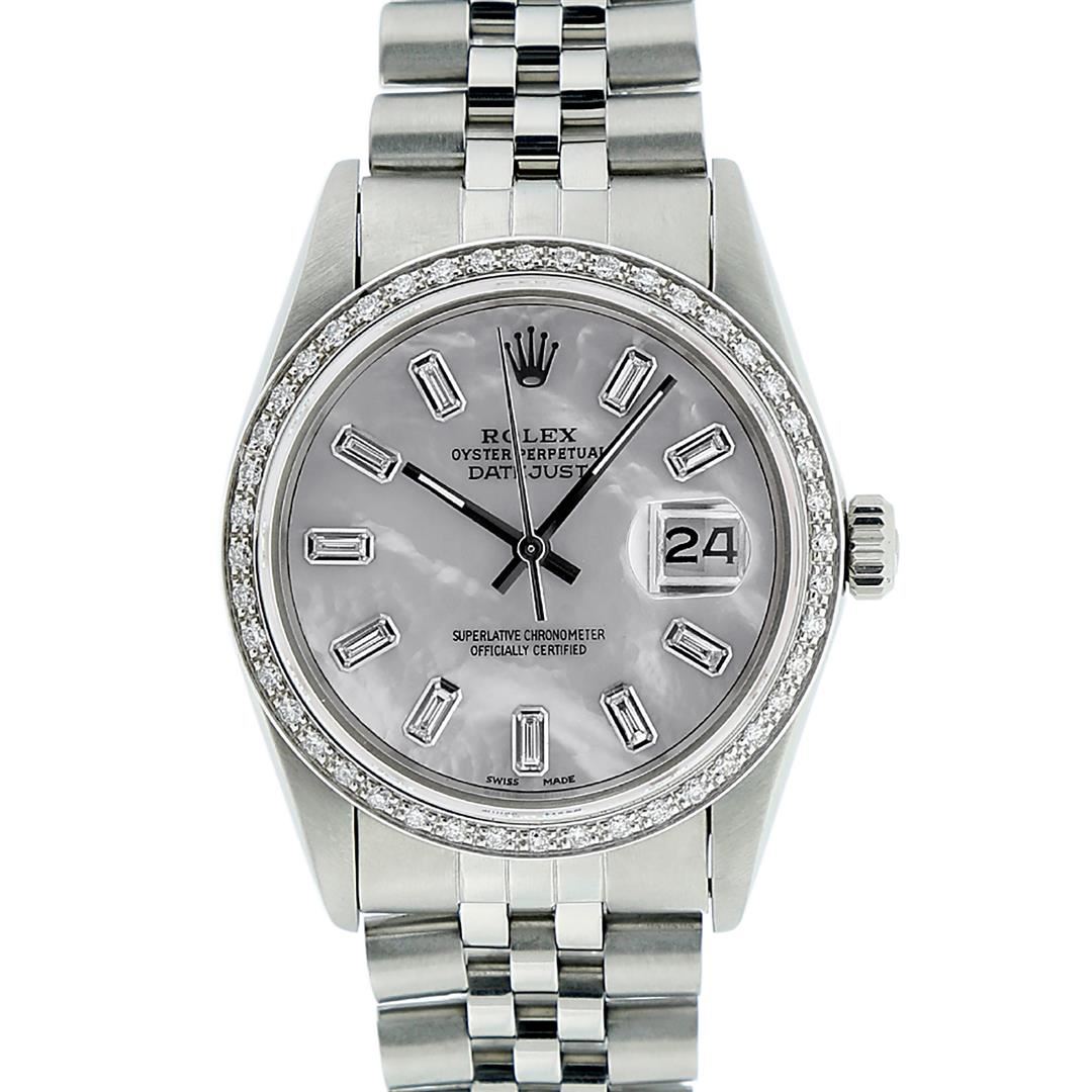 One Mens Rolex Stainless Steel Datejust Polished Bright with Satin Finish, This Watch Has Been Serviced & Electronically Tested, Stainless Steel Case: 36mm, Stainless Steel Crown, Custom Bezel: New 18K White Gold Beadset Diamond Bezel, Diamond Count: 44 Diamonds In Bezel, Total Weight 1.00 Carat, Clarity: SI-VS, Color: G to H. Custom Crystal: New Scratch Resistant Synthetic Sapphire Cyclops Lens. Custom Hands: New Luminescent Hands. Movement: Automatic Winding Movement Caliber 3035. Custom Dial: Mother Of Pearl Diamond Dial, Diamond Count: 10 Baguette Diamonds On Dial, Color: G to H, Clarity: VS2-SI1. Date Window: 3 O'Clock Position Date Display, Quickset, Model: Datejust. Condition: G-6 Extra Fine. Bracelet: Stainless Steel Jubilee Band. Bright Polish & Satin Finish. 7.0 Inch Length, Adjustable. Standard Clasp, With Rolex Logo. This Watch Has Been Serviced Time Tested And Is In Excellent Condition It Is Free Of All Scratches And Dents.