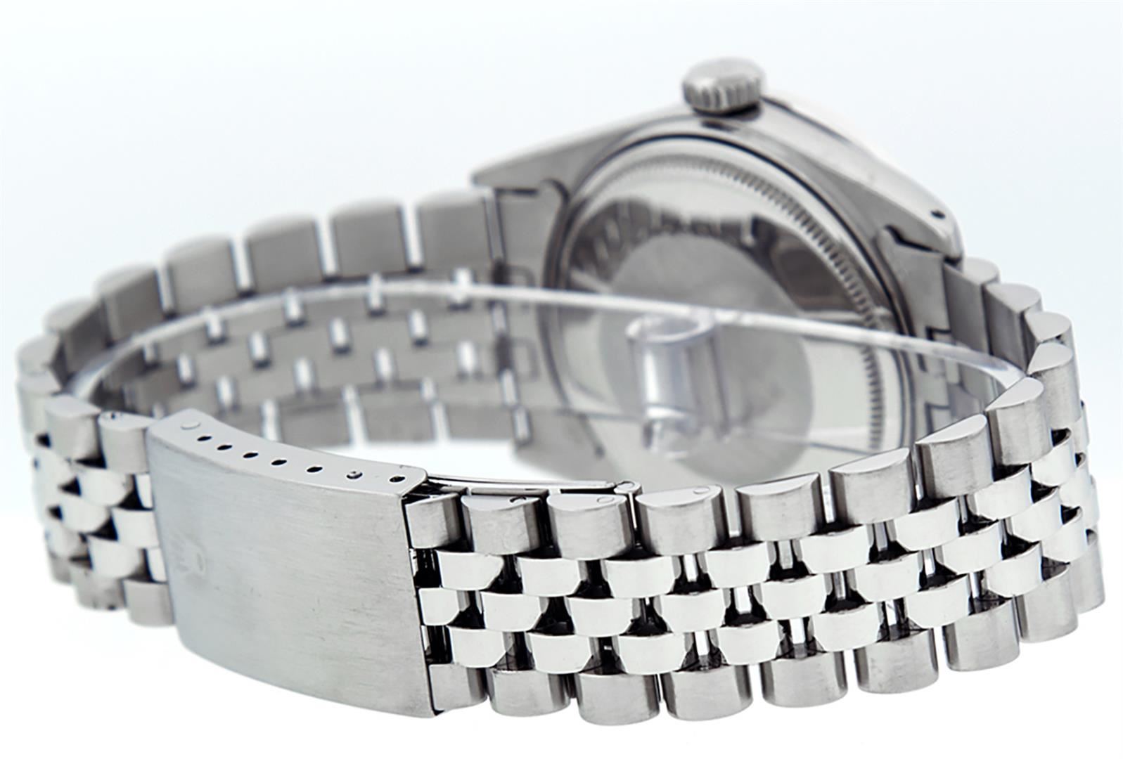 One Mens Rolex Stainless Steel Datejust Polished Bright with Satin Finish, This Watch Has Been Serviced & Electronically Tested, Stainless Steel Case: 36mm, Stainless Steel Crown, Custom Bezel: New 18K White Gold Beadset Diamond Bezel, Diamond Count: 44 Diamonds In Bezel, Total Weight 1.00 Carat, Clarity: SI-VS, Color: G to H. Custom Crystal: New Scratch Resistant Synthetic Sapphire Cyclops Lens. Custom Hands: New Luminescent Hands. Movement: Automatic Winding Movement Caliber 3035. Custom Dial: Mother Of Pearl Diamond Dial, Diamond Count: 10 Baguette Diamonds On Dial, Color: G to H, Clarity: VS2-SI1. Date Window: 3 O'Clock Position Date Display, Quickset, Model: Datejust. Condition: G-6 Extra Fine. Bracelet: Stainless Steel Jubilee Band. Bright Polish & Satin Finish. 7.0 Inch Length, Adjustable. Standard Clasp, With Rolex Logo. This Watch Has Been Serviced Time Tested And Is In Excellent Condition It Is Free Of All Scratches And Dents.