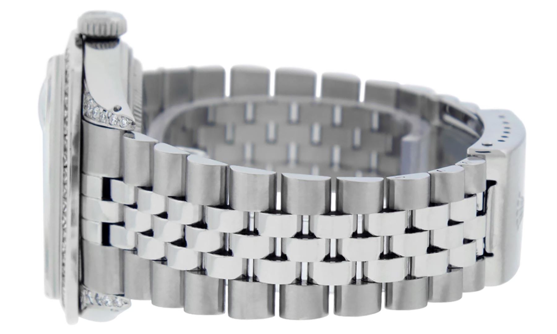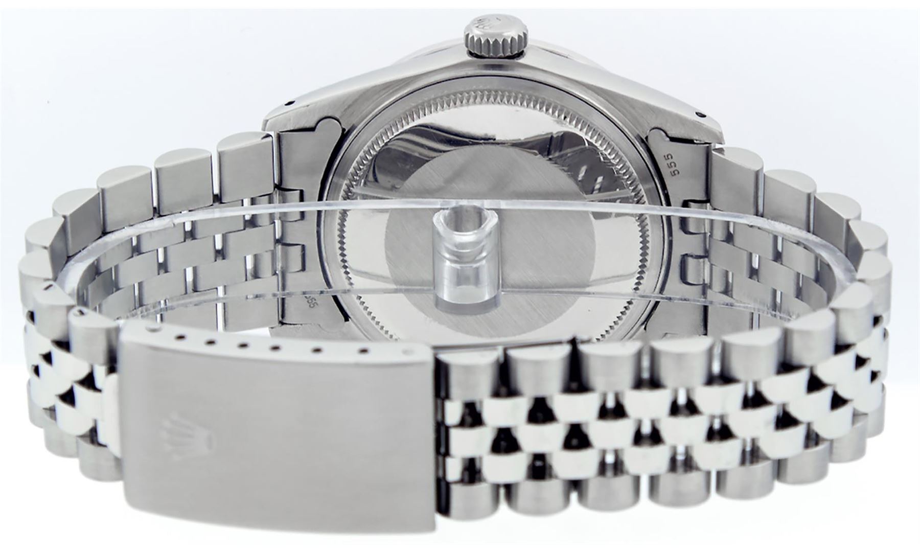One Mens Rolex Datejust Polished Bright with Satin Finish, Serviced & Electronically Tested, Stainless Steel Case: 36mm, Custom Diamond Lugs: 28 Diamonds In Lugs, Color: G to H, Clarity: SI-VS. Stainless Steel Crown, Custom Bezel: New 14K White Gold 2.75 Carat Princess Cut Diamond Bezel, Diamond Count: 53 Diamonds, Total Weight 2.75 Carat, Clarity: SI-VS, Color: G to H. Custom Crystal: New Synthetic Sapphire Cyclops Lens. Custom Hands: New Luminescent Hands. Movement: Automatic Winding Movement Caliber 3035. Custom Dial: Mother Of Pearl Diamond Dial, Diamond Count: 10 Diamonds In Dial, Diamond Color: G To H In Color, Clarity: SI-VS. Date Window: 3 O'Clock Position Date Display, Quickset, Model: Datejust Condition: G-6 Extra Fine. Bracelet: Stainless Steel Jubilee Band. Bright Polish & Satin Finish. 7.0 Inch Length, Adjustable. Standard Clasp, With Rolex Logo. This Watch Has Been Serviced And Polished And Its Free Of All Dents And Scratches. This Watch Comes With A Rolex Box.