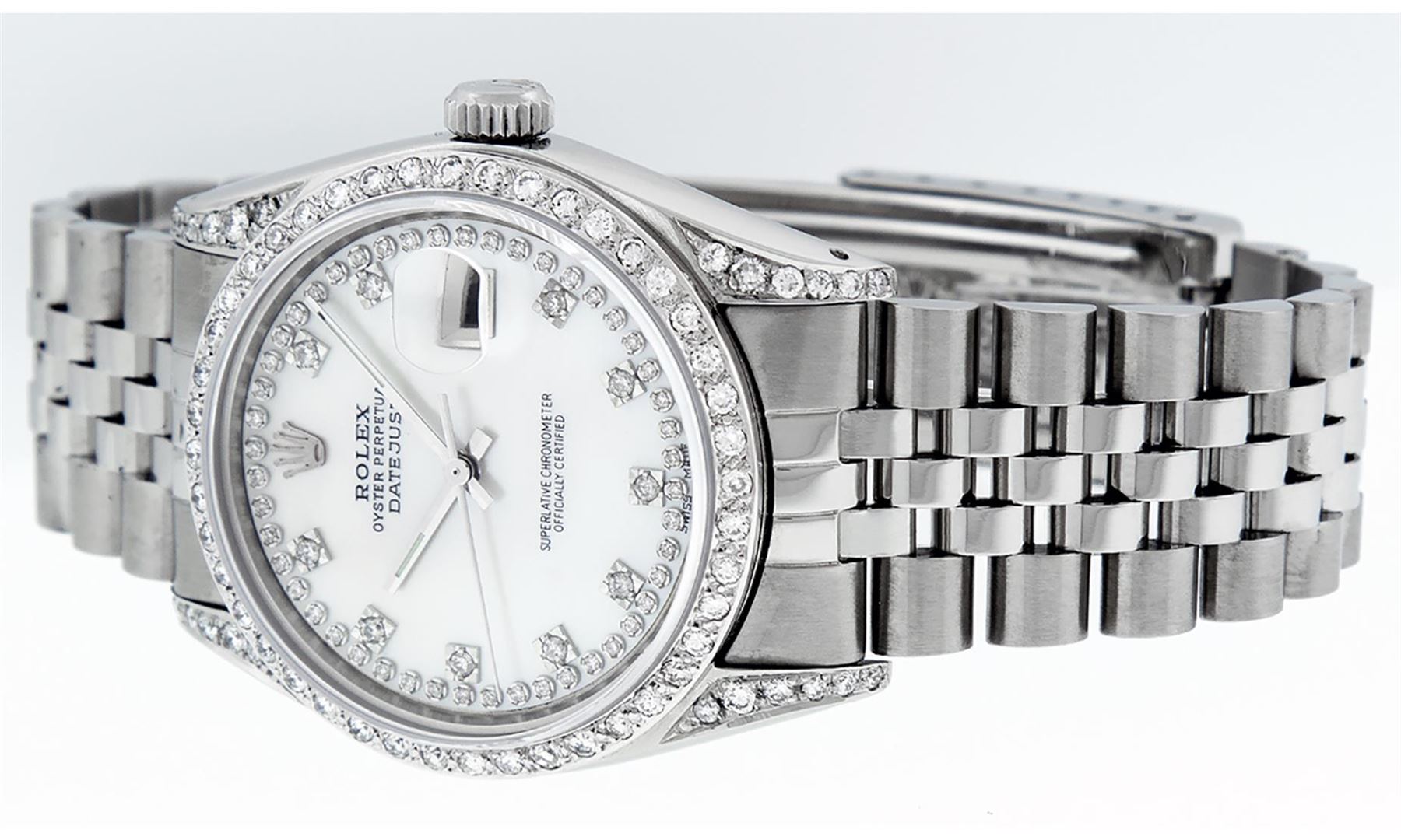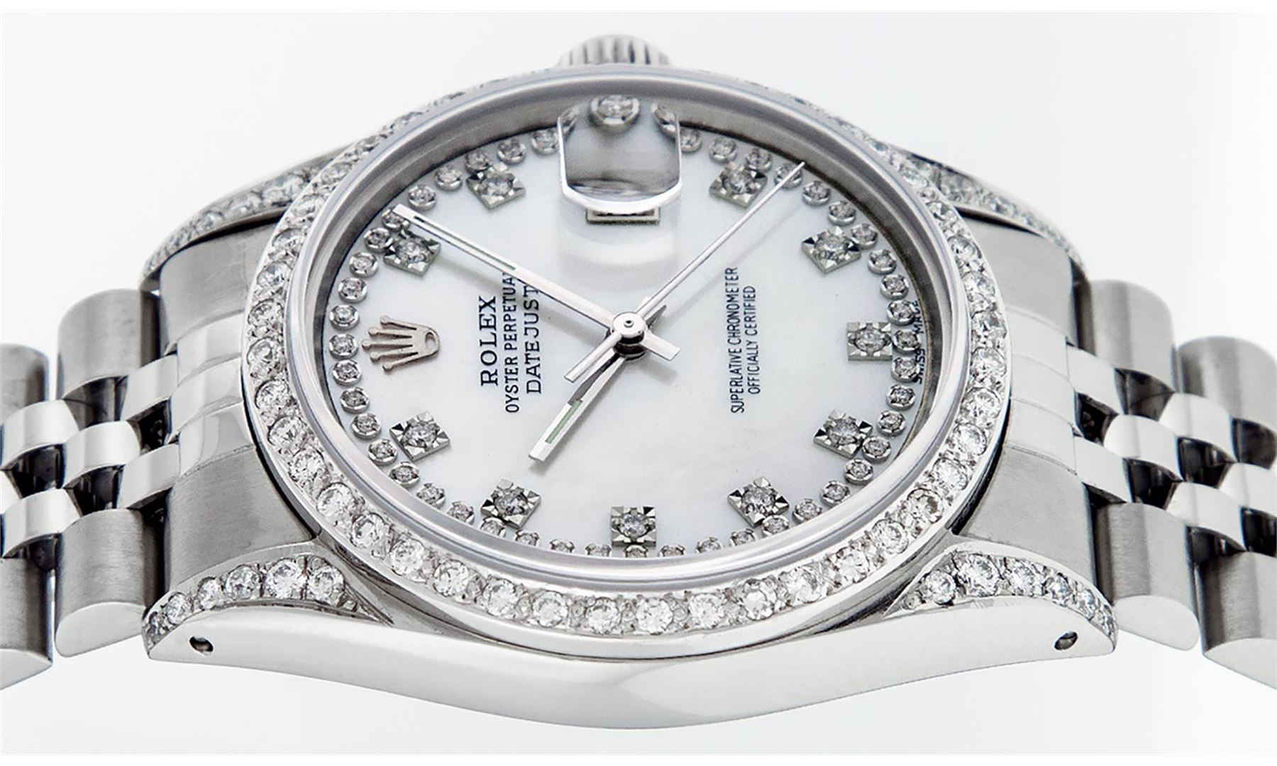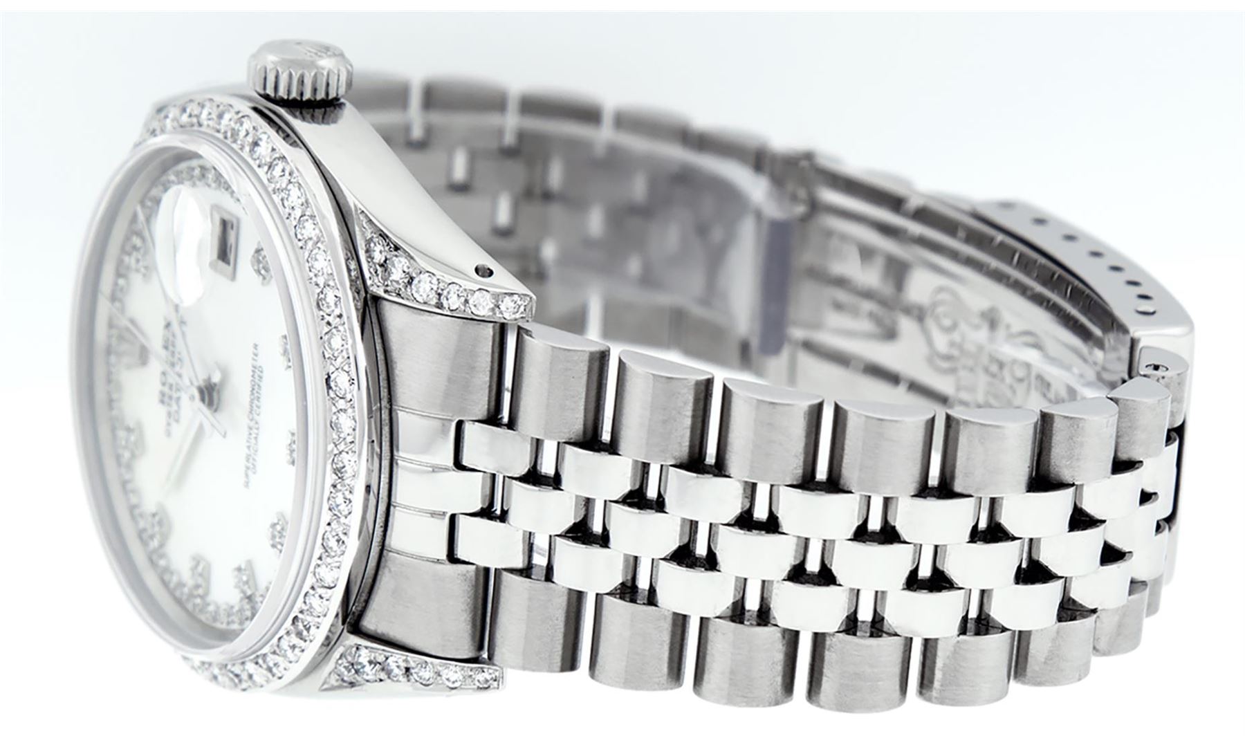 One Mens Rolex Datejust Polished Bright with Satin Finish, Serviced & Electronically Tested, Stainless Steel Case: 36mm, Custom Diamond Lugs: 28 Diamonds In Lugs, Color: G to H, Clarity: SI-VS. Stainless Steel Crown, Custom Bezel: 18K White Gold Diamond Beadset Bezel, Diamond Count: 44 Diamonds, Total Weight 1.00 Carat, Clarity: SI-VS, Color: G to H. Custom Crystal: New Scratch Resistant Synthetic Sapphire Cyclops Lens. Custom Hands: New Luminescent Hands. Movement: Automatic Winding Movement Caliber 3035. Custom Dial: Mother Of Pearl String Single Cut Diamond Dial, Stone Count: 58 Diamonds In Dial, Diamond Color: G To H In Color, Clarity: VS. Date Window: 3 O'Clock Position Date Display, Quickset, Model: Datejust Condition: G-6 Extra Fine. Bracelet: Stainless Steel Jubilee Band. Bright Polish & Satin Finish. 7.0 Inch Length, Adjustable. Standard Clasp, With Rolex Logo. This Watch Has Been Serviced And Polished And Its Free Of All Dents And Scratches.