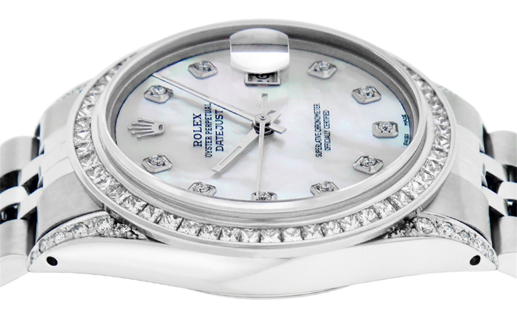 One Mens Rolex Datejust Polished Bright with Satin Finish, Serviced & Electronically Tested, Stainless Steel Case:36mm, Diamond Lugs: 24 Diamonds In Lugs, Color: G to H, Clarity: SI-VS. Stainless Steel Crown, Custom Bezel: 14K White Gold Princess Diamond Bezel, Diamond Count: 53 Diamonds, Total Weight 2.75 Carat, Clarity: SI-VS, Color: G to H. Custom Crystal: Synthetic Sapphire Cyclops Lens. Custom Hands: New Luminescent Hands. Movement: Automatic Winding Movement Caliber 3035. Custom Dial: Mother Of Pearl Diamond Dial, Diamond Color: G To H In Color, Clarity: SI-VS. Date Window: 3 O'Clock Position Date Display, Quickset, Model: Datejust Condition: G-6 Extra Fine. Bracelet: Stainless Steel Jubilee. Bright Polish & Satin Finish. 7.0 Inch Length, Adjustable. Standard Clasp, With Rolex Logo. This watch has been serviced and polished and its free of all dents and scratches and has been time tested.