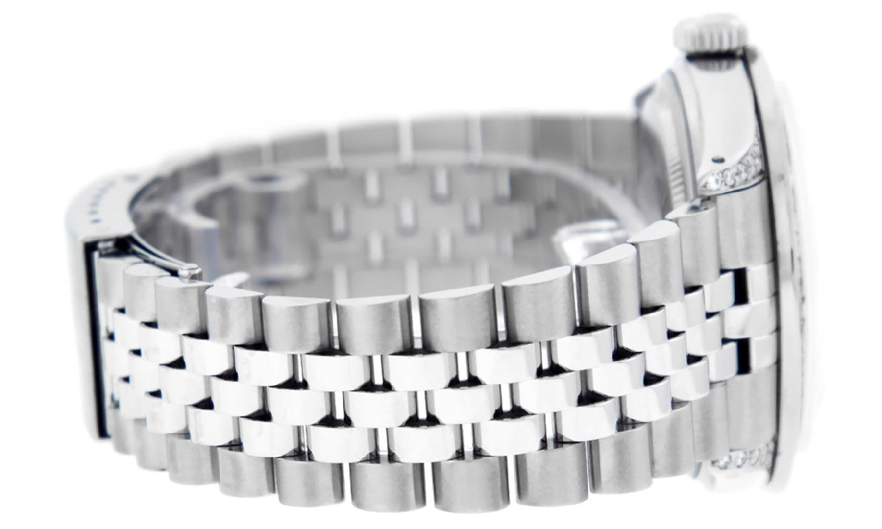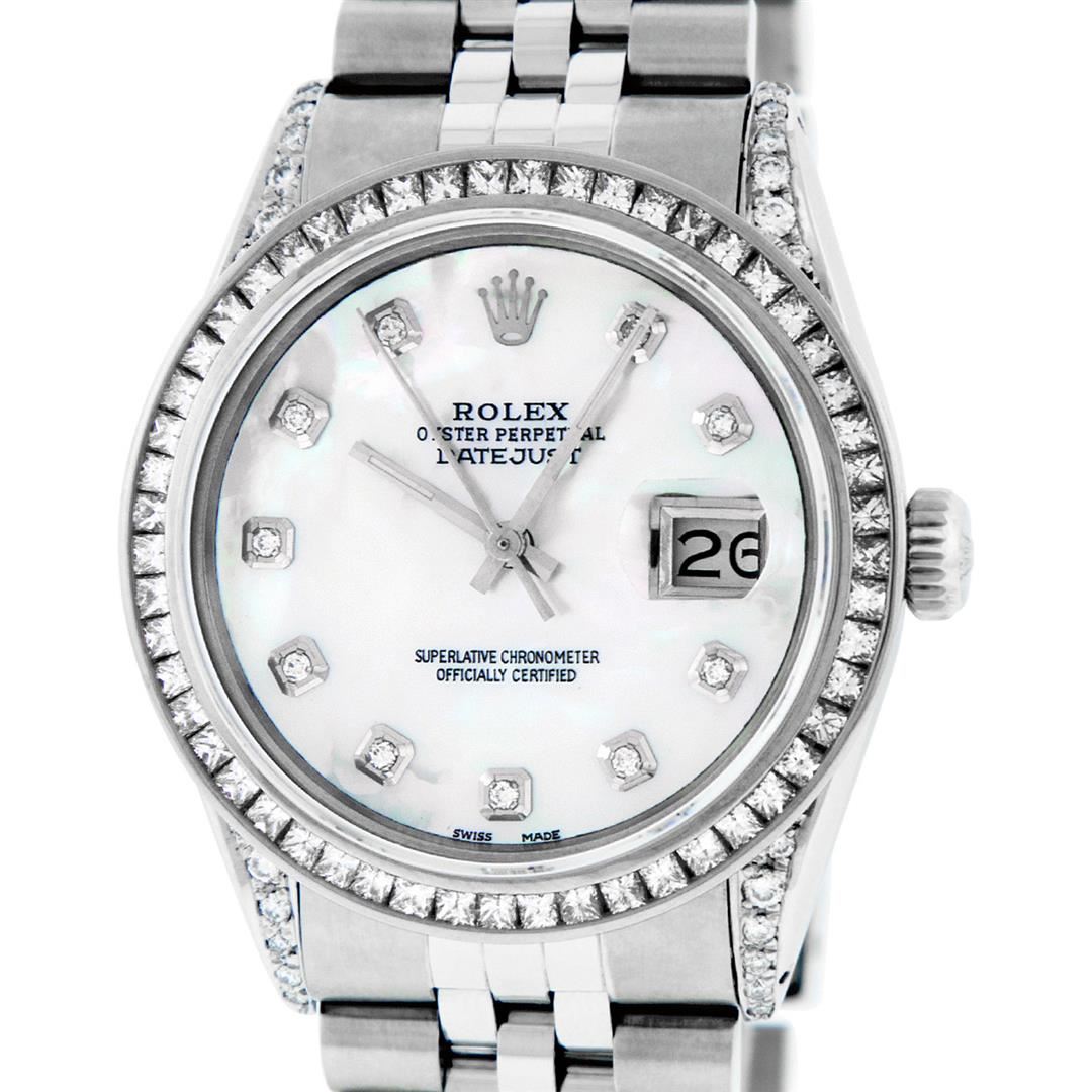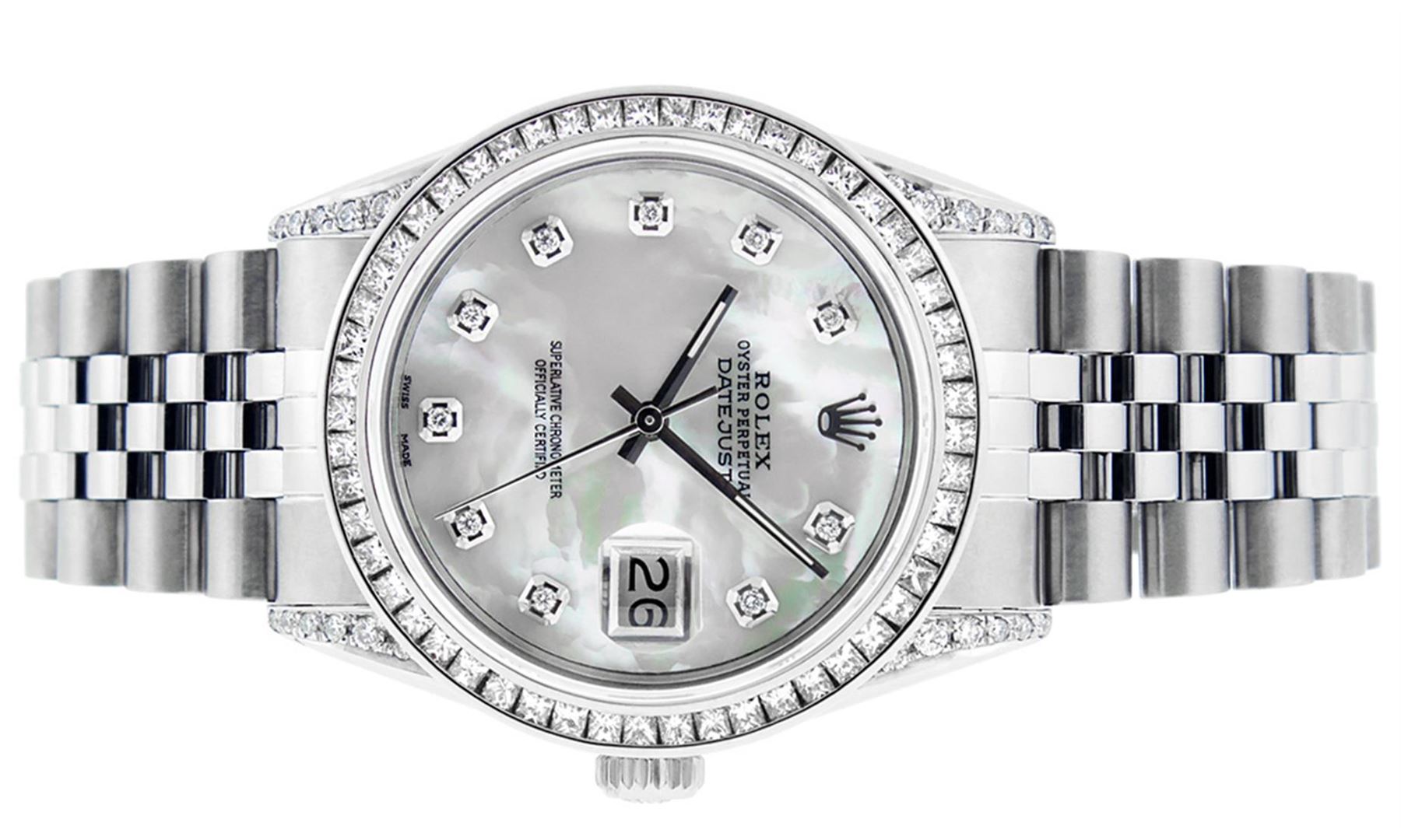 One Mens Rolex Datejust Polished Bright with Satin Finish, Serviced & Electronically Tested, Stainless Steel Case:36mm, Diamond Lugs: 24 Diamonds In Lugs, Color: G to H, Clarity: SI-VS. Stainless Steel Crown, Custom Bezel: 14K White Gold Princess Diamond Bezel, Diamond Count: 53 Diamonds, Total Weight 2.75 Carat, Clarity: SI-VS, Color: G to H. Custom Crystal: Synthetic Sapphire Cyclops Lens. Custom Hands: New Luminescent Hands. Movement: Automatic Winding Movement Caliber 3035. Custom Dial: Mother Of Pearl Diamond Dial, Diamond Color: G To H In Color, Clarity: SI-VS. Date Window: 3 O'Clock Position Date Display, Quickset, Model: Datejust Condition: G-6 Extra Fine. Bracelet: Stainless Steel Jubilee. Bright Polish & Satin Finish. 7.0 Inch Length, Adjustable. Standard Clasp, With Rolex Logo. This watch has been serviced and polished and its free of all dents and scratches and has been time tested.