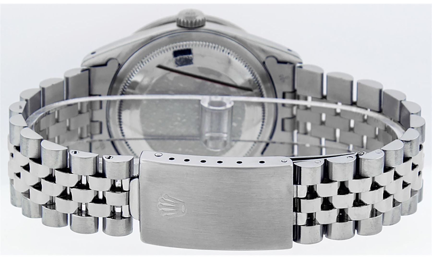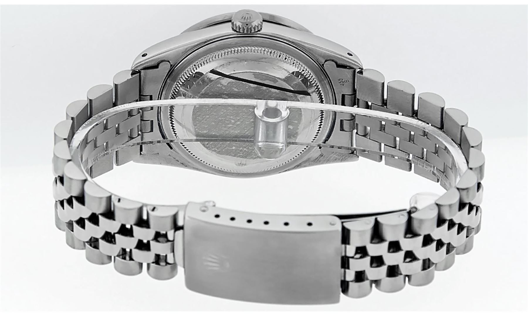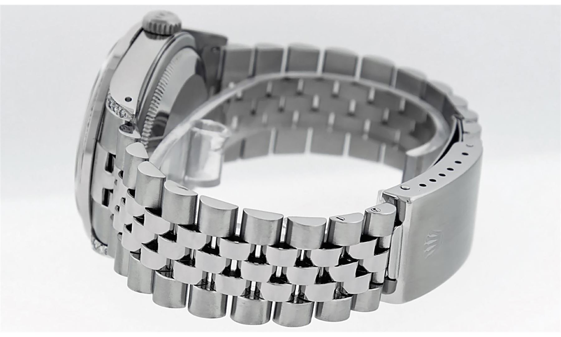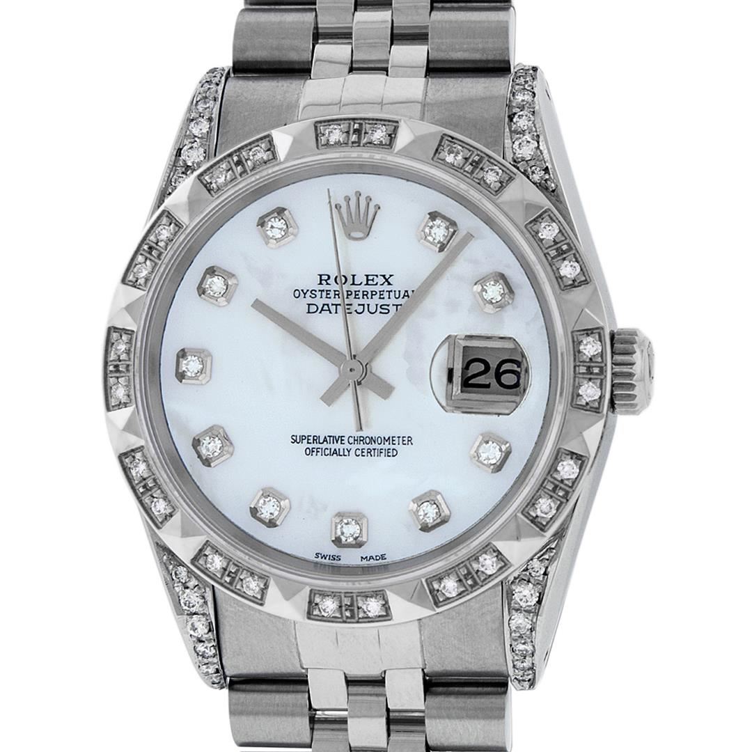 One Mens Rolex Datejust Polished Bright with Satin Finish, Serviced & Electronically Tested, Stainless Steel Case: 36mm, Custom Diamonds On Lugs: 28 Diamonds On Lugs, Color: G to H, Clarity: SI-VS. Stainless Steel Crown, Custom Bezel: 18K White Gold Pyramid Diamond Bezel, Diamond Count: 24 Diamonds On Bezel, Total Weight .75 Carat, Clarity: SI-VS, Color: G to H. Custom Crystal: New Scratch Resistant Synthetic Sapphire Cyclops Lens. Custom Hands: New Solid Hands. Movement: Automatic Winding Movement Caliber 3035. Custom Dial: Mother Of Pearl Diamond Dial, Diamond Count: 10 Diamonds In Dial, Diamond Color: G To H In Color, Clarity: SI-VS. Date Window: 3 O'Clock Position Date Display, Quickset, Model: Datejust Condition: G-6 Extra Fine. Bracelet: Stainless Steel Jubilee Band. Bright Polish & Satin Finish. 7.0 Inch Length, Adjustable. Standard Clasp, With Rolex Logo. This Watch Has Been Serviced And Polished And Its Free Of All Dents And Scratches.