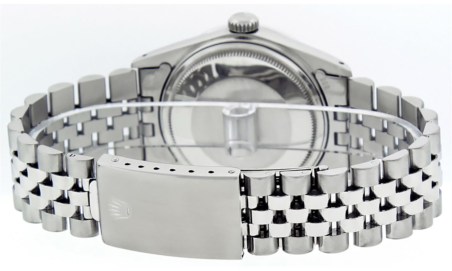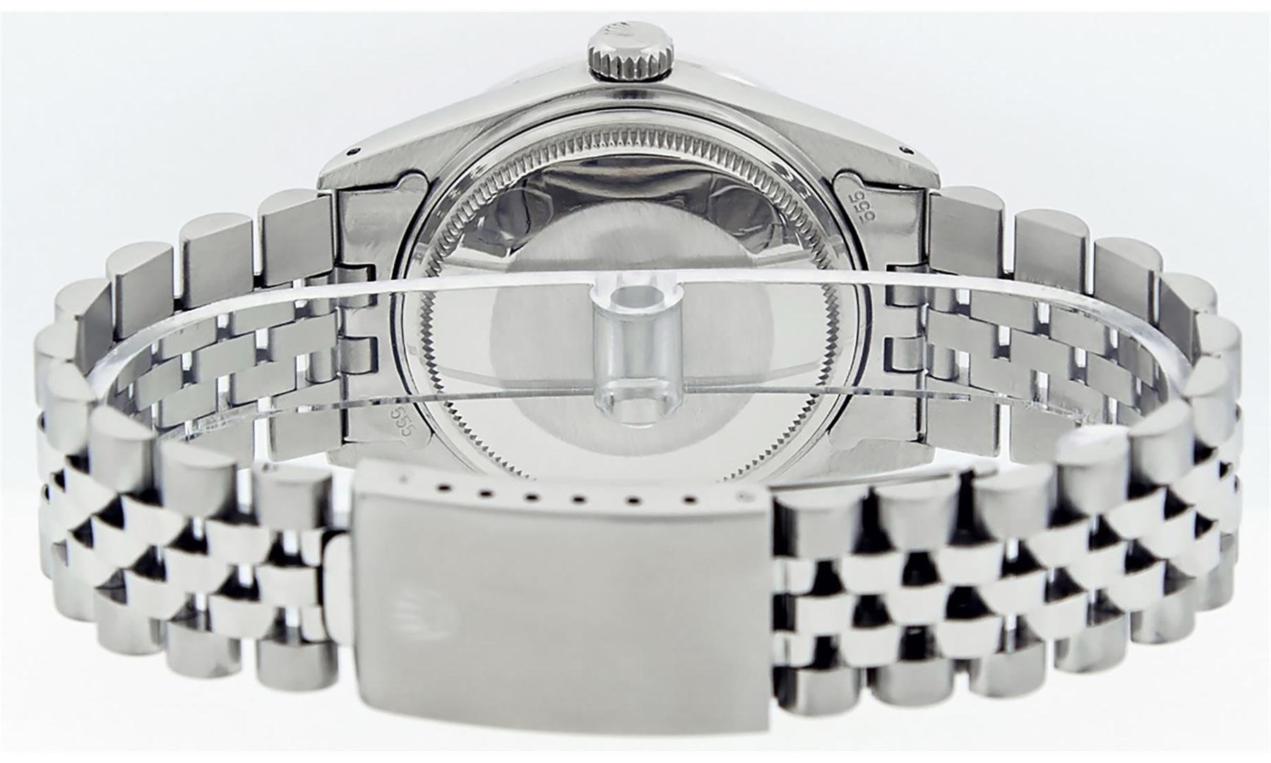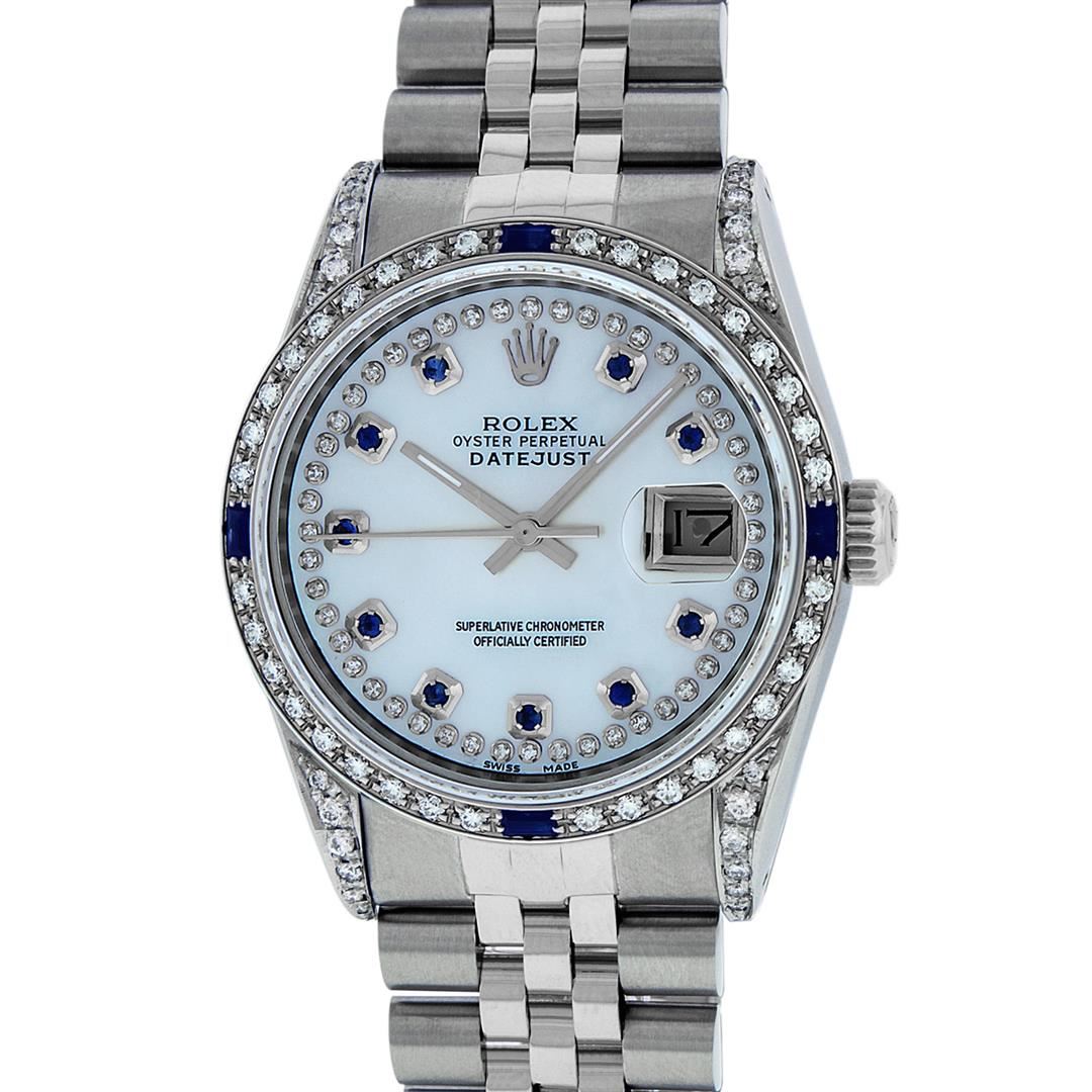 One Mens Rolex Datejust Polished Bright with Satin Finish, Serviced & Electronically Tested, Stainless Steel Case: 36mm, Custom Diamond Lugs: 28 Diamonds In Lugs, Color: G to H, Clarity: SI-VS. Stainless Steel Crown, Custom Bezel: 18K White Gold Diamond + Sapphire Beadset, Diamond Count: 36 Diamonds + 4 Sapphires, Total Weight 1.00 Carat, Clarity: SI-VS, Color: G to H. Custom Crystal: New Synthetic Sapphire Cyclops Lens. Custom Hands: New Luminescent Hands. Movement: Automatic Winding Movement Caliber 3035. Custom Dial: Mother Of Pearl String Diamond and Sapphire Dial, Stone Count: 10 Sapphires + 33 Diamonds, Diamond Color: G To H In Color, Clarity: SI-VS. Date Window: 3 O'Clock Position Date Display, Quickset, Model: Datejust Condition: G-6 Extra Fine. Bracelet: Stainless Steel Jubilee Band. Bright Polish & Satin Finish. 7.0 Inch Length, Adjustable. Standard Clasp, With Rolex Logo. This Watch Has Been Serviced And Polished And Its Free Of All Dents And Scratches.