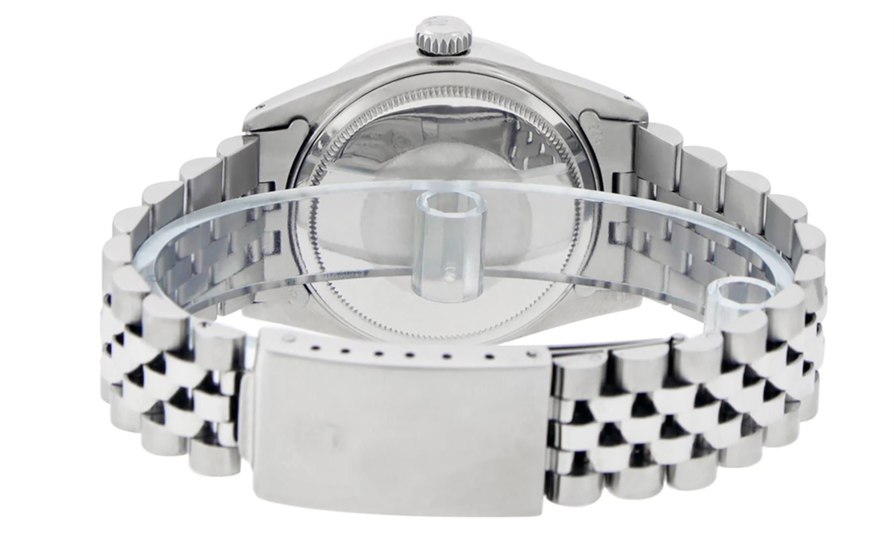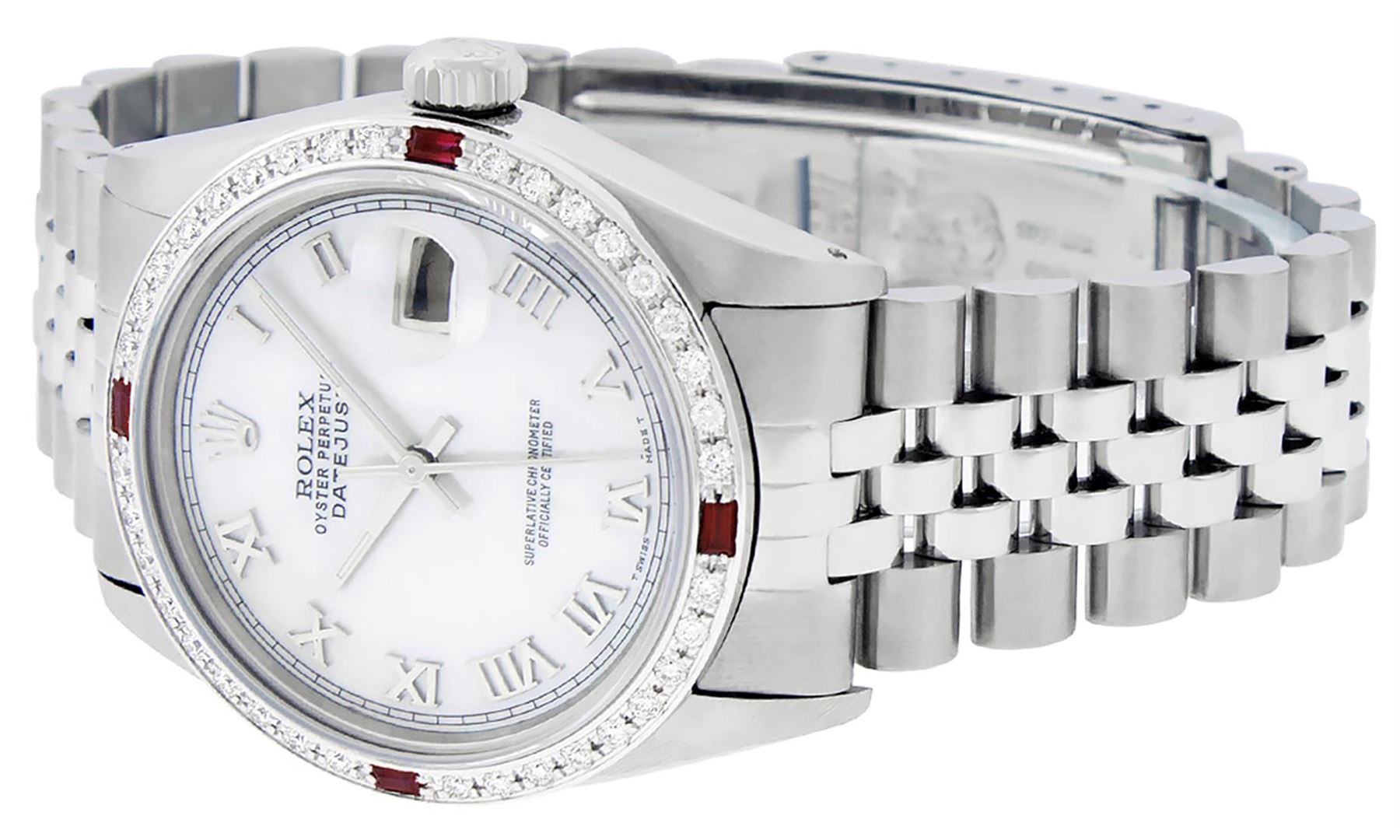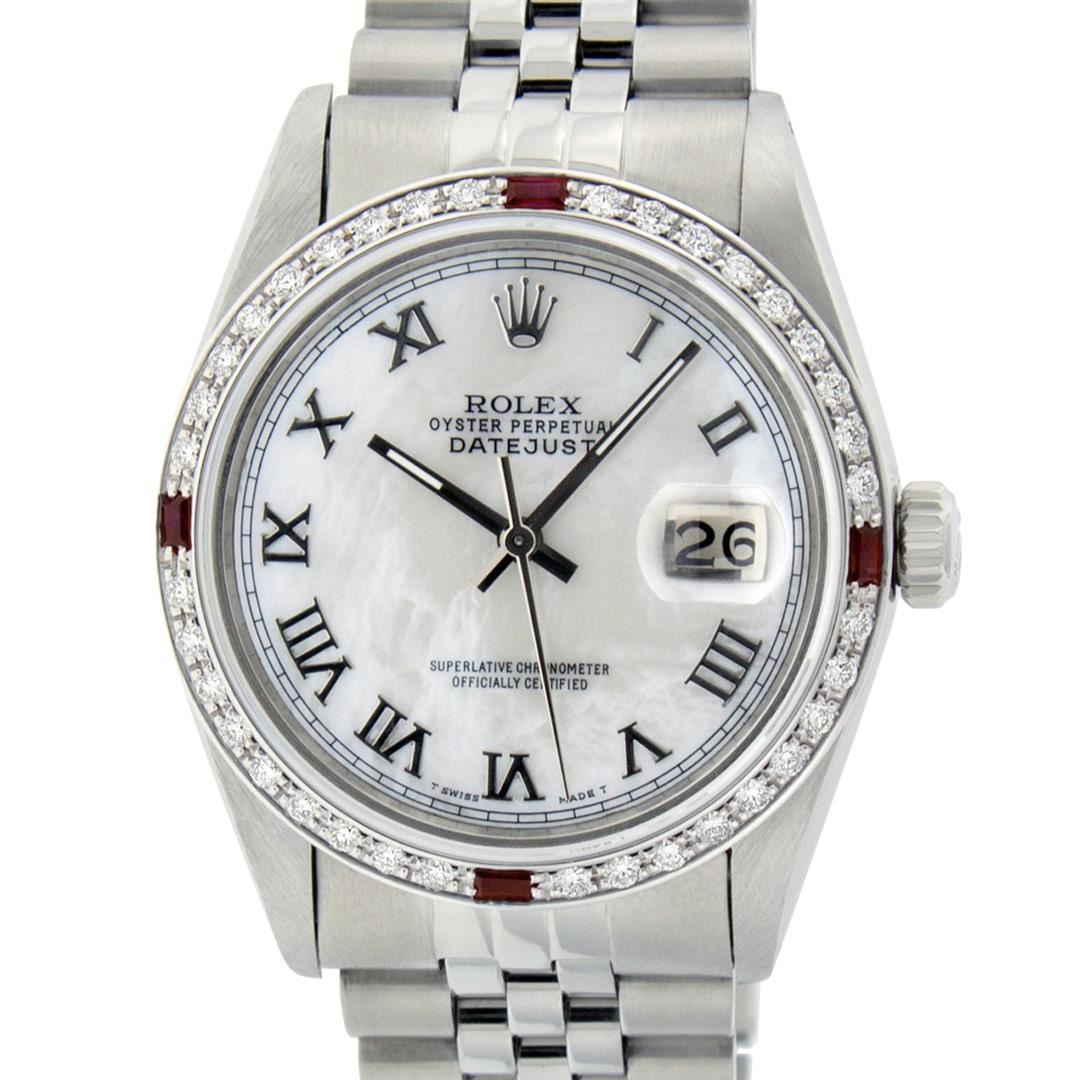One Mens Stainless Steel Rolex Datejust Polished Bright with Satin Finish, This Watch Has Been Serviced & Electronically Tested, Stainless Steel Case: 36mm, Stainless Steel Crown, Custom Bezel: New 18K White Gold Ruby Beadset Diamond Bezel, Diamond + Gem Count: 36 Diamonds + 4 Rubies, Total Weight 1.00 Carat, Clarity: SI-VS, Color: G to H. Custom Crystal: New Scratch Resistant Synthetic Sapphire Cyclops Lens. Custom Hands: New Luminescent Hands. Movement: Automatic Winding Movement Caliber 3035. Dial: Mother Of Pearl With Roman Track. Date Window: 3 O'Clock Position Date Display, Quickset, Model: Datejust, Condition: G-6 Extra Fine. Bracelet: Stainless Steel Jubilee. Bracelet: 7.0 Inch Length, Adjustable. Standard Clasp, With Rolex Logo. This Watch Has Been Serviced Time Tested And Is In Excellent Condition It Is Free Of All Scratches And Dents.