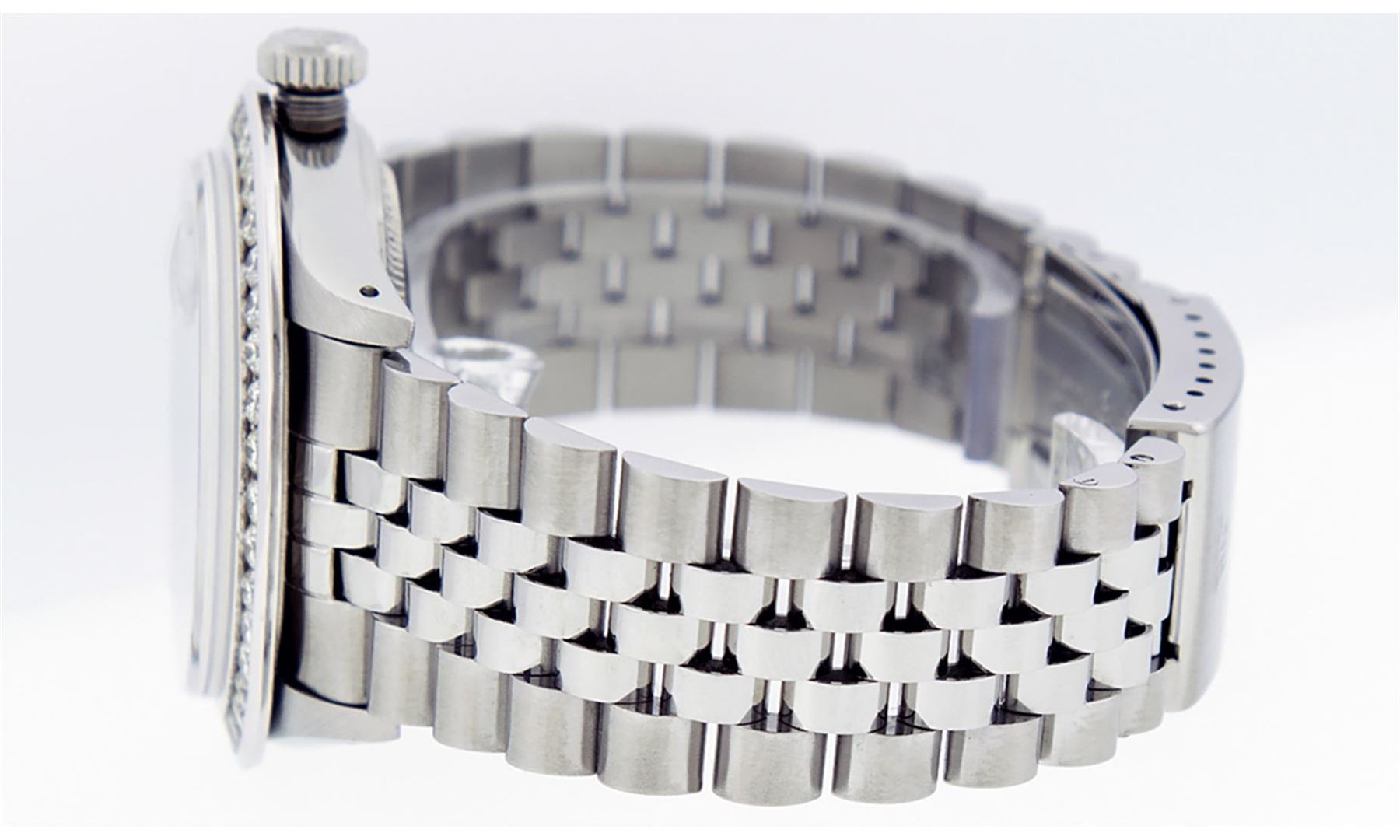 One Mens Rolex Datejust Polished Bright with Satin Finish, Serviced & Electronically Tested, Stainless Steel Case:36mm, Stainless Steel Crown, Custom Bezel: 18K White Gold 3ct Channel Set Diamond Bezel, Diamond Count: 40 Diamonds, Total Weight 3.00 Carat, Clarity: SI-VS, Color: G to H. Custom Crystal: Synthetic Sapphire Cyclops Lens. Movement: Automatic Winding Movement Caliber 3035. Custom Dial: Meteorite Diamond Dial, Diamond Count: 10 Diamonds In Dial, Diamond Color: G To H In Color, Clarity: SI-VS. Date Window: 3 O'Clock Position Date Display, Quickset, Model: Datejust Condition: G-6 Extra Fine. Bracelet: Stainless Steel Jubilee Band. Bright Polish & Satin Finish. 7.0 Inch Length, Adjustable. Standard Clasp, With Rolex Logo.