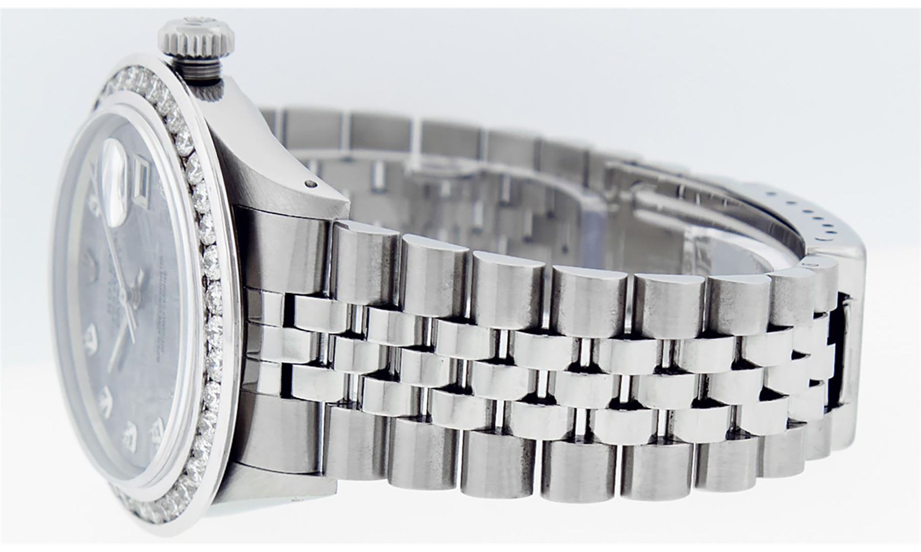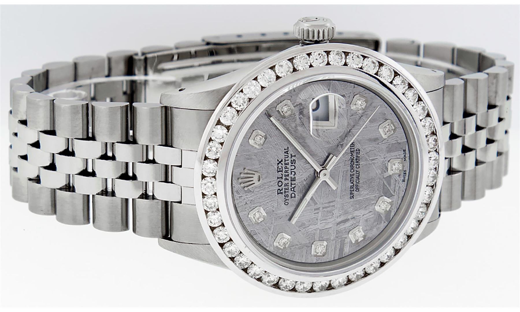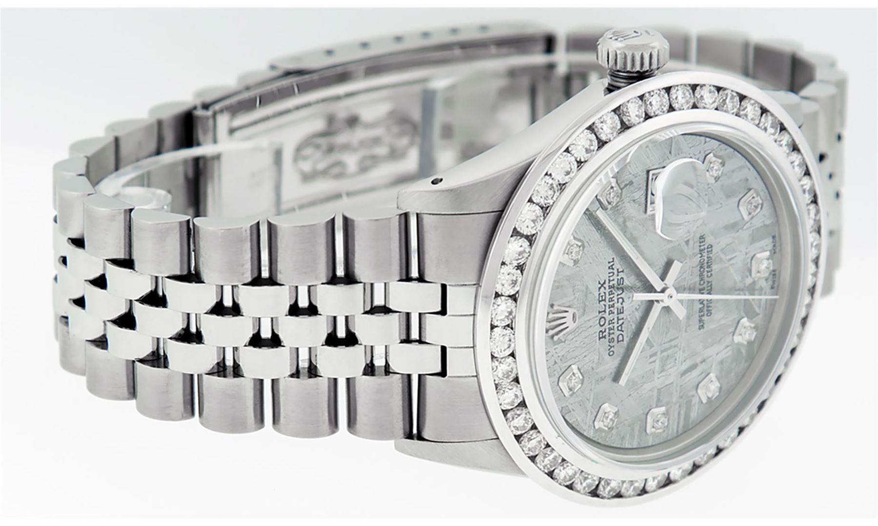 One Men's Stainless Steel Rolex Datejust Polished Bright with Satin Finish, Fully Serviced & Electronically Tested, Stainless Steel Case:36mm, Stainless Steel Crown, Custom Bezel: New 18K White Gold 3.00 Ctw Channel Set Diamond Bezel, Diamond Count: 40 Diamonds On Bezel, Total Weight 3.0 Carat, Clarity: SI-VS, Color: G to H. Custom Crystal: New Scratch Resistant Synthetic Sapphire Cyclops Lens. Custom Hands: New Luminescent Hands. Movement: Automatic Winding Movement Caliber 3035. Custom Refinished Dial: Meteorite Diamond Dial, 10 Diamonds in Dial, G To H In Color, Clarity: SI-VS. Date Window: 3 O'Clock Position Date Display, Quickset, Model: Datejust 36mm, Condition: G-6 Extra Fine. Bracelet: Rolex Stainless Steel Jubilee Band. Bright Polish & Satin Finish. 7.0 Inch Length, Adjustable. Standard Clasp, With Rolex Logo. Watch Has Been Serviced And Polished It Is Free Of All Scratches And Dents. This Watch Comes With A Rolex Box & Watch Winder.
