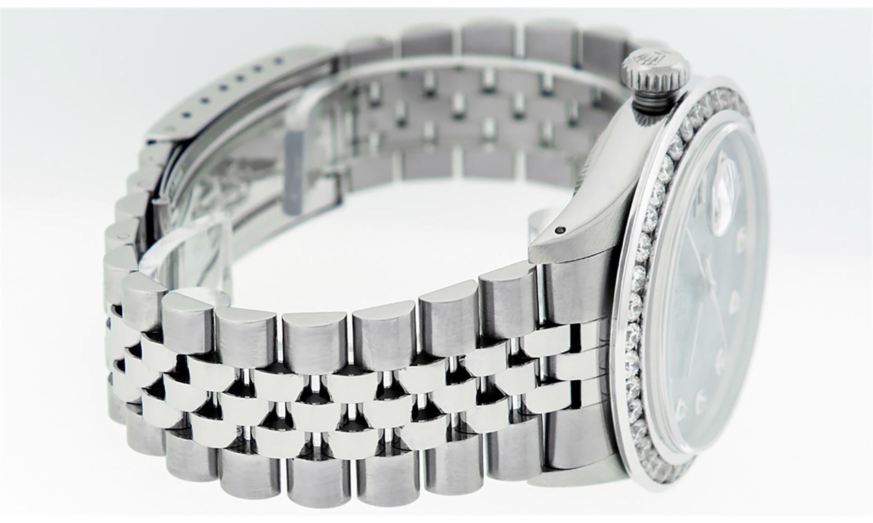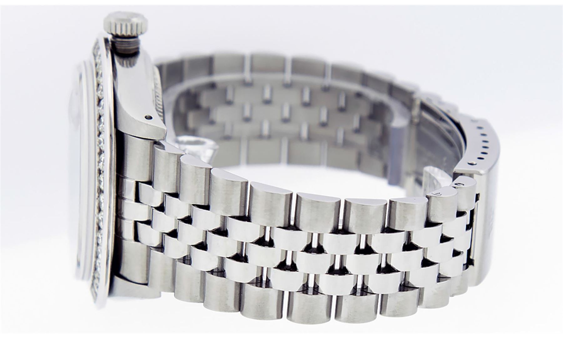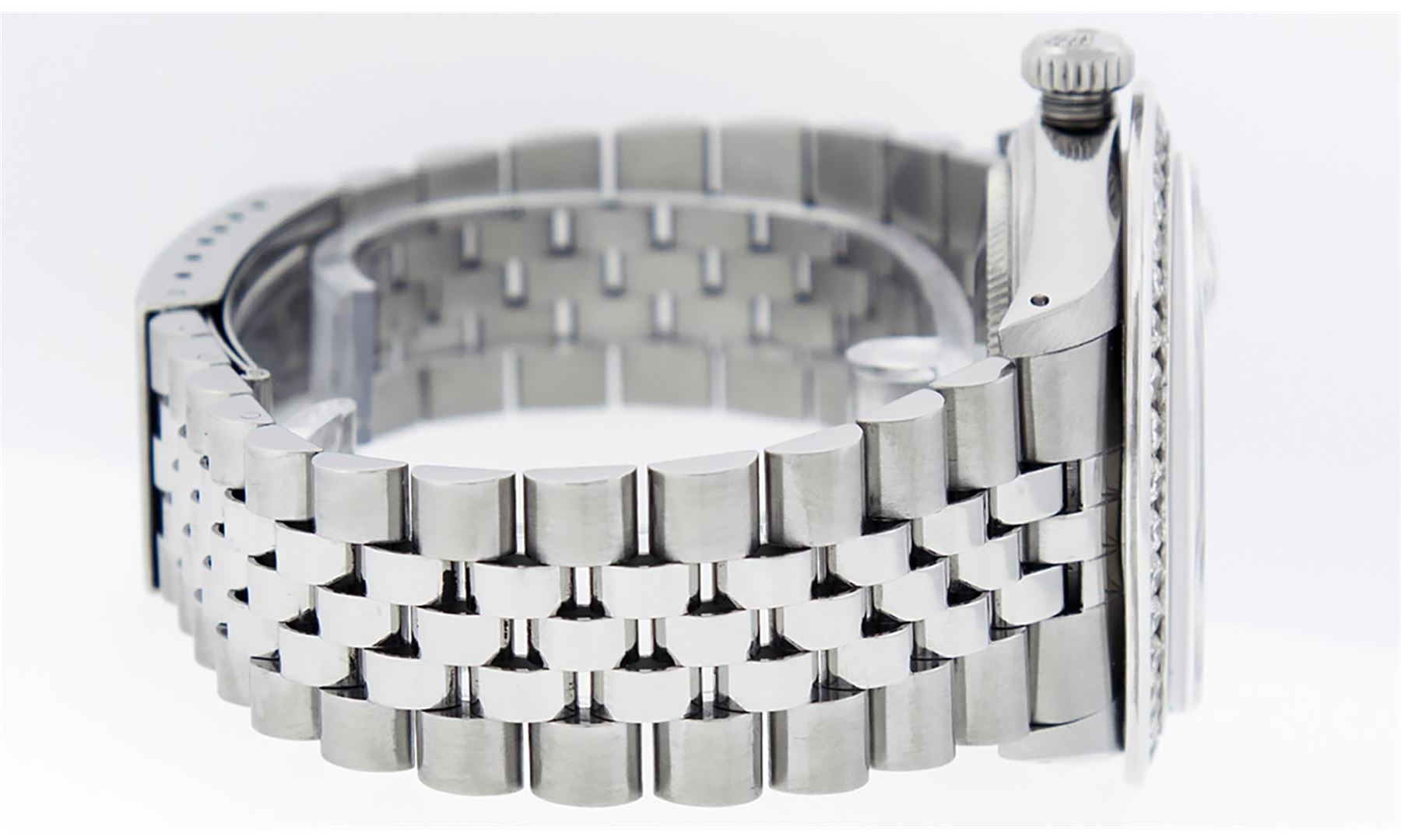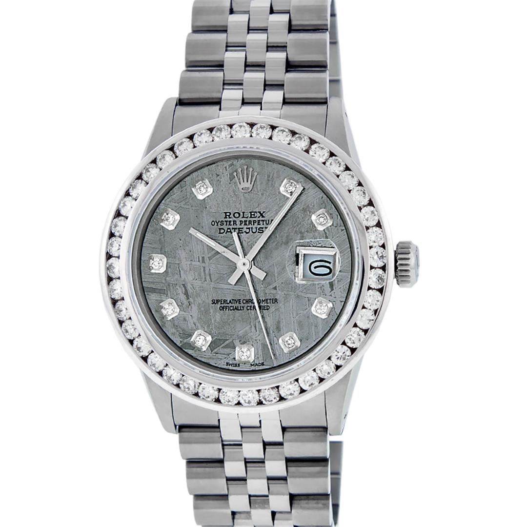 One Men's Stainless Steel Rolex Datejust Polished Bright with Satin Finish, Fully Serviced & Electronically Tested, Stainless Steel Case:36mm, Stainless Steel Crown, Custom Bezel: New 18K White Gold 3.00 Ctw Channel Set Diamond Bezel, Diamond Count: 40 Diamonds On Bezel, Total Weight 3.0 Carat, Clarity: SI-VS, Color: G to H. Custom Crystal: New Scratch Resistant Synthetic Sapphire Cyclops Lens. Custom Hands: New Luminescent Hands. Movement: Automatic Winding Movement Caliber 3035. Custom Refinished Dial: Meteorite Diamond Dial, 10 Diamonds in Dial, G To H In Color, Clarity: SI-VS. Date Window: 3 O'Clock Position Date Display, Quickset, Model: Datejust 36mm, Condition: G-6 Extra Fine. Bracelet: Rolex Stainless Steel Jubilee Band. Bright Polish & Satin Finish. 7.0 Inch Length, Adjustable. Standard Clasp, With Rolex Logo. Watch Has Been Serviced And Polished It Is Free Of All Scratches And Dents. This Watch Comes With A Rolex Box & Watch Winder.