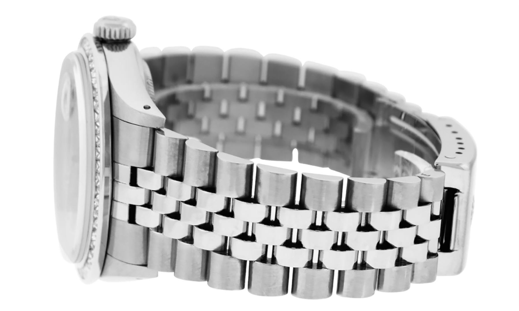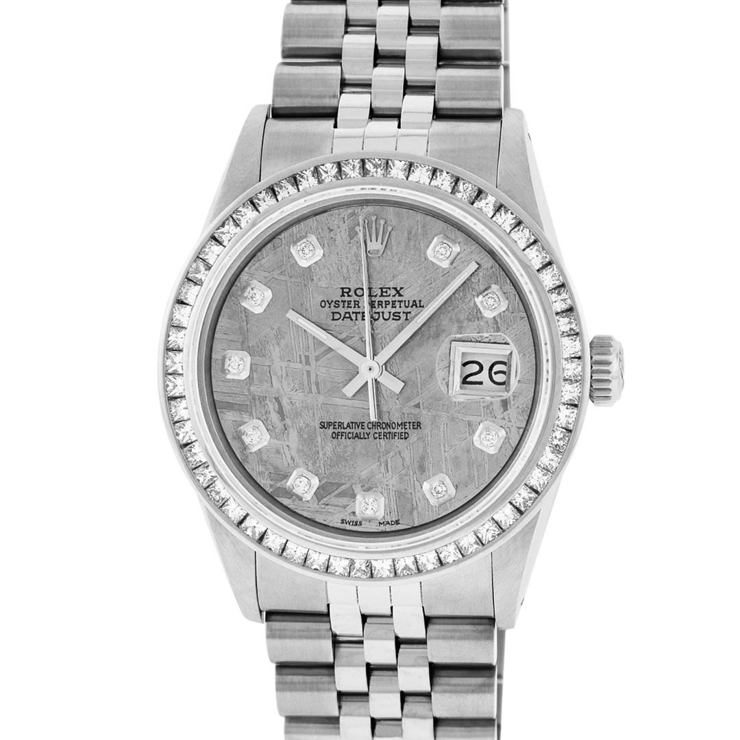 One Mens Stainless Steel Rolex Datejust Polished Bright with Satin Finish, Fully Serviced & Electronically Tested, Stainless Steel Case: 36mm, Stainless Steel Crown, Custom Bezel: New 14K White Gold 2.75 Carat Princess Cut Diamond Bezel, Diamond Count: 53 Diamonds, Total Weight 2.75 Carat, Clarity: SI-VS, Color: G to H. Custom Crystal: New Scratch Resistant Synthetic Sapphire Cyclops Lens. Custom Hands: New Luminecent Hands. Movement: Automatic Winding Movement Caliber 3035. Custom Dial: Meteorite Diamond Dial, 10 Diamonds in Dial, G To H In Color, Clarity: SI-VS. Date Window: 3 O'Clock Position Date Display, Quickset, Model: Datejust 36mm, Condition: G-6 Extra Fine. Bracelet: Rolex Stainless Steel Jubilee Band. Bright Polish & Satin Finish. 7.0 Inch Length, Adjustable. Standard Clasp, With Rolex Logo. Watch Has Been Serviced And Polished It Is Free Of All Scratches And Dents.