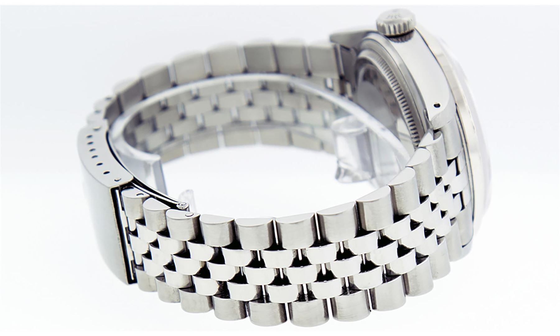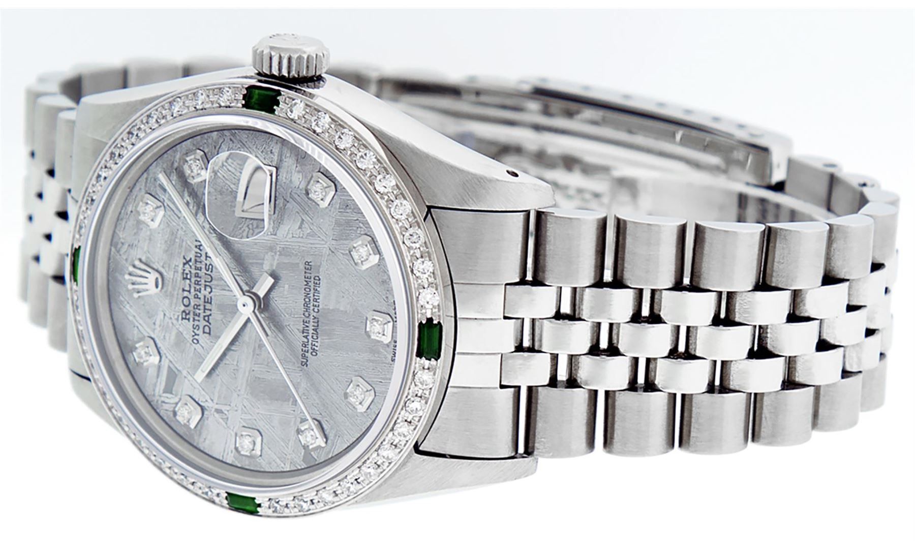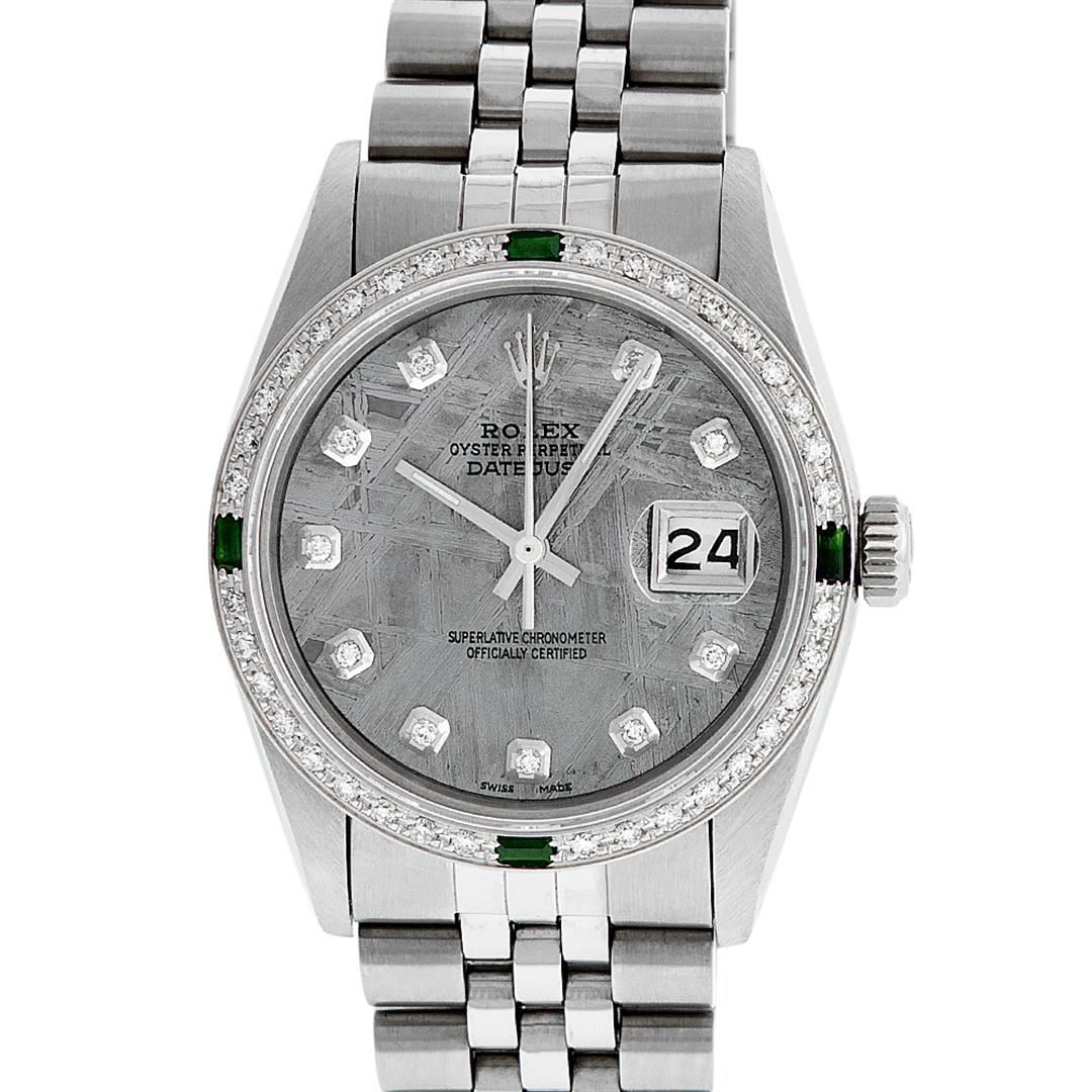 One Mens Stainless Steel Rolex Datejust Polished, Serviced & Electronically Tested, Stainless Steel Case: 36mm, Stainless Steel Crown, Custom Bezel: New 18K White Gold Emerald Beadset Diamond Bezel, Diamond + Gem Count: 36 Diamonds + 4 Emeralds, Total Weight 1.00 Carat, Clarity: SI-VS, Color: G to H. Custom Crystal: New Scratch Resistant Synthetic Sapphire Cyclops Lens. Custom Hands: New Luminescent Hands. Movement: Automatic Winding Movement Caliber 3035. Custom Dial: Meteorite With Diamond Hour Markers, 10 Diamonds In Dial, G To H In Color, Clarity: SI-VS. Date Window: 3 O'Clock Position Date Display, Quickset, Model: Datejust. Condition: G-6 Extra Fine. Bracelet: Stainless Steel Jubilee. Bright Polish & Satin Finish. 7.0 Inch Length, Adjustable. Standard Clasp, With Rolex Logo. This Watch Has Been Serviced Time Tested And Is In Excellent Condition It Is Free Of All Scratches And Dents