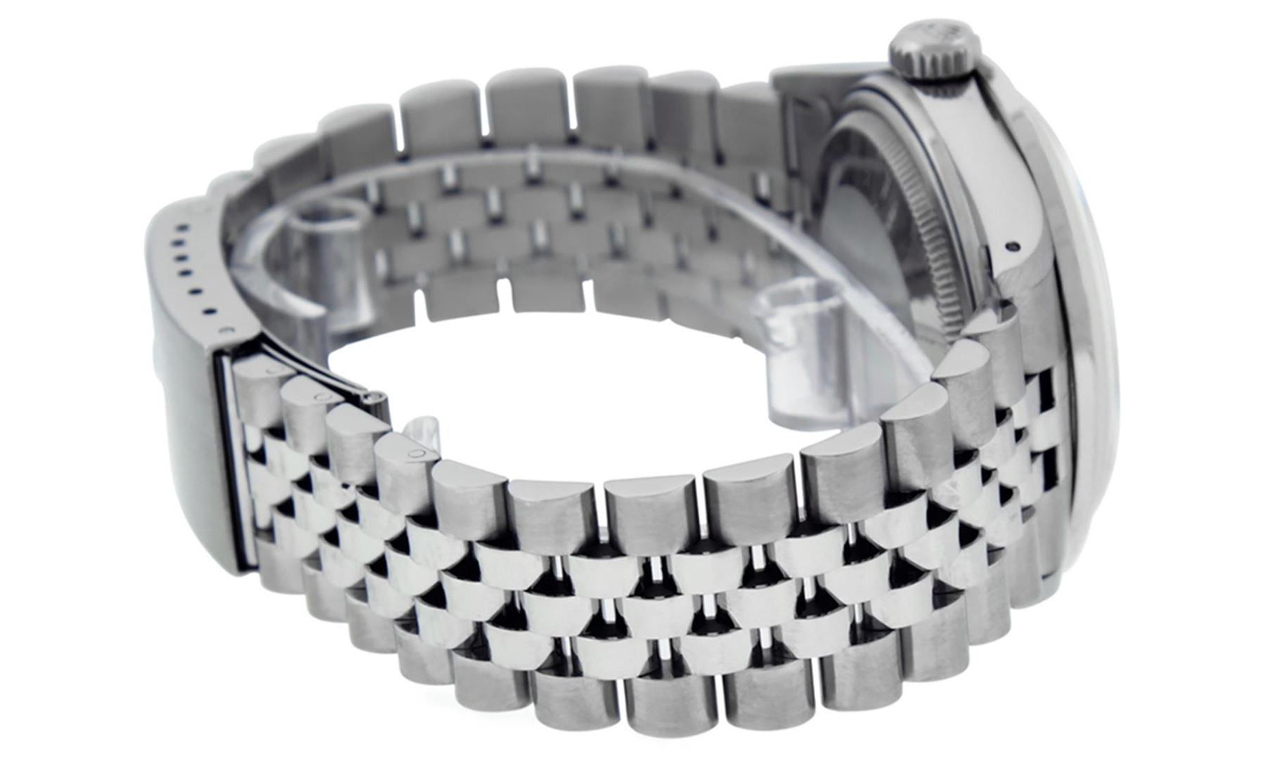One Mens Stainless Steel Rolex Datejust Polished Bright with Satin Finish, Fully Serviced & Electronically Tested, Stainless Steel Case:36mm, Stainless Steel Crown, Custom Bezel: 14K White Gold 2.75 Carat Princess Cut Diamond Bezel, Diamond Count: 53 Diamonds, Total Weight 2.75 Carat, Clarity: SI-VS, Color: G to H. Custom Crystal: New Synthetic Sapphire Cyclops Lens. Custom Hands: New Luminescent Hands. Movement: Automatic Winding Movement Caliber 3035. Custom Dial: Meteorite Diamond Dial, 10 Diamonds in Dial, G To H In Color, Clarity: SI-VS. Date Window: 3 O'Clock Position Date Display, Quickset, Model: Datejust 36mm, Condition: G-6 Extra Fine. Bracelet: Rolex Stainless Steel Jubilee Band. Bright Polish & Satin Finish. 7.0 Inch Length, Adjustable. Standard Clasp, With Rolex Logo. This watch has been serviced and polished and its free of all dents and scratches and has been time tested.