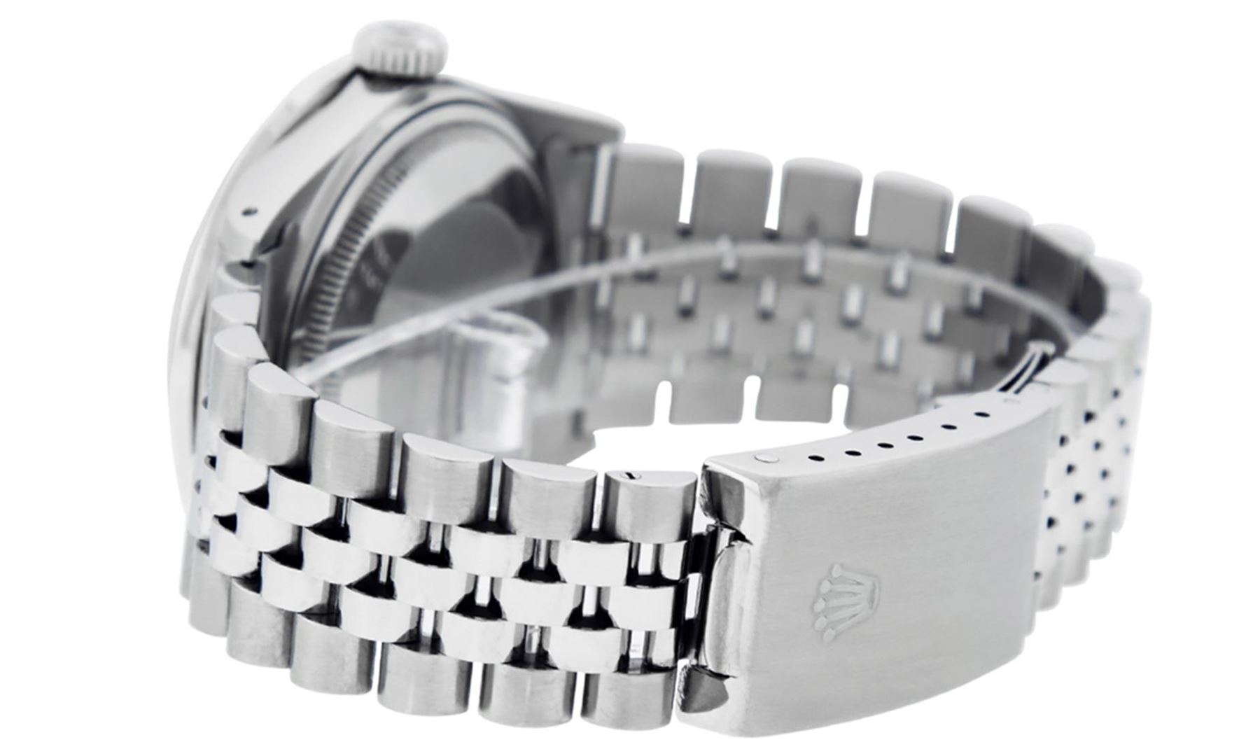 One Mens Stainless Steel Rolex Datejust Polished Bright with Satin Finish, Fully Serviced & Electronically Tested, Stainless Steel Case:36mm, Stainless Steel Crown, Custom Bezel: 14K White Gold 2.75 Carat Princess Cut Diamond Bezel, Diamond Count: 53 Diamonds, Total Weight 2.75 Carat, Clarity: SI-VS, Color: G to H. Custom Crystal: New Synthetic Sapphire Cyclops Lens. Custom Hands: New Luminescent Hands. Movement: Automatic Winding Movement Caliber 3035. Custom Dial: Meteorite Diamond Dial, 10 Diamonds in Dial, G To H In Color, Clarity: SI-VS. Date Window: 3 O'Clock Position Date Display, Quickset, Model: Datejust 36mm, Condition: G-6 Extra Fine. Bracelet: Rolex Stainless Steel Jubilee Band. Bright Polish & Satin Finish. 7.0 Inch Length, Adjustable. Standard Clasp, With Rolex Logo. This watch has been serviced and polished and its free of all dents and scratches and has been time tested.