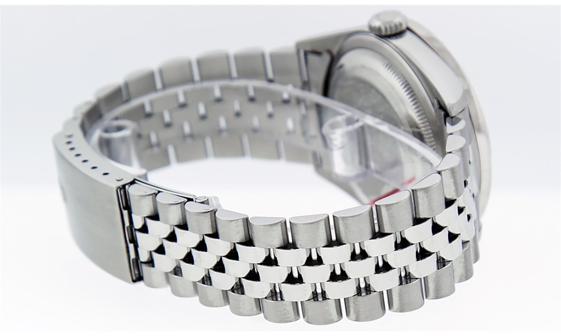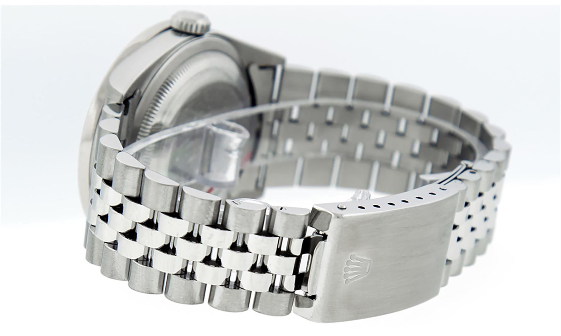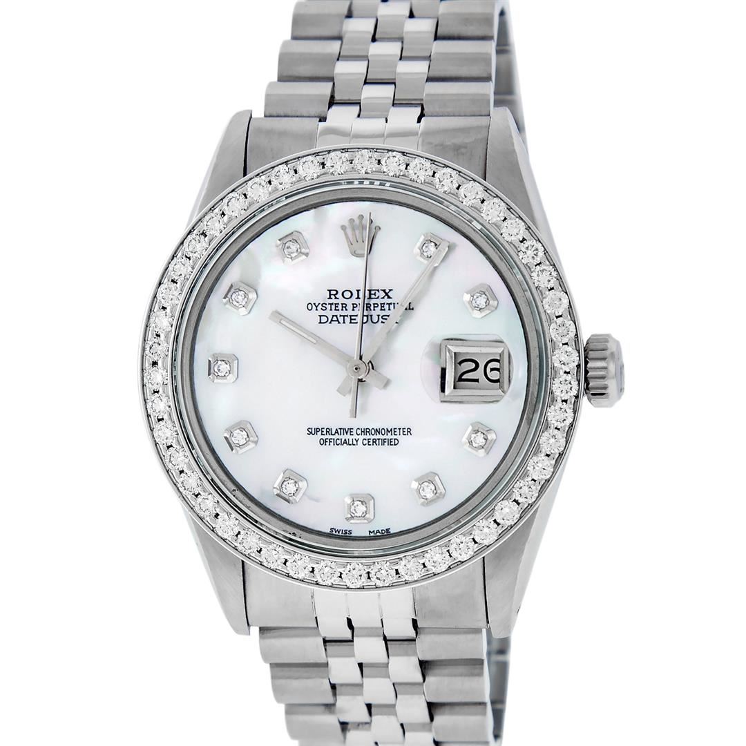 One Mens Rolex Stainless Steel Datejust Polished Bright with Satin Finish, This Watch Has Been Serviced & Electronically Tested, Stainless Steel Case: 36mm, Stainless Steel Crown, Custom Bezel: New Stainless Steel Beadset Diamond Bezel, Diamond Count: 54 Diamonds In Bezel, Total Weight 1.00 Carat, Clarity: SI-VS, Color: G to H. Custom Crystal: New Scratch Resistant Synthetic Sapphire Cyclops Lens. Custom Hands: New Luminescent Hands. Movement: Automatic Winding Movement Caliber 3035. Custom Dial: Mother Of Pearl Diamond Dial, Diamond Count: 10 Diamonds On Dial, Color: G to H, Clarity: VS2-SI1. Date Window: 3 O'Clock Position Date Display, Quickset, Model: Datejust. Condition: G-6 Extra Fine. Bracelet: Stainless Steel Jubilee Band. Bright Polish & Satin Finish. 7.0 Inch Length, Adjustable. Standard Clasp, With Rolex Logo. This Watch Has Been Serviced Time Tested And Is In Excellent Condition It Is Free Of All Scratches And Dents.