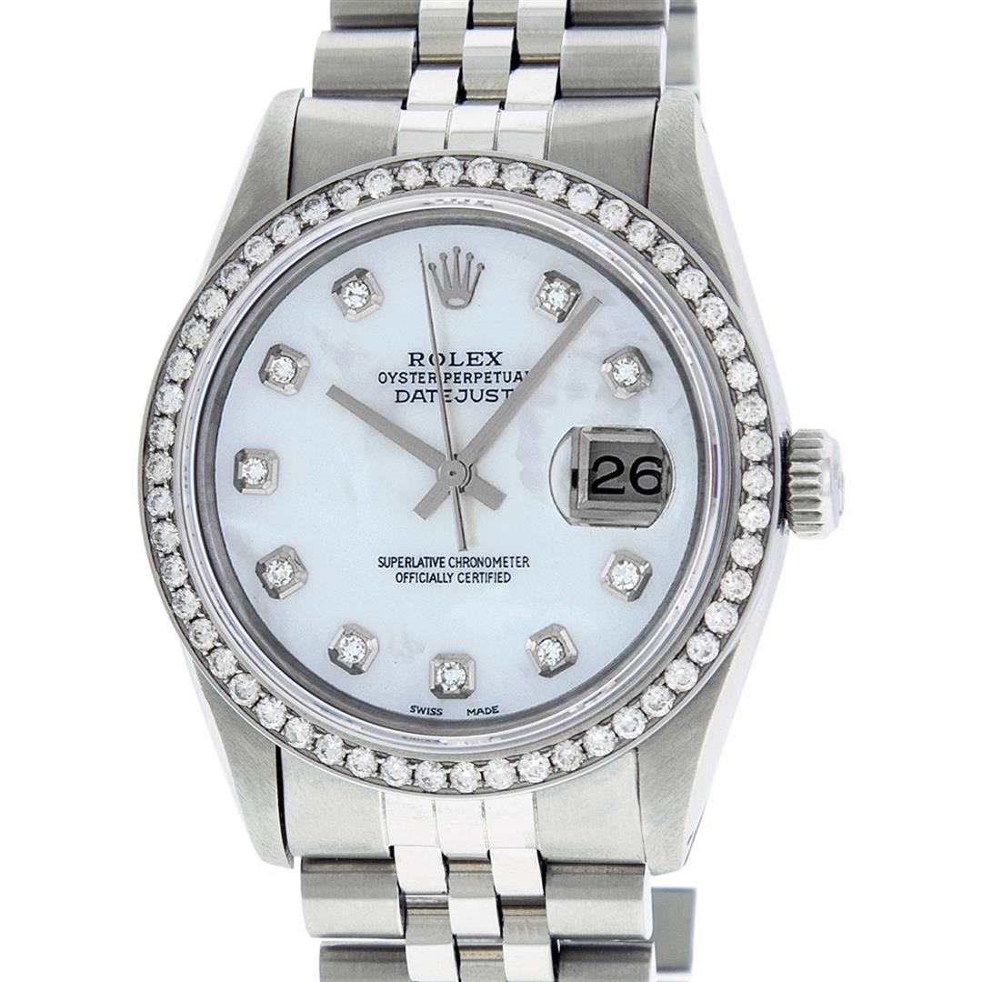 One Mens Rolex Stainless Steel Datejust Polished Bright with Satin Finish, This Watch Has Been Serviced & Electronically Tested, Stainless Steel Case: 36mm, Stainless Steel Crown, Custom Bezel: New Stainless Steel Beadset Diamond Bezel, Diamond Count: 54 Diamonds In Bezel, Total Weight 1.00 Carat, Clarity: SI-VS, Color: G to H. Custom Crystal: New Synthetic Sapphire Cyclops Lens. Custom Hands: New Luminescent Hands. Movement: Automatic Winding Movement Caliber 3035. Custom Dial: Mother Of Pearl Diamond Dial, Diamond Count: 10 Diamonds On Dial, Color: G to H, Clarity: VS2-SI1. Date Window: 3 O'Clock Position Date Display, Quickset, Model: Datejust. Condition: G-6 Extra Fine. Bracelet: Stainless Steel Jubilee Band. Bright Polish & Satin Finish. 7.0 Inch Length, Adjustable. Standard Clasp, With Rolex Logo. This Watch Has Been Serviced Time Tested And Is In Excellent Condition It Is Free Of All Scratches And Dents.