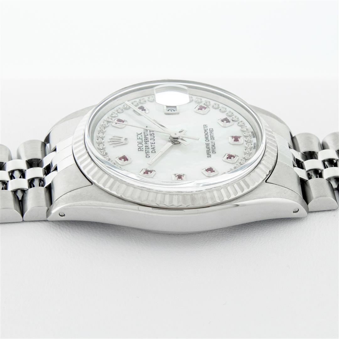 One Men's Stainless Steel Rolex Datejust Polished Bright with Satin Finish, Serviced & Electronically Tested, Stainless Steel Case: 36mm, Stainless Steel Crown, Original Bezel: 14K White Gold Fluted Bezel. Custom Crystal: New Acrylic Cyclops Lens. Custom Hands: New Luminescent Hands. Movement: Automatic Winding Movement Caliber 3035. Custom Dial: Mother Of Pearl Ruby String Diamond Dial, Stone Count: 10 Rubies + 48 Diamonds On Dial, G To H In Color, SI-VS Clarity. Date Window: 3 O'Clock Position Date Display, Quickset, Model: Datejust, Condition: G-6 Extra Fine. Bracelet: Stainless Steel Jubilee. Bright Polish & Satin Finish.�7.0 Inch Length, Adjustable. Standard Clasp, With Rolex Logo. Watch Has Been Serviced And Polished It Is Free Of All Scratches And Dents.