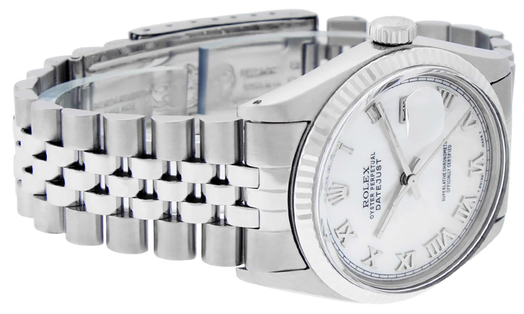 One Mens Pre Owned Stainless Steel Rolex Datejust Polished Bright with Satin Finish, Serviced & Electronically Tested, Rolex Stainless Steel Case: 36mm, Rolex Stainless Steel Crown, Rolex Bezel: 14K White Gold Fluted Bezel. Custom Crystal: New Acrylic Cyc