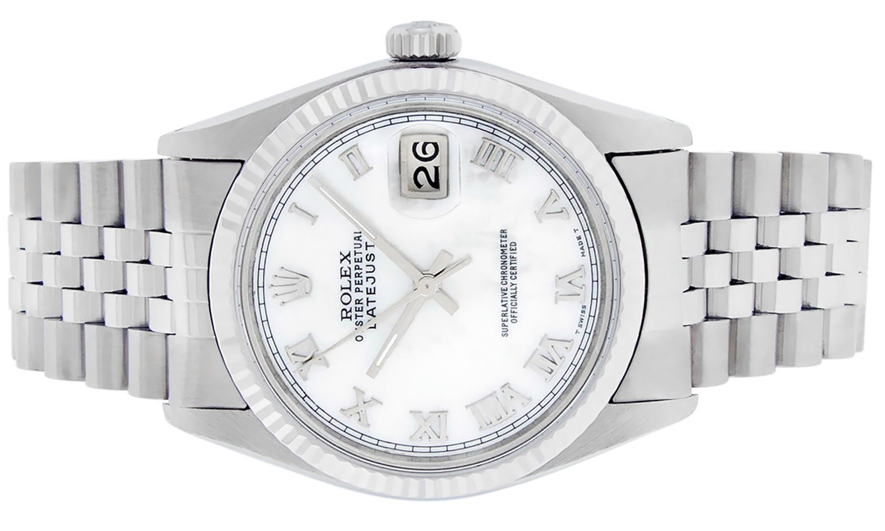 One Mens Pre Owned Stainless Steel Rolex Datejust Polished Bright with Satin Finish, Serviced & Electronically Tested, Rolex Stainless Steel Case: 36mm, Rolex Stainless Steel Crown, Rolex Bezel: 14K White Gold Fluted Bezel. Custom Crystal: New Acrylic Cyc