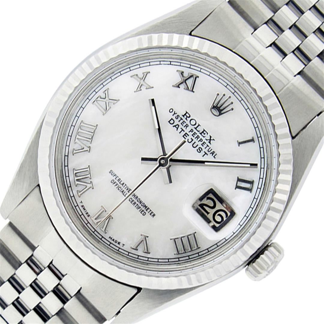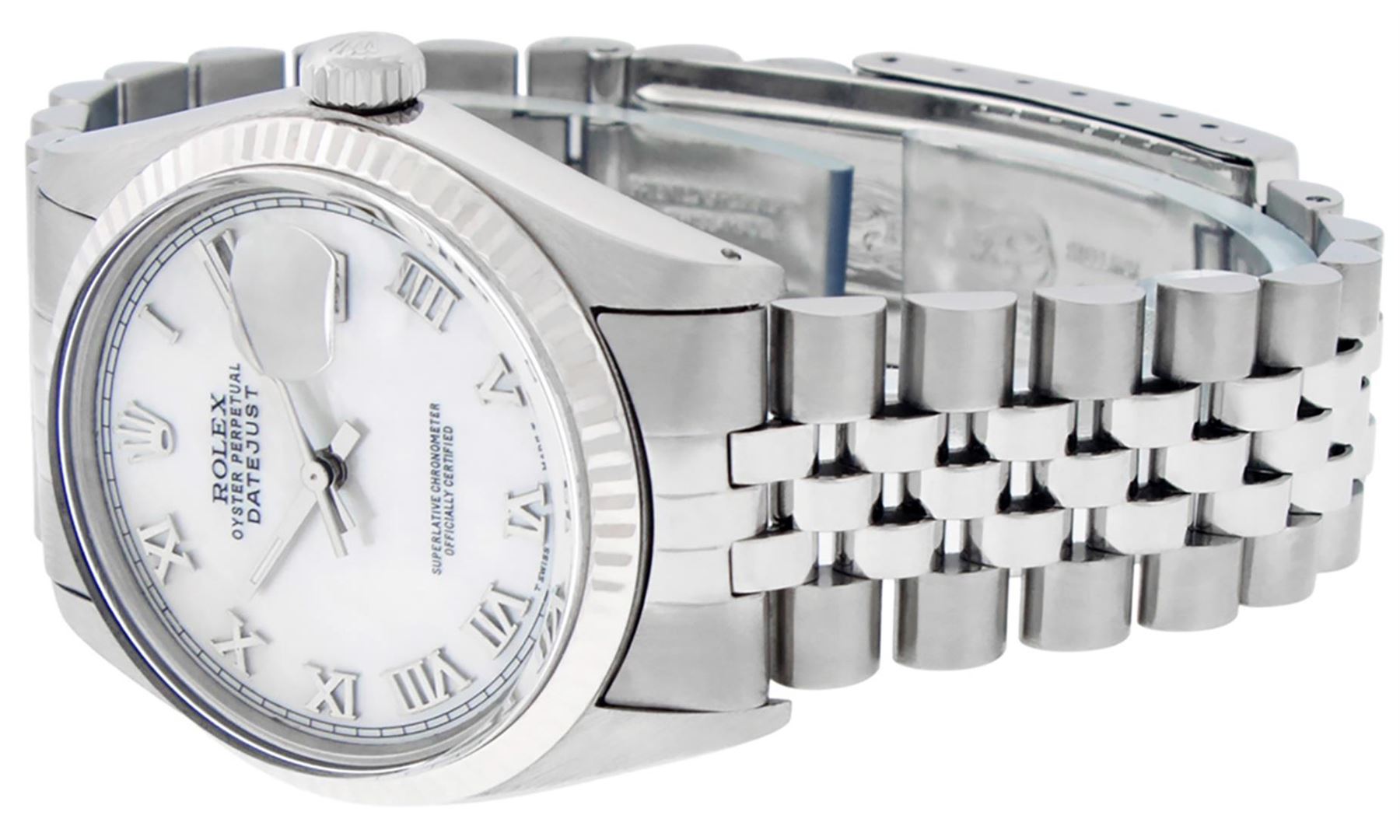 One Mens Pre Owned Stainless Steel Rolex Datejust Polished Bright with Satin Finish, Serviced & Electronically Tested, Rolex Stainless Steel Case: 36mm, Rolex Stainless Steel Crown, Rolex Bezel: 14K White Gold Fluted Bezel. Custom Crystal: New Acrylic Cyc