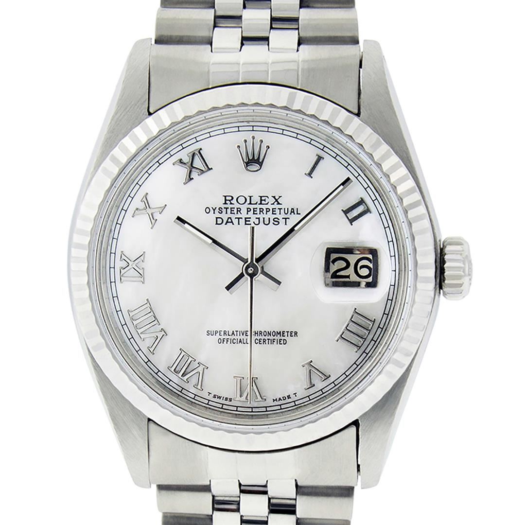 One Mens Pre Owned Stainless Steel Rolex Datejust Polished Bright with Satin Finish, Serviced & Electronically Tested, Rolex Stainless Steel Case: 36mm, Rolex Stainless Steel Crown, Rolex Bezel: 14K White Gold Fluted Bezel. Custom Crystal: New Acrylic Cyc
