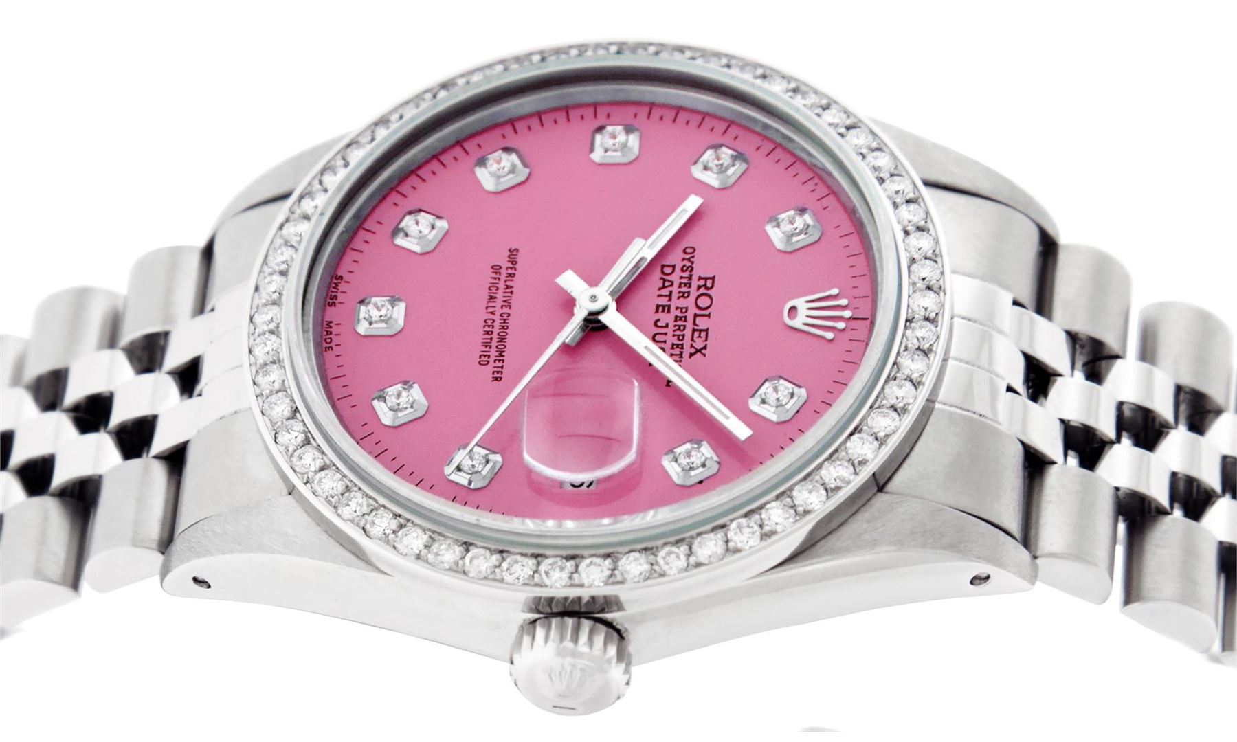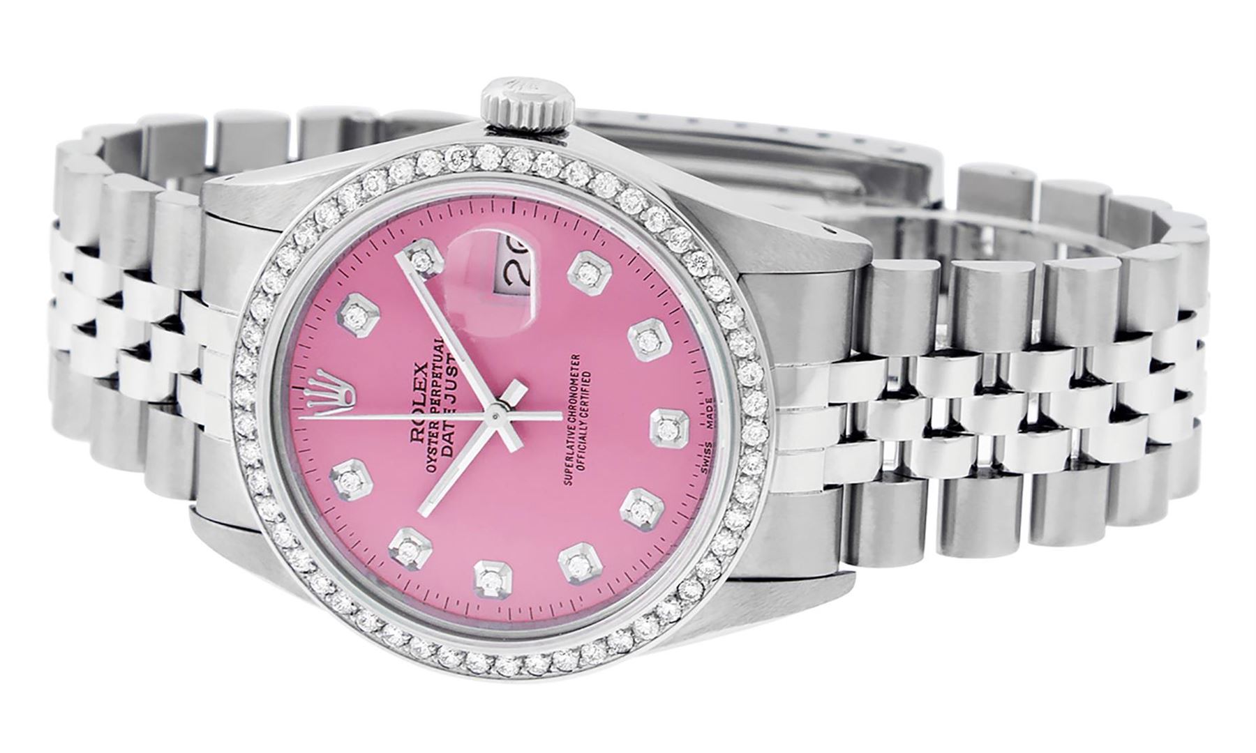 One Mens Rolex Stainless Steel Datejust Polished Bright with Satin Finish, This Watch Has Been Serviced & Electronically Tested, Stainless Steel Case: 36mm, Stainless Steel Crown, Custom Bezel: New Stainless Steel Beadset Diamond Bezel, Diamond Count: 54 Diamonds In Bezel, Total Weight 1.00 Carat, Clarity: SI-VS, Color: G to H. Custom Crystal: New Scratch Resistant Synthetic Sapphire Cyclops Lens. Custom Hands: New Luminescent Hands. Movement: Automatic Winding Movement Caliber 3035. Custom Dial: Pink Diamond Dial With Dash Track, Diamond Count: 10 Diamonds On Dial, Color: G to H, Clarity: VS2-SI1. Date Window: 3 O'Clock Position Date Display, Quickset, Model: Datejust. Condition: G-6 Extra Fine. Bracelet: Stainless Steel Jubilee Band. Bright Polish & Satin Finish. 7.0 Inch Length, Adjustable. Standard Clasp, With Rolex Logo. This Watch Has Been Serviced Time Tested And Is In Excellent Condition It Is Free Of All Scratches And Dents.