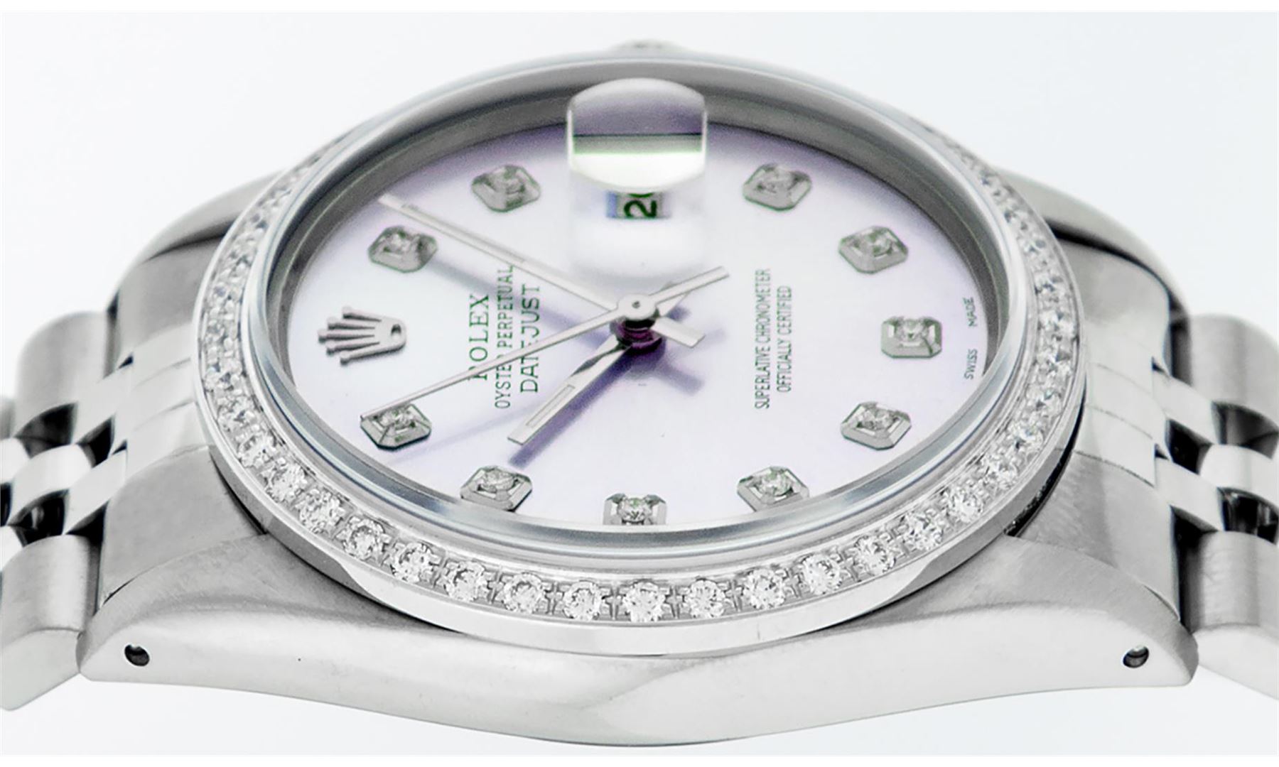 One Mens Stainless Steel Rolex Datejust Polished, Serviced & Electronically Tested, Stainless Steel Case: 36mm, Stainless Steel Crown, Custom Bezel: New 18K White Gold Beadset Diamond Bezel, Diamond Count: 44 Diamonds In Bezel, Total Weight 1.00 Carat, Clarity: SI-VS, Color: G to H. Custom Crystal: New Scratch Resistant Synthetic Sapphire Cyclops Lens. Custom Hands: New Luminescent Hands. Movement: Automatic Winding Movement Caliber 3035. Custom Dial: Purple Diamond Dial, Diamond Count: 10 Diamonds in Dial, G To H In Color, Clarity: SI-VS. Date Window: 3 O'Clock Position Date Display, Quickset, Model: Datejust. Condition: G-6 Extra Fine. Bracelet: Stainless Steel Jubilee Band. Bright Polish & Satin Finish. 7.0 Inch Length, Adjustable. Standard Clasp, With Rolex Logo. This Watch Has Been Serviced Time Tested And Is In Excellent Condition It Is Free Of All Scratches And Dents.