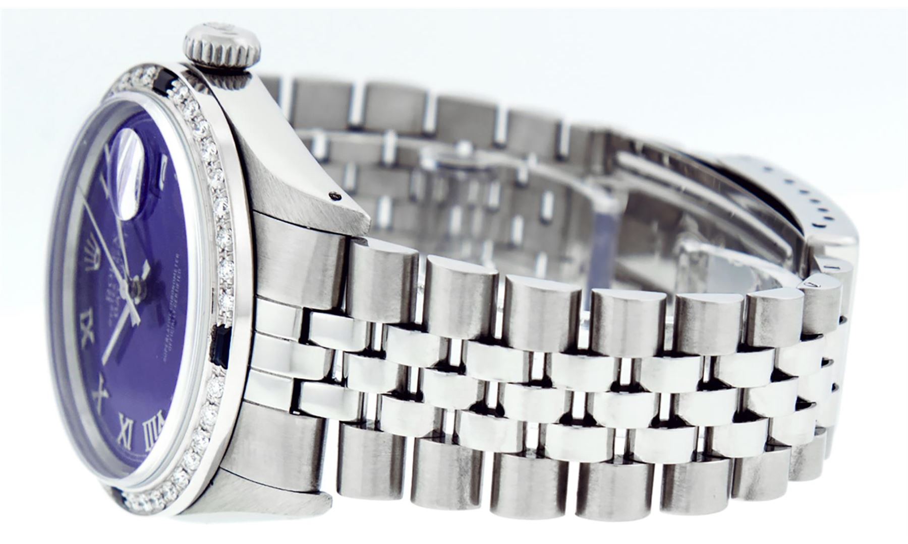 One Mens Stainless Steel Rolex Datejust Polished Bright with Satin Finish, This Watch Has Been Serviced & Electronically Tested, Stainless Steel Case: 36mm, Stainless Steel Crown, Custom Bezel: New 18K White Gold Sapphire Beadset Diamond Bezel, Diamond + Gem Count: 36 Diamonds + 4 Sapphires, Total Weight 1.00 Carat, Clarity: SI-VS, Color: G to H. Custom Crystal: New Scratch Resistant Synthetic Sapphire Cyclops Lens. Custom Hands: New Luminescent Hands. Movement: Automatic Winding Movement Caliber 3035. Custom Dial: Purple With Roman Hour Marker & Square Track. Date Window: 3 O'Clock Position Date Display, Quickset, Model: Datejust, Condition: G-6 Extra Fine. Bracelet: Stainless Steel Jubilee Band. Bracelet: 7.0 Inch Length, Adjustable. Standard Clasp, With Rolex Logo. This Watch Has Been Serviced Time Tested And Is In Excellent Condition It Is Free Of All Scratches And Dents.