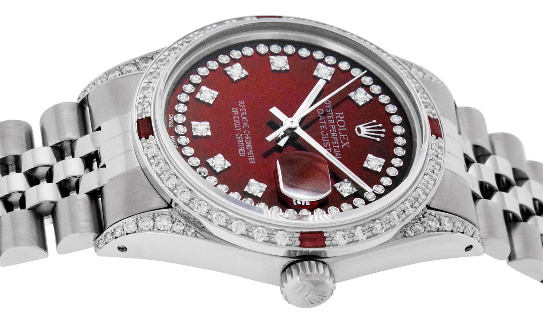 One Mens Pre Owned Stainless Steel Rolex Datejust Polished Bright with Satin Finish, Serviced And Electronically Tested, Rolex Stainless Steel Case: 36mm, Custom Diamond Lugs: 28 Added Diamonds On Lugs. Rolex Stainless Steel Crown, Custom Bezel: New 18K White Gold Diamond + Ruby Beadset, Diamond Count: 36 Diamonds + 4 Rubies. Custom Crystal: New Sapphire With Date Window. Custom Hands: New Luminescent Hands. Rolex Movement: Automatic Winding Movement 3035. Custom Dial: Custom Red Dial With Custom Added Diamonds, Stone Count: 43 Diamonds On Dial. Date Window: 3 O'Clock Position Date Display, Quickset, Model: Datejust. Condition: G-6 Extra Fine. Rolex Bracelet: Stainless Steel Jubilee Band. Bright Polish And Satin Finish. 7.0 Inch Length, Adjustable. Standard Clasp, With Rolex Logo. This Watch Has Been Serviced And Polished And Its Free Of All Dents And Scratches.
