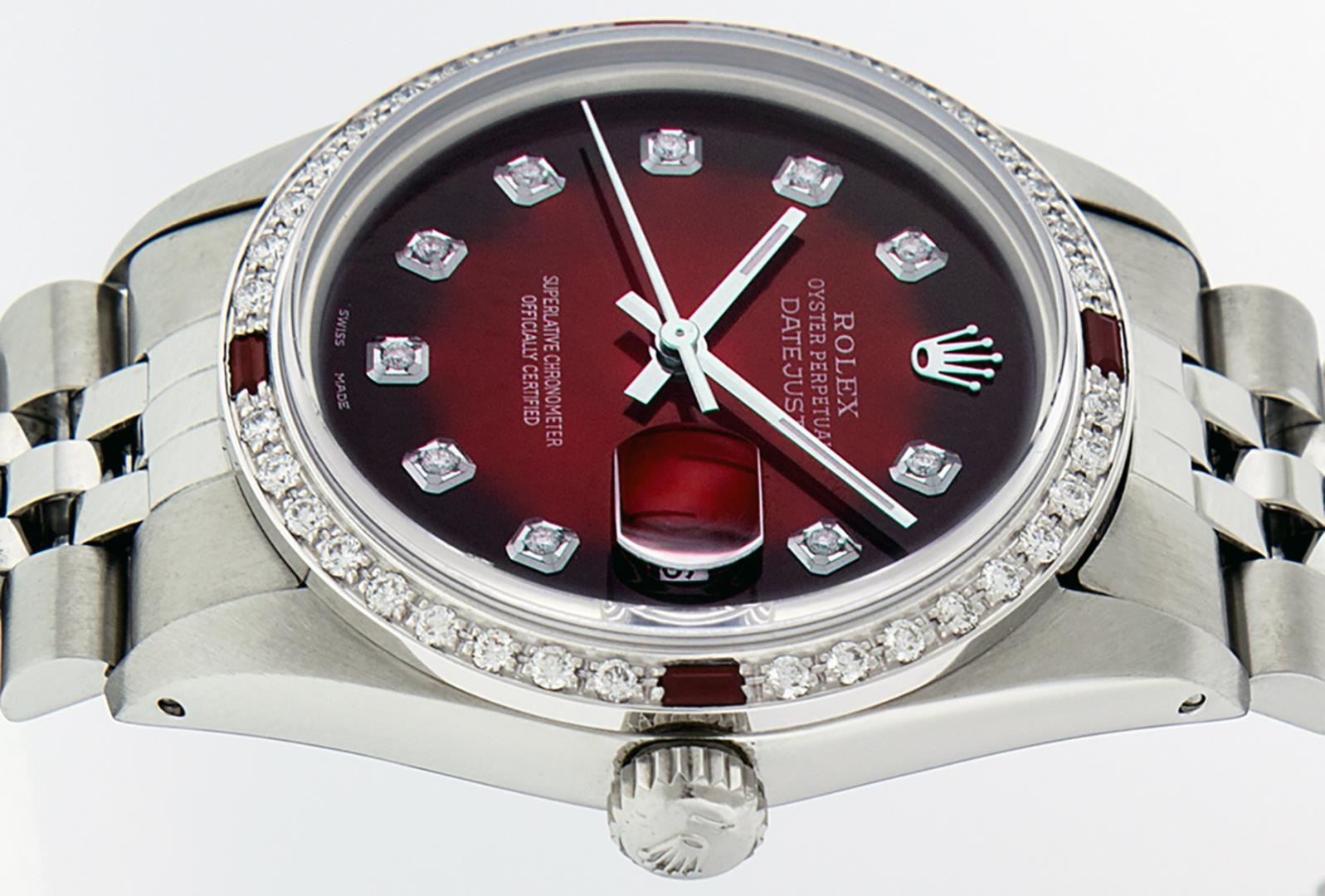 One Mens Pre Owned Stainless Steel Rolex Datejust Polished, Serviced And Electronically Tested, Stainless Steel Case: 36mm, Stainless Steel Crown, Custom Bezel: New 18K White Gold Ruby Beadset Diamond Bezel, Diamond + Gem Count: 36 Diamonds + 4 Rubies. Custom Crystal: New Sapphire With Magnified Date Window. Custom Hands: New Luminescent Hands. Rolex Movement: Automatic Winding Movement 3035. Custom Dial: Custom Red Vignette Dial With Added Diamond Hour Markers, 10 Diamond On Dial. Date Window: 3 O'Clock Position Date Display, Quickset, Model: Datejust. Condition: G-6 Extra Fine. Rolex Bracelet: Stainless Steel Jubilee Band. Bright Polish And Satin Finish. 7.0 Inch Length, Adjustable. Standard Clasp, With Rolex Logo. This Watch Has Been Serviced Time Tested And Is In Excellent Condition It Is Free Of All Scratches And Dents.