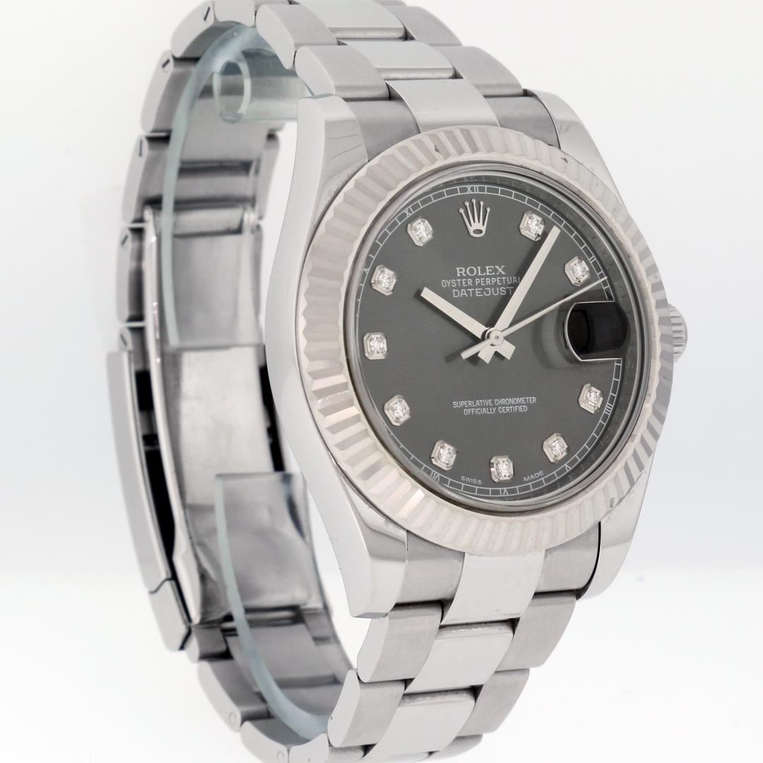 One Mens Pre Owned Rolex Datejust 2 41MM Polished, Serviced & Electronically Tested, Rolex Stainless Steel Case: 41mm, Stainless Steel Crown, Rolex Bezel: 18K White Gold Fluted Bezel, Crystal: Sapphire With Magnified Date Window. Hands: Solid Hands. Rolex Movement: Automatic Winding Movement 3136. Rolex Dial: Rhodium Diamond Dial With Square Roman Track, Diamond Count: 10 Diamonds On Dial, Clarity: VS. Date Window: 3 O'Clock Position Date Display, Quickset, Model: Datejust 2. Condition: G-6 Extra Fine. Rolex Bracelet: Stainless Steel Oyster Band. Bright Polish & Satin Finish. 7.0 Inch Length, Adjustable. Standard Clasp, With Rolex Logo. This Watch Has Been Serviced Time Tested And Is In Excellent Condition It Is Free Of All Scratches And Dents.