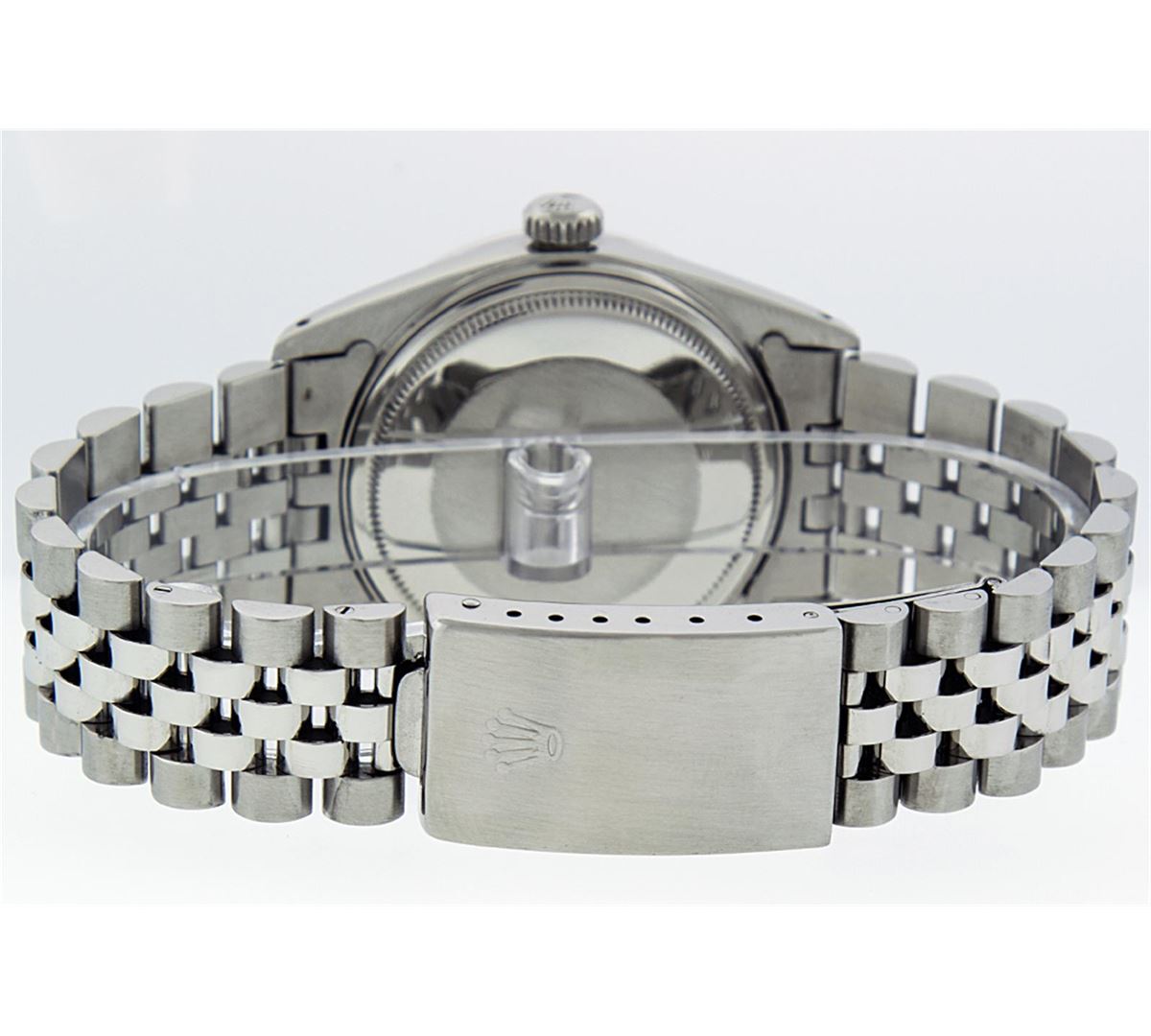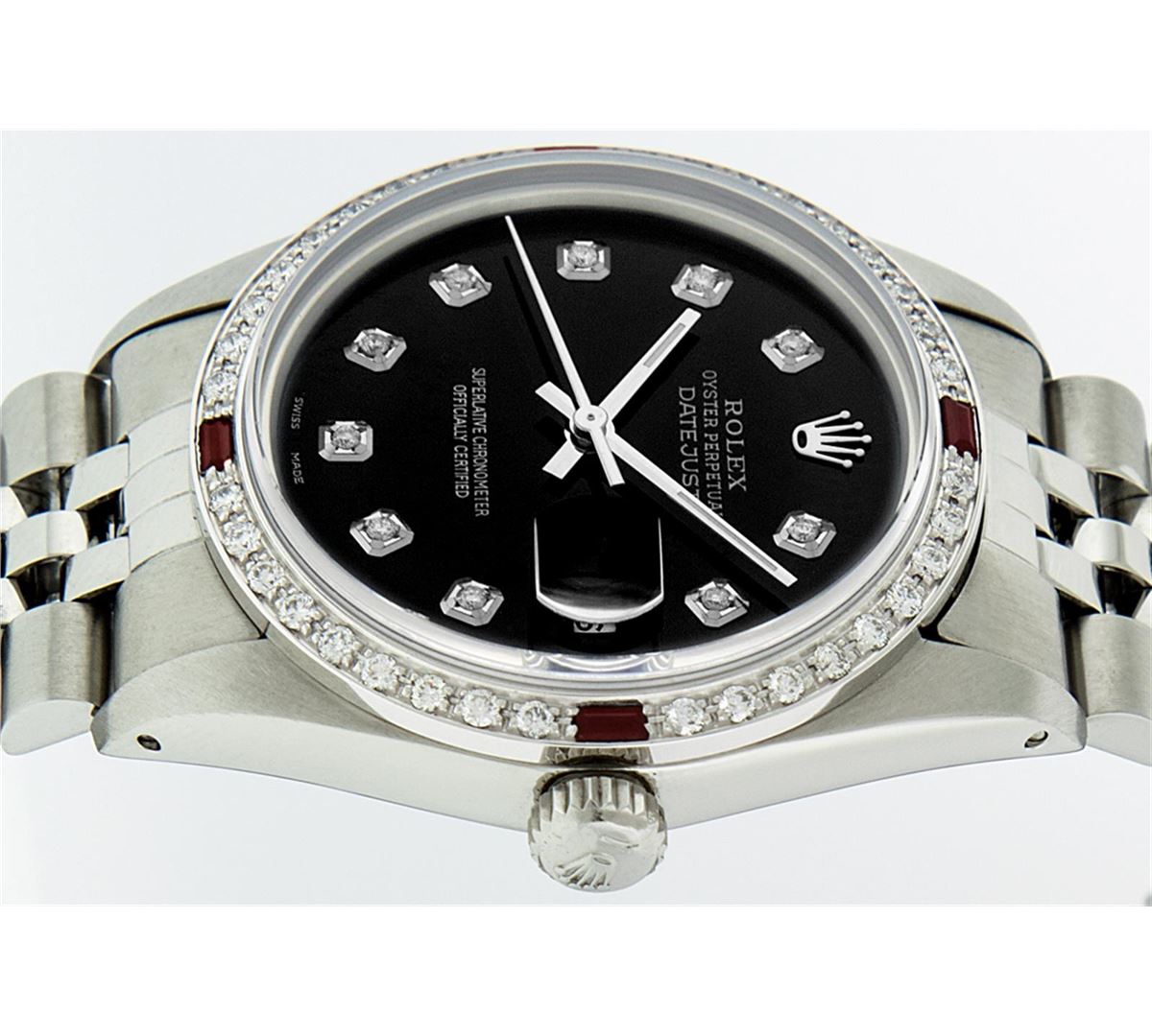 One Mens Rolex Datejust Polished, Serviced & Electronically Tested, Stainless Steel Case:36mm, Stainless Steel Crown, Custom Bezel: 18K White Gold Ruby Beadset Diamond Bezel, Diamond + Gem Count: 36 Diamonds + 4 Rubies. Total Weight 1.00 Carat, Clarity: SI-VS, Color: G to H. Custom Crystal: Synthetic Sapphire Cyclops Lens. Movement: Automatic Winding Movement Caliber 3035. Custom Dial: Black With Diamond Hour Markers, Diamond Count: 10 Diamond In Dial G To H In Color, Clarity: SI-VS. Date Window: 3 O'Clock Position Date Display, Quickset, Model: Datejust. Condition: G-6 Extra Fine. Bracelet: Stainless Steel Jubilee. Bright Polish & Satin Finish. 7.0 Inch Length, Adjustable. Standard Clasp, With Rolex Logo.