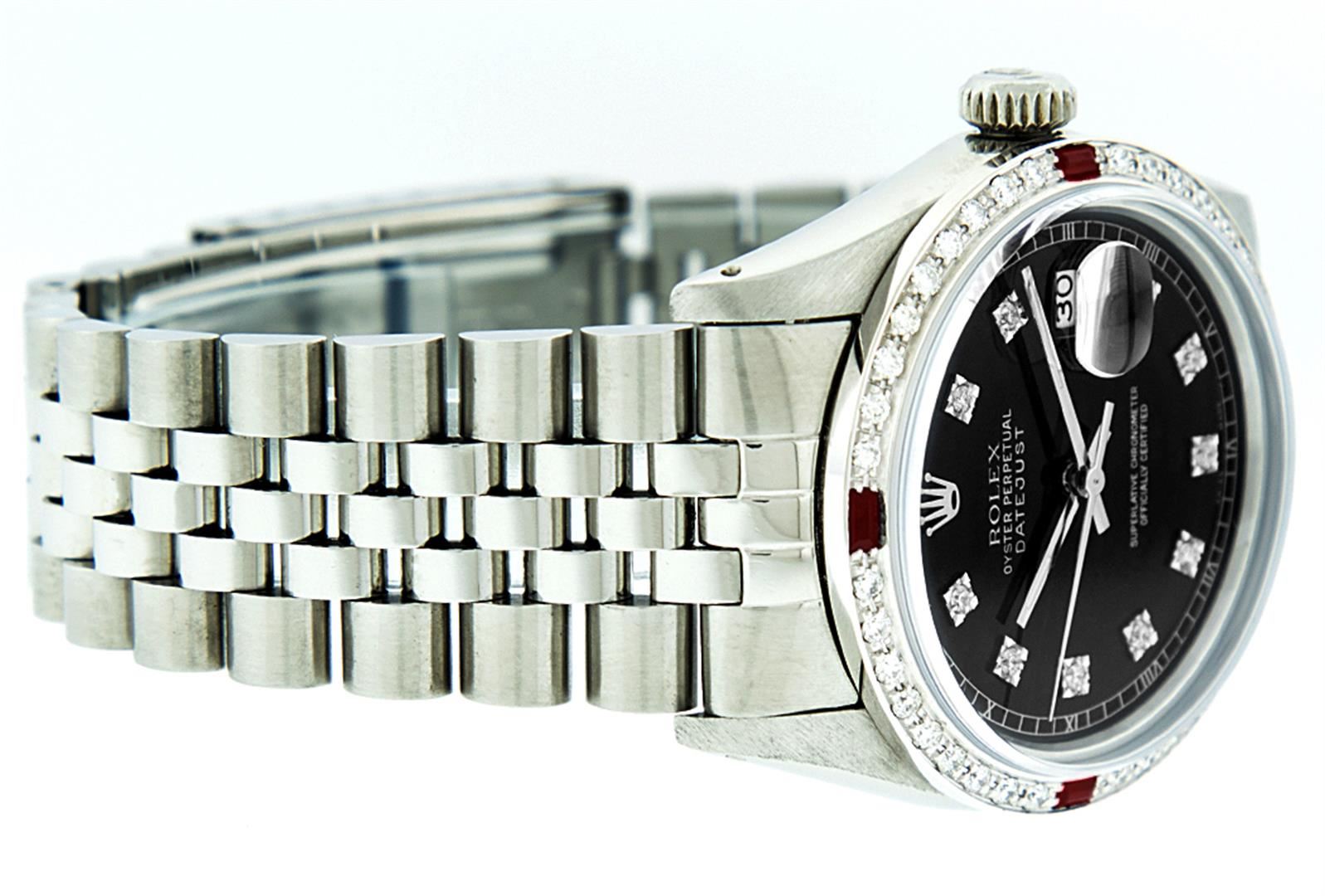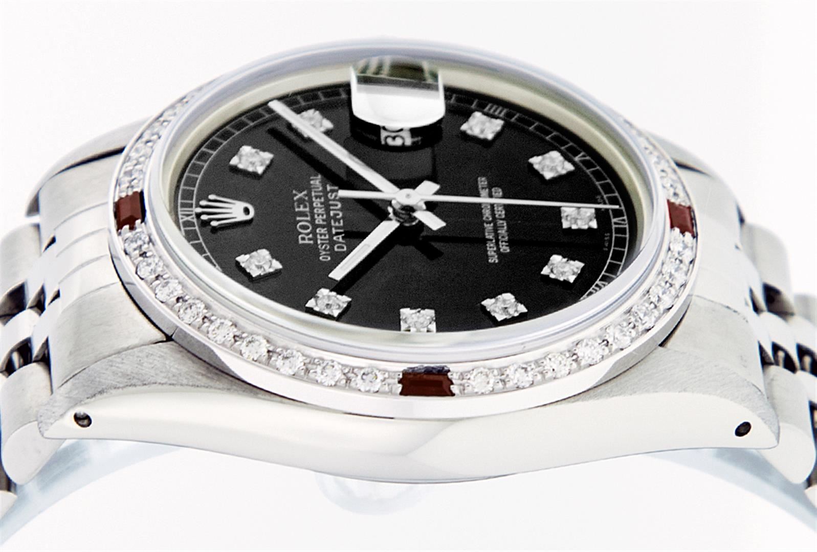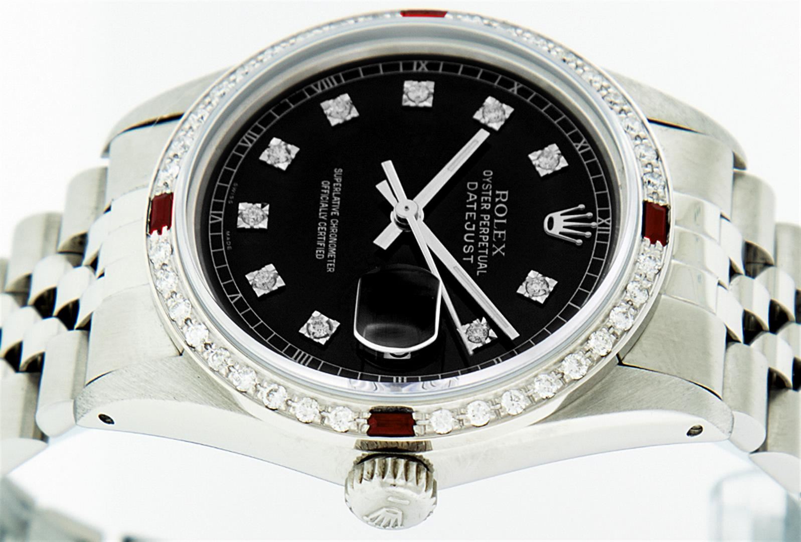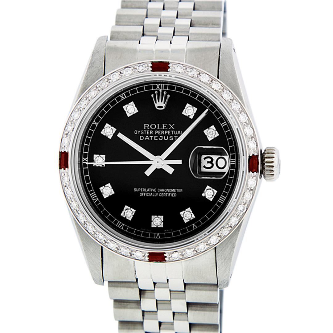 One Mens Rolex Datejust Polished, Serviced & Electronically Tested, Stainless Steel Case:36mm, Stainless Steel Crown, Custom Bezel: 18K White Gold Ruby Beadset Diamond Bezel, Diamond + Gem Count: 36 Diamonds + 4 Rubies. Total Weight 1.00 Carat, Clarity: SI-VS, Color: G to H. Custom Crystal: Synthetic Sapphire Cyclops Lens. Movement: Automatic Winding Movement Caliber 3035. Custom Dial: Black With Diamond Hour Markers Square Roman Track, Diamond Count: 10 Diamonds In Dial Square Setting. G To H In Color, Clarity: SI-VS. Date Window: 3 O'Clock Position Date Display, Quickset, Model: Datejust. Condition: G-6 Extra Fine. Bracelet: Stainless Steel Jubilee. Bright Polish & Satin Finish. 7.0 Inch Length, Adjustable. Standard Clasp, With Rolex Logo.
