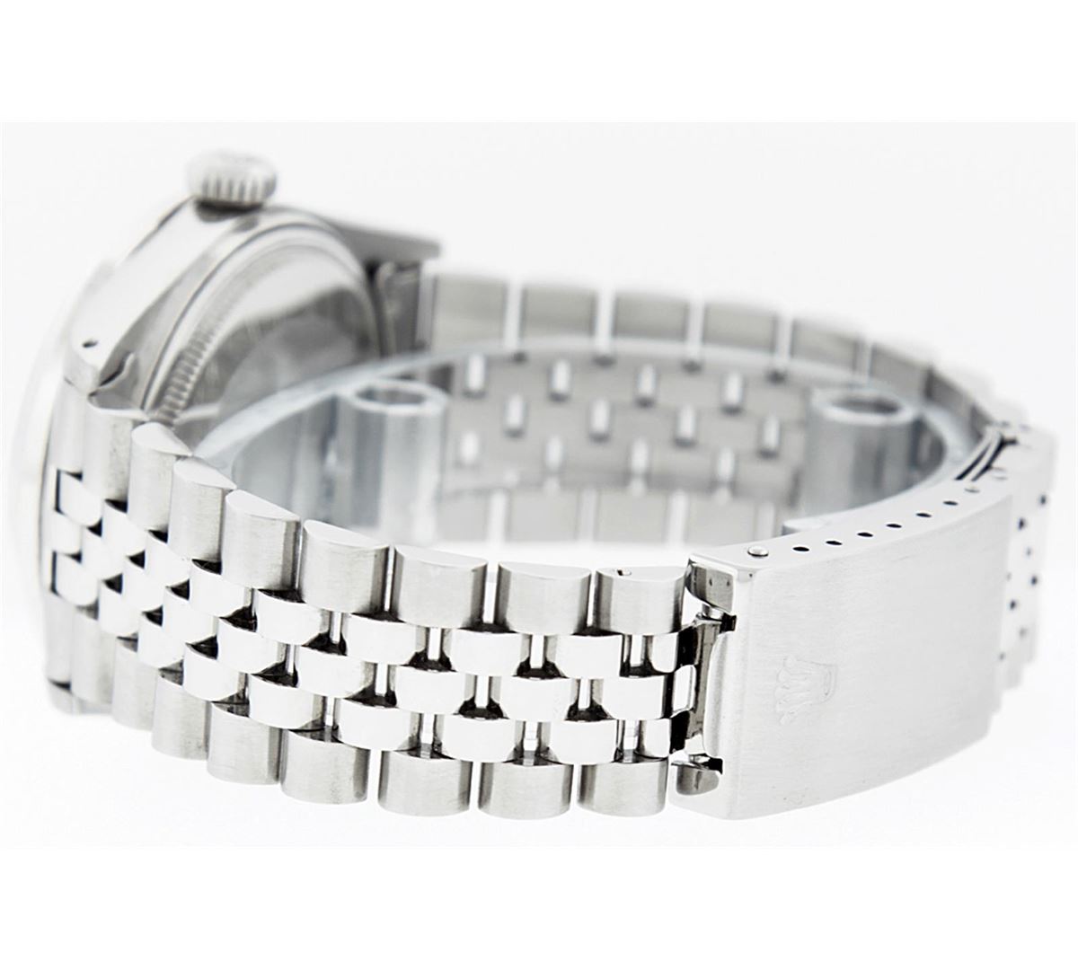 One Mens Rolex Datejust Polished, Serviced & Electronically Tested, Stainless Steel Case:36mm, Stainless Steel Crown, Custom Bezel: 18K White Gold Ruby Beadset Diamond Bezel, Diamond + Gem Count: 36 Diamonds + 4 Rubies Total Weight 1.00 Carat, Clarity: SI-VS, Color: G to H. Custom Crystal: Synthetic Sapphire Cyclops Lens. Movement: Automatic Winding Movement Caliber 3035. Custom Dial: Red Vignette With Diamond Hour Markers and Square Roman Track, 10 Diamond Dial G To H In Color, Clarity: SI-VS. Date Window: 3 O'Clock Position Date Display, Quickset, Model: Datejust. Condition: G-6 Extra Fine. Bracelet: Stainless Steel Jubilee. Bright Polish & Satin Finish. 7.0 Inch Length, Adjustable. Standard Clasp, With Rolex Logo.
