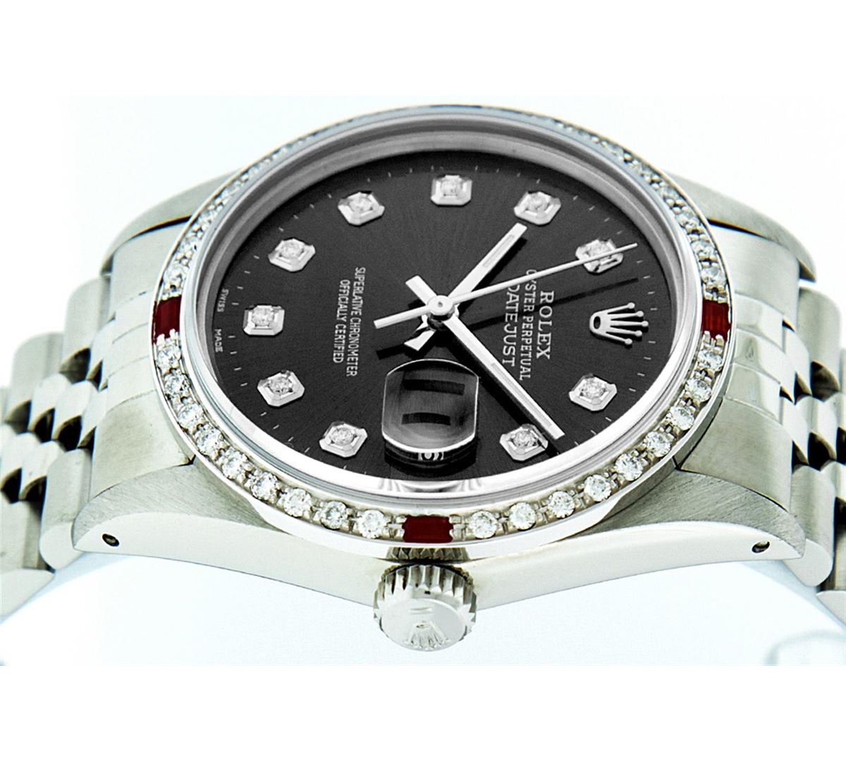 One Mens Rolex Datejust Polished Bright with Satin Finish, Serviced & Electronically Tested, Stainless Steel Case:36mm, Stainless Steel Crown, Custom Bezel: 18K White Gold Ruby Beadset Diamond Bezel, Diamond + Gem Count: 36 Diamonds + 4 Rubies. Total Weight 1.00 Carat, Clarity: Si-VS, Color: G to H. Custom Crystal: Synthetic Sapphire Cyclops Lens. Movement: Automatic Winding Movement Caliber 3035. Custom Dial: Black Diamond Dial, 10 Diamond in Dial G To H In Color, Si-VS Clarity. Date Window: 3 O'Clock Position Date Display, Quickset, Model:Datejust. Condition: G-6 Extra Fine. Bracelet:Stainless Steel Jubilee. Bright Polish & Satin Finish. 7.0 Inch Length, Adjustable. Standard Clasp, With Rolex Logo.
