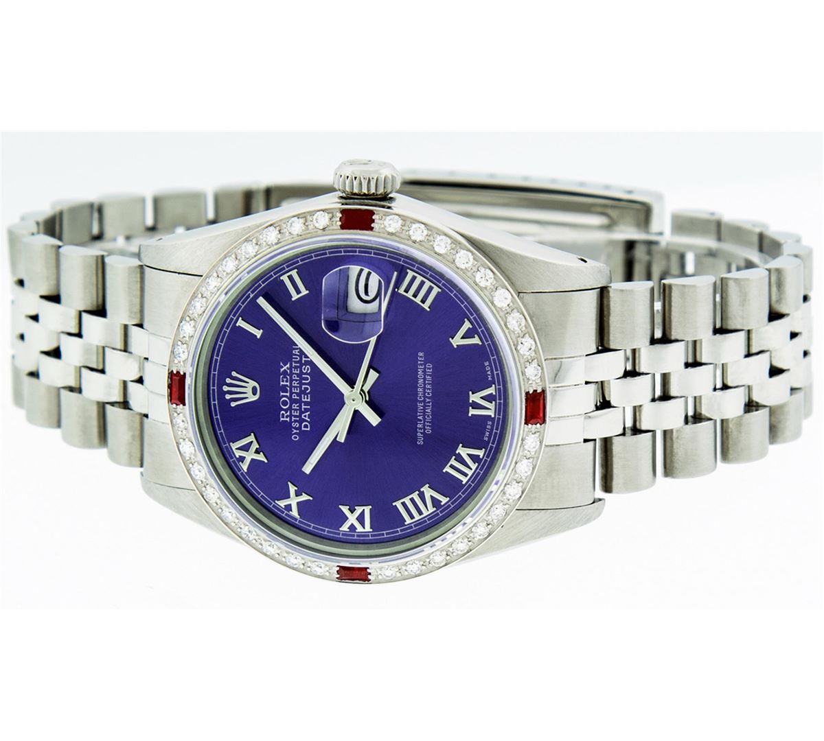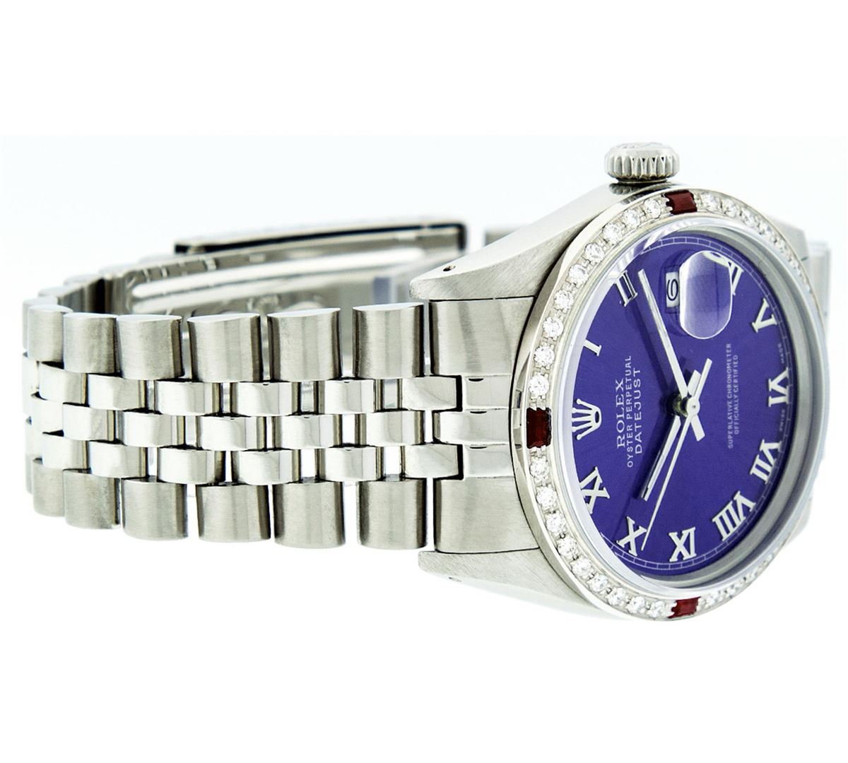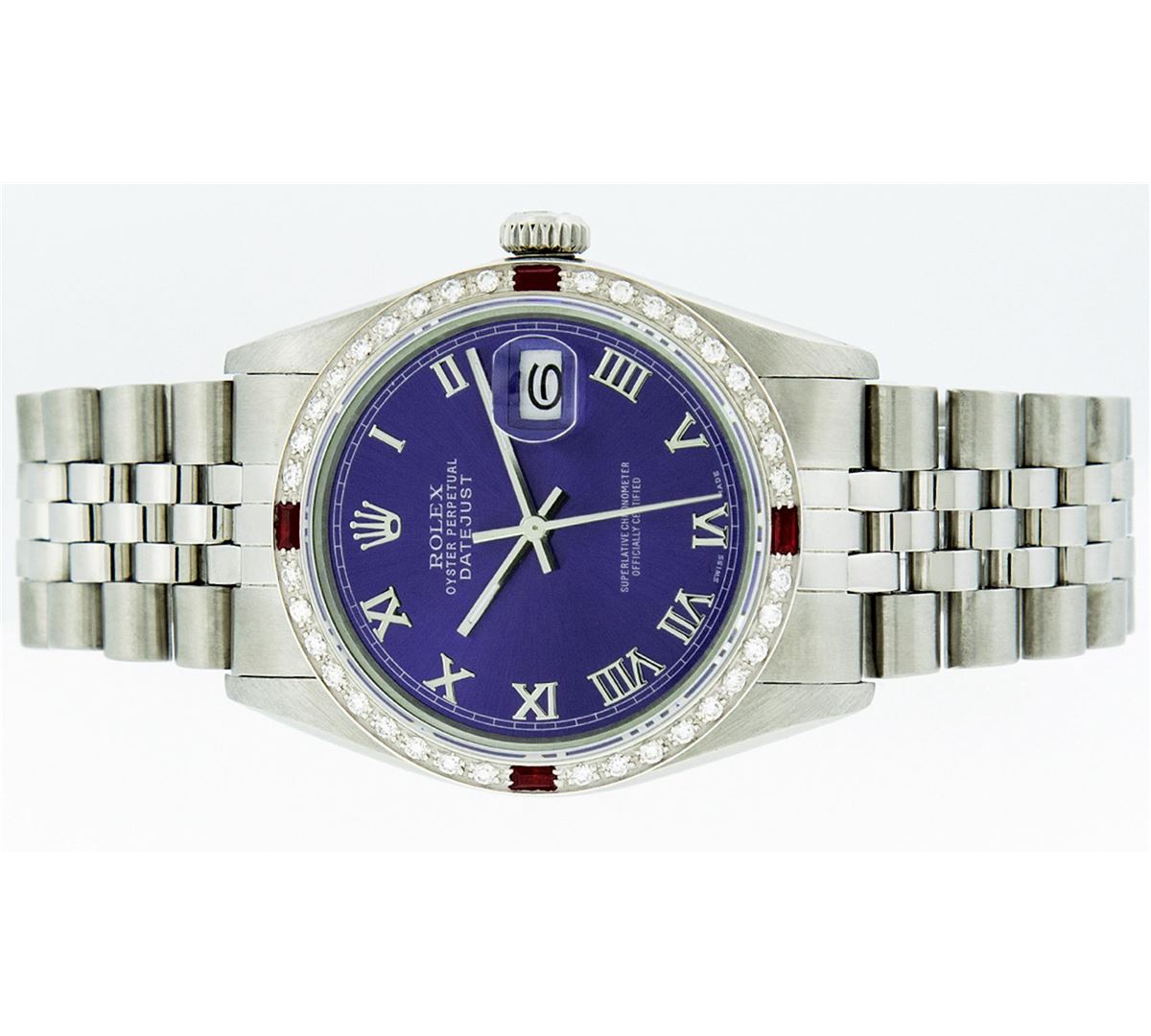 One Mens Rolex Datejust Polished Bright with Satin Finish, Serviced & Electronically Tested, Stainless Steel Case:36mm, Stainless Steel Crown, Custom Bezel: 18K White Gold Ruby Beadset Diamond Bezel, Diamond + Gem Count: 36 Diamonds + 4 Rubies. Total Weight 1.00 Carat, Clarity: Si-VS, Color: G to H. Custom Crystal: Synthetic Sapphire Cyclops Lens. Movement: Automatic Winding Movement Caliber 3035. Custom Dial: Purple Roman Dial With Square Track. Date Window: 3 O'Clock Position Date Display, Quickset, Model: Datejust. Condition: G-6 Extra Fine. Bracelet:Stainless Steel Jubilee. Bright Polish & Satin Finish. 7.0 Inch Length, Adjustable. Standard Clasp, With Rolex Logo.