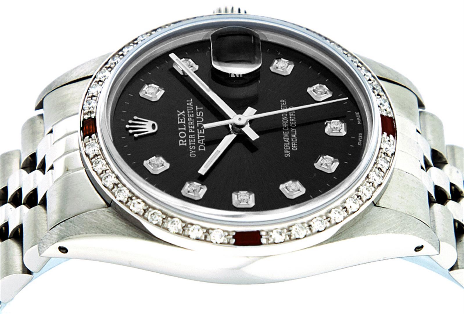 One Mens Rolex Datejust Polished Bright with Satin Finish, Serviced & Electronically Tested, Stainless Steel Case:36mm, Stainless Steel Crown, Custom Bezel: 18K White Gold Ruby Beadset Diamond Bezel, Diamond + Gem Count: 36 Diamonds + 4 Rubies. Total Weight 1.00 Carat, Clarity: Si-VS, Color: G to H. Custom Crystal: Synthetic Sapphire Cyclops Lens. Movement: Automatic Winding Movement Caliber 3035. Custom Dial: Black Diamond Dial, 10 Diamond in Dial G To H In Color, Si-VS Clarity. Date Window: 3 O'Clock Position Date Display, Quickset, Model:Datejust. Condition: G-6 Extra Fine. Bracelet:Stainless Steel Jubilee. Bright Polish & Satin Finish. 7.0 Inch Length, Adjustable. Standard Clasp, With Rolex Logo.