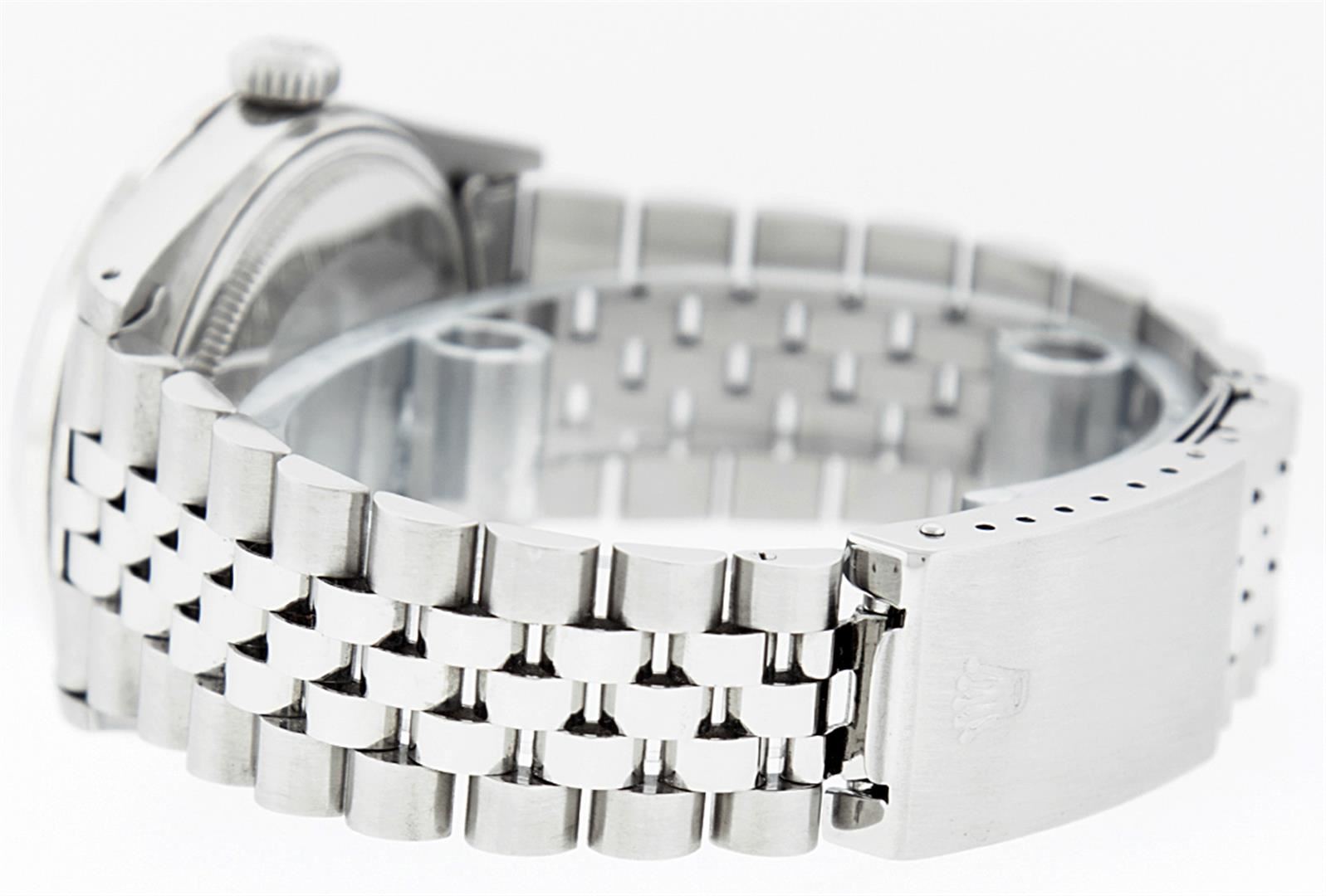 One Mens Rolex Datejust Polished, Serviced & Electronically Tested, Stainless Steel Case:36mm, Stainless Steel Crown, Custom Bezel: 18K White Gold Ruby Beadset Diamond Bezel, Diamond + Gem Count: 36 Diamonds + 4 Rubies Total Weight 1.00 Carat, Clarity: SI-VS, Color: G to H. Custom Crystal: Synthetic Sapphire Cyclops Lens. Movement: Automatic Winding Movement Caliber 3035. Custom Dial: Red Vignette With Diamond Hour Markers and Square Roman Track, 10 Diamond Dial G To H In Color, Clarity: SI-VS. Date Window: 3 O'Clock Position Date Display, Quickset, Model: Datejust. Condition: G-6 Extra Fine. Bracelet: Stainless Steel Jubilee. Bright Polish & Satin Finish. 7.0 Inch Length, Adjustable. Standard Clasp, With Rolex Logo.