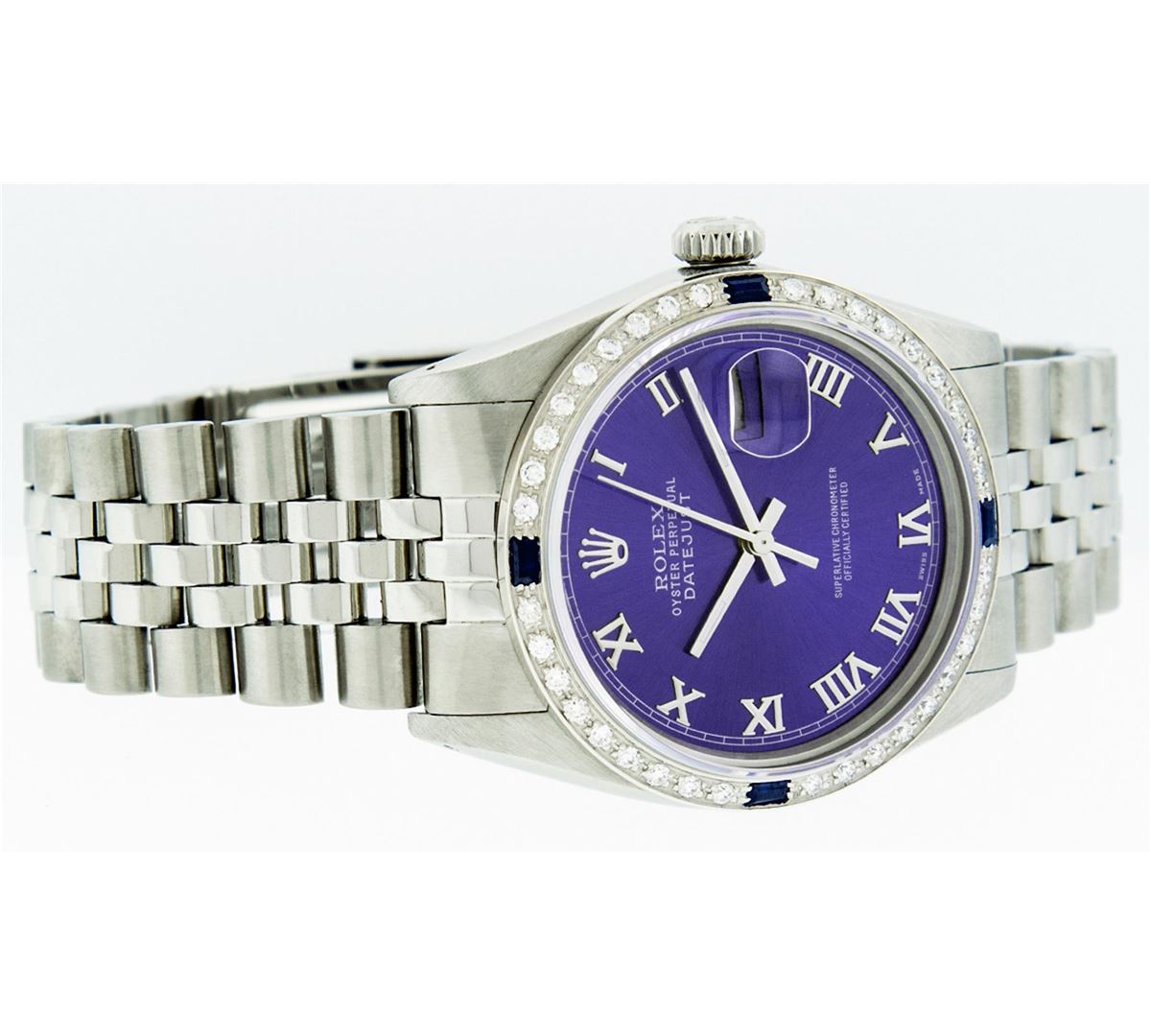 One Mens Rolex Datejust Polished Bright with Satin Finish, Serviced & Electronically Tested, Stainless Steel Case:36mm, Stainless Steel Crown, Custom Bezel: 18K White Gold Sapphire Beadset Diamond Bezel, Diamond + Gem Count: 36 Diamonds + 4 Sapphires. Total Weight 1.00 Carat, Clarity: Si-VS, Color: G to H. Custom Crystal: Synthetic Sapphire Cyclops Lens. Movement: Automatic Winding Movement Caliber 3035. Custom Dial: Purple Roman Dial With Square Track. Date Window: 3 O'Clock Position Date Display, Quickset, Model:Datejust. Condition: G-6 Extra Fine. Bracelet:Stainless Steel Jubilee. Bright Polish & Satin Finish. 7.0 Inch Length, Adjustable. Standard Clasp, With Rolex Logo.