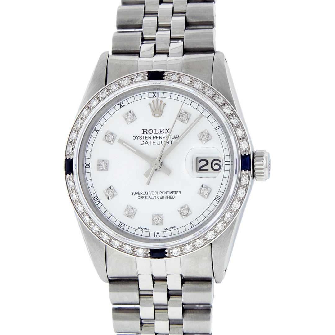 One Mens Rolex Datejust Polished Bright with Satin Finish, Serviced & Electronically Tested, Stainless Steel Case:36mm, Stainless Steel Crown, Custom Bezel: 18K White Gold Sapphire Beadset Diamond Bezel, Diamond + Gem Count: 36 Diamonds + 4 Sapphires. Total Weight 1.00 Carat, Clarity: Si-VS, Color: G to H. Custom Crystal: Synthetic Sapphire Cyclops Lens. Movement: Automatic Winding Movement Caliber 3035. Custom Dial: White Diamond Dial With Square Roman Track, Diamond Count: 10 Diamonds Square Setting, Color: G to H, Clarity: SI-VS. Date Window: 3 O'Clock Position Date Display, Quickset, Model: Datejust. Condition: G-6 Extra Fine. Bracelet: Stainless Steel Jubilee. Bright Polish & Satin Finish. 7.0 Inch Length, Adjustable. Standard Clasp, With Rolex Logo.
