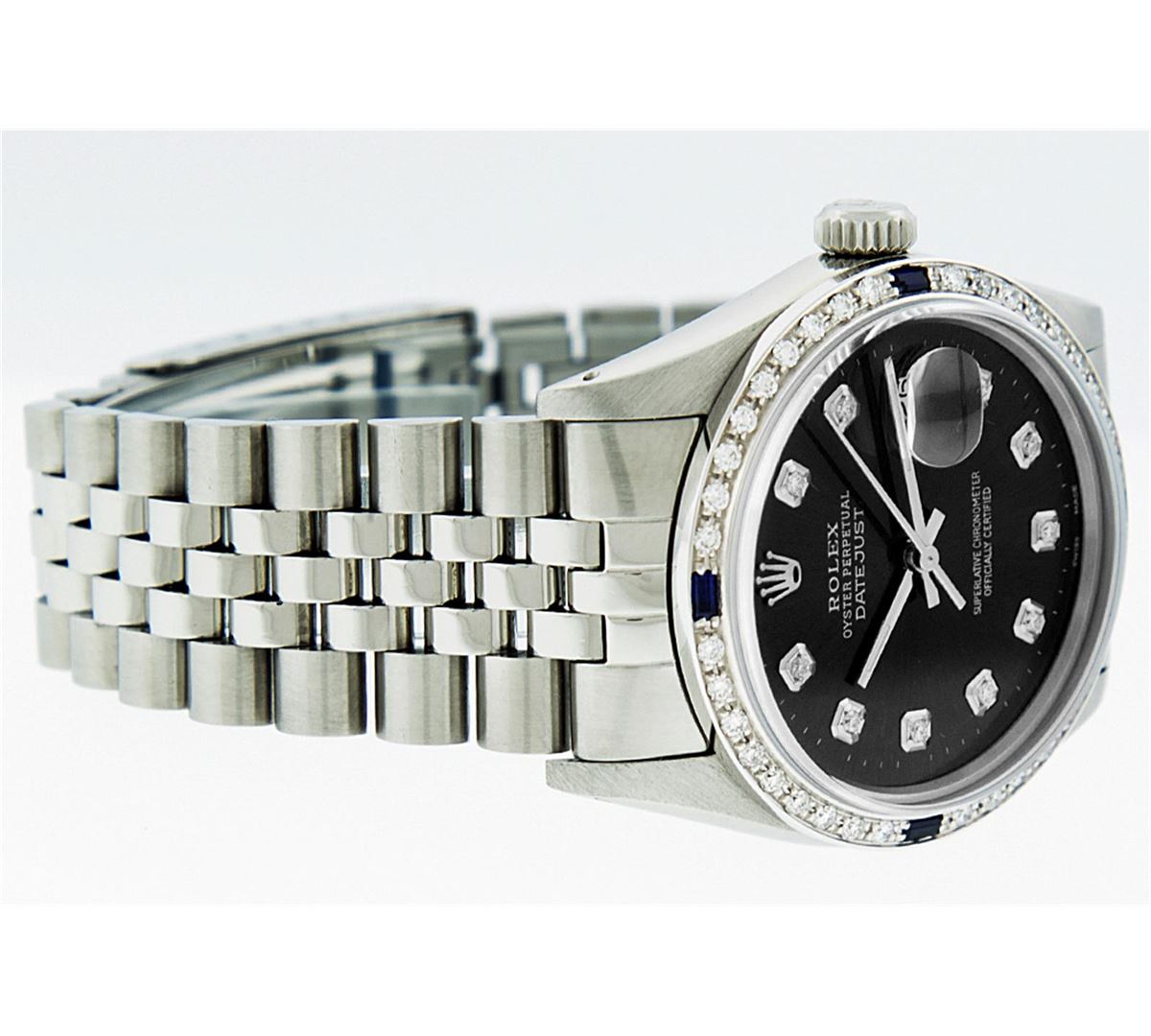 One Mens Rolex Datejust Polished Bright with Satin Finish, Serviced & Electronically Tested, Stainless Steel Case: 36mm, Stainless Steel Crown, Custom Bezel: 18K White Gold Sapphire Beadset Diamond Bezel, Diamond + Gem Count: 36 Diamonds + 4 Sapphires. Total Weight 1.00 Carat, Clarity: Si-VS, Color: G to H. Custom Crystal: Synthetic Sapphire Cyclops Lens. Movement: Automatic Winding Movement Caliber 3035. Custom Dial: Black Diamond Dial, 10 Diamond in Dial G To H In Color, Si-VS Clarity. Date Window: 3 O'Clock Position Date Display, Quickset, Model:Datejust. Condition: G-6 Extra Fine. Bracelet:Stainless Steel Jubilee. Bright Polish & Satin Finish. 7.0 Inch Length, Adjustable. Standard Clasp, With Rolex Logo.