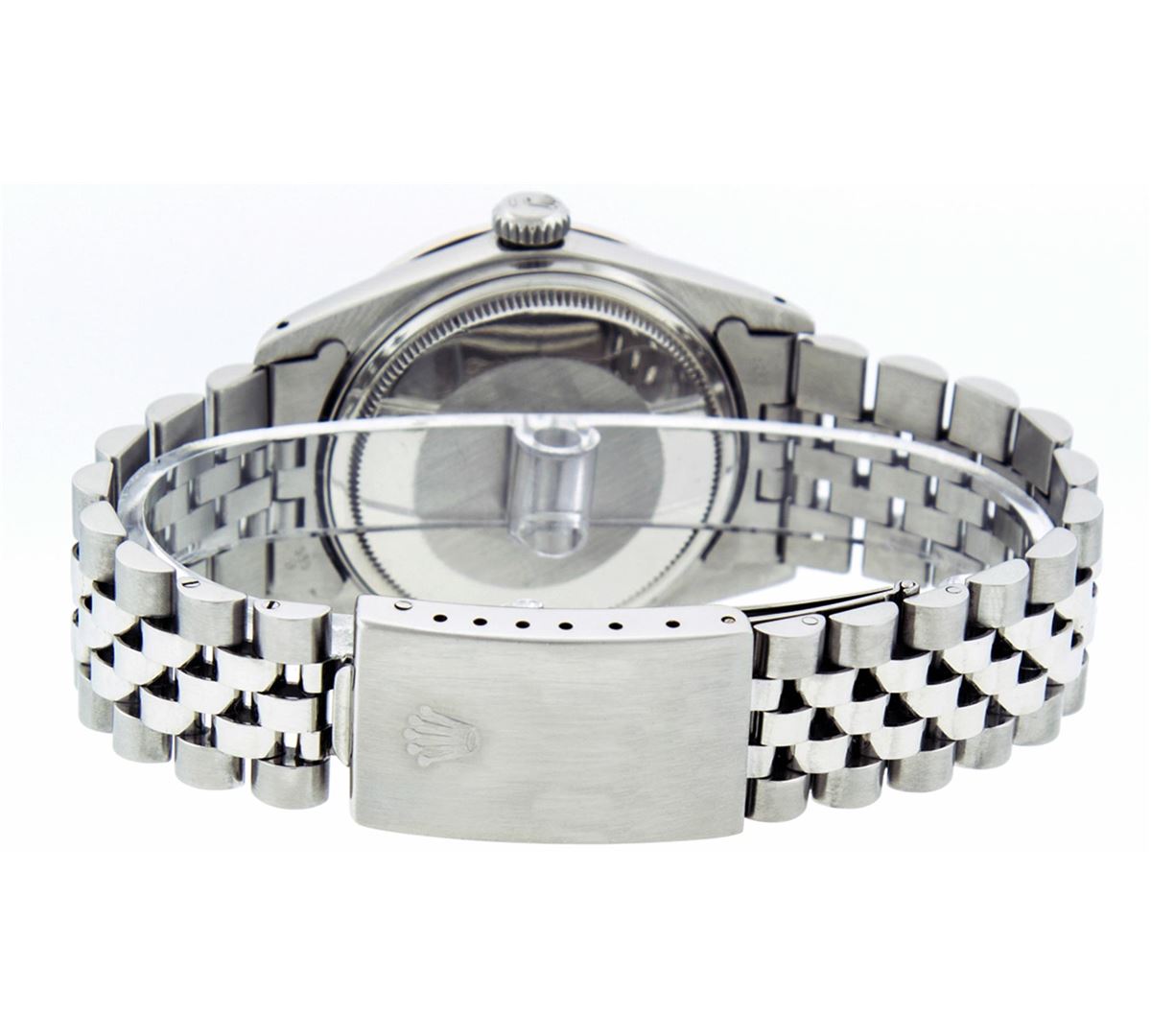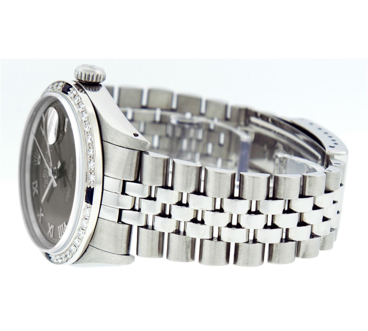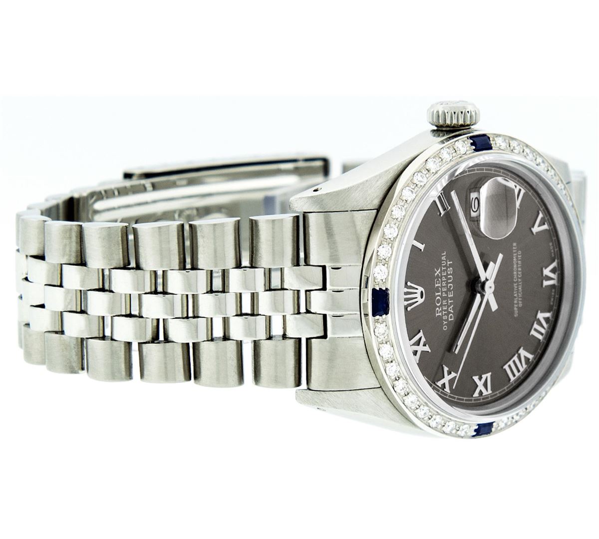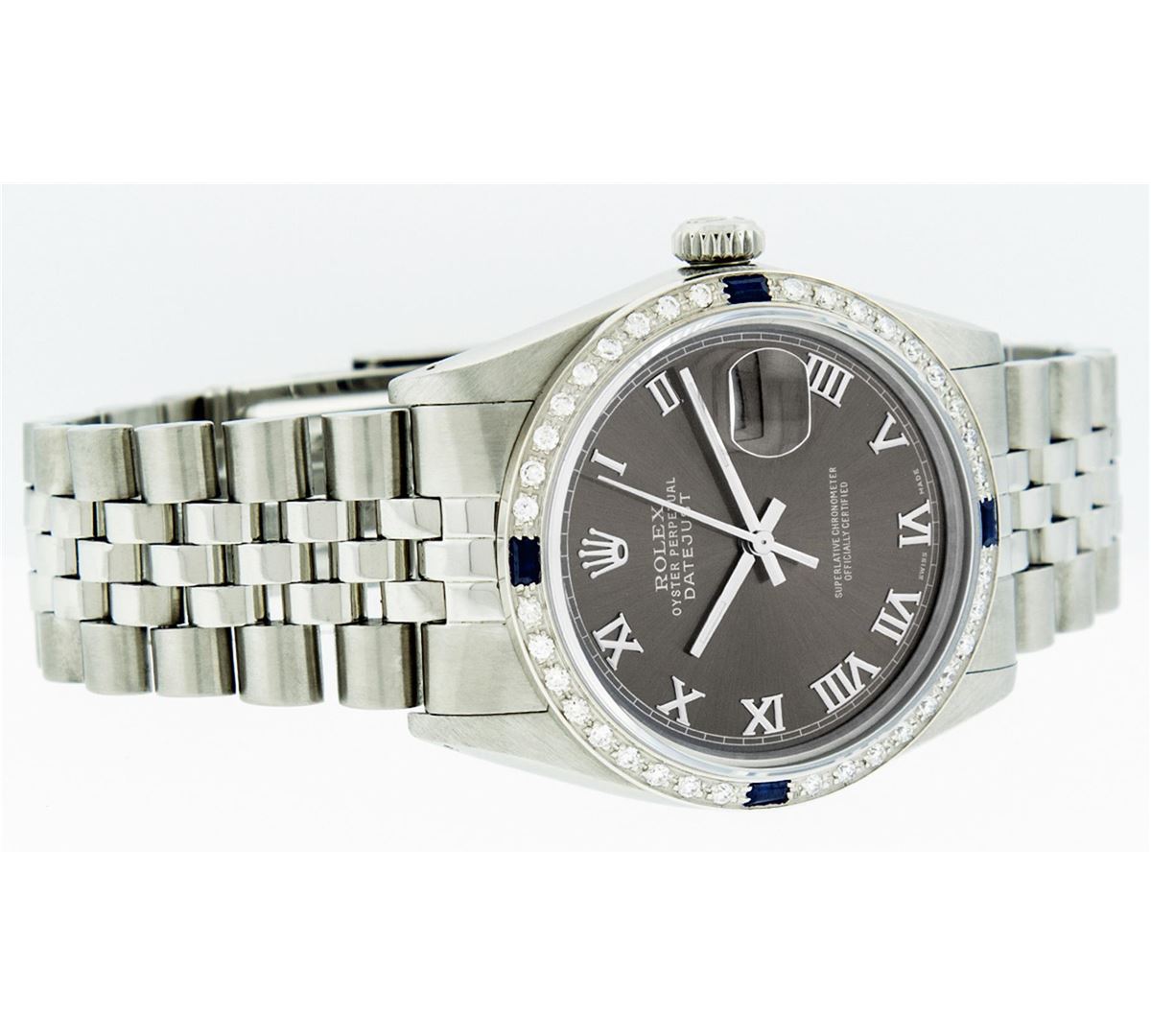 One Mens Rolex Datejust Polished Bright with Satin Finish, Serviced & Electronically Tested, Stainless Steel Case:36mm, Stainless Steel Crown, Custom Bezel: 18K White Gold Sapphire Beadset Diamond Bezel, Diamond + Gem Count: 36 Diamonds + 4 Sapphires. Total Weight 1.00 Carat, Clarity: Si-VS, Color: G to H. Custom Crystal: Synthetic Sapphire Cyclops Lens. Movement: Automatic Winding Movement Caliber 3035. Custom Dial: Dark Rhodium Roman Dial With Square Track. Date Window: 3 O'Clock Position Date Display, Quickset, Model:Datejust. Condition: G-6 Extra Fine. Bracelet:Stainless Steel Jubilee. Bright Polish & Satin Finish. 7.0 Inch Length, Adjustable. Standard Clasp, With Rolex Logo.