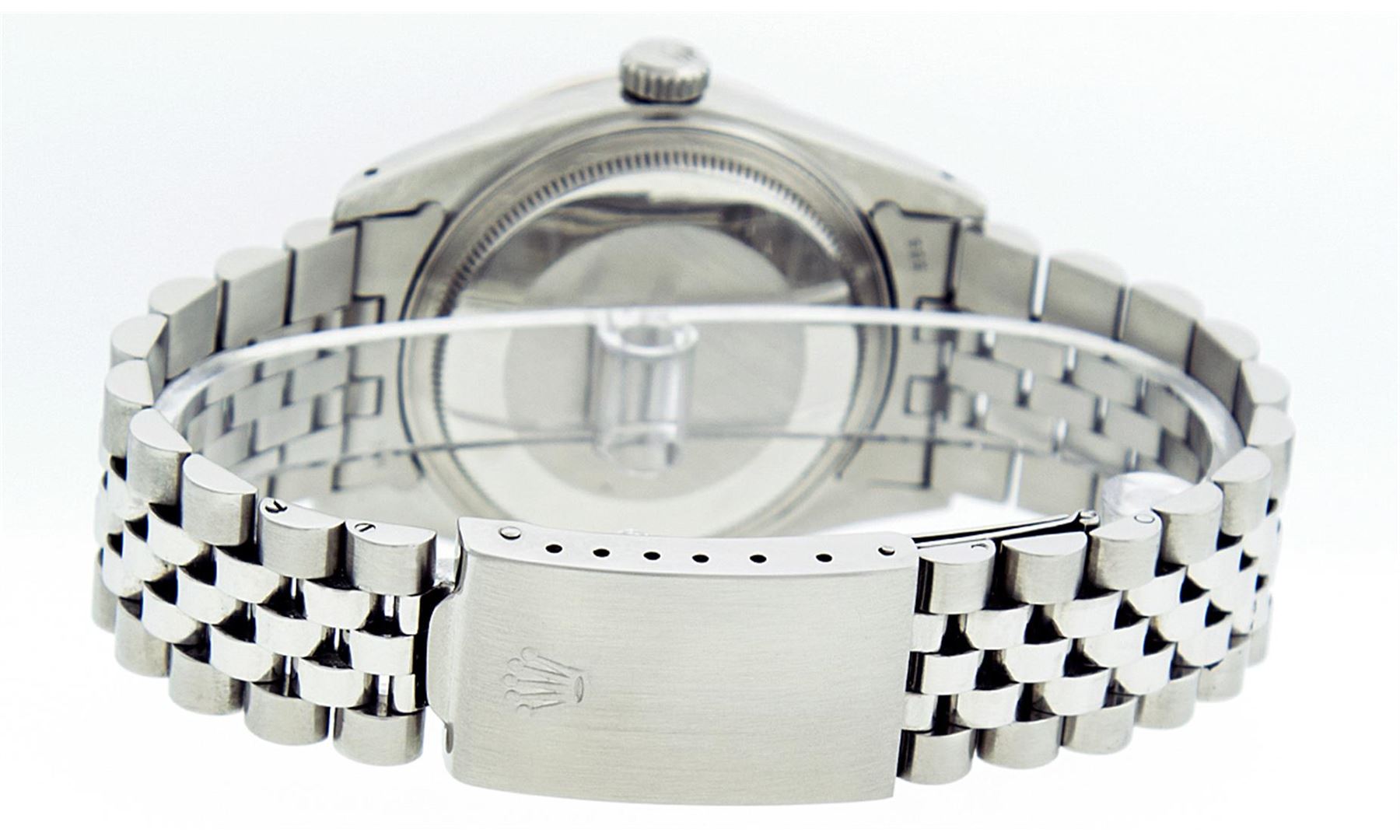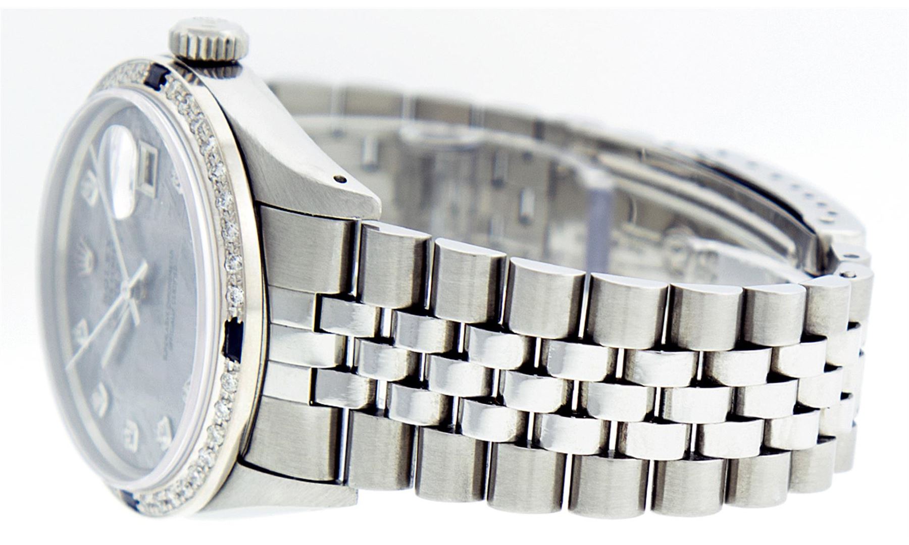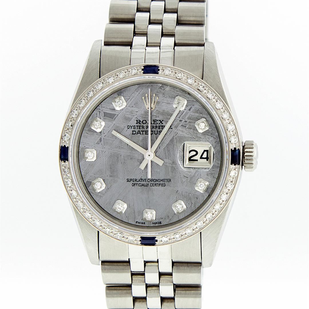 One Mens Stainless Steel Rolex Datejust Polished Bright with Satin Finish, Fully Serviced & Electronically Tested, Stainless Steel Case:36mm, Stainless Steel Crown, Custom Bezel: 18K White Gold Sapphire Beadset Diamond Bezel, Diamond Count: 36 Diamonds + 4 Sapphire, Total Weight 1.00 Carat, Clarity: SI-VS, Color: G to H. Custom Crystal: Synthetic Sapphire Cyclops Lens. Movement: Automatic Winding Movement Caliber 3035. Custom Dial: Meteorite Diamond Dial, 10 Diamonds in Dial, G To H In Color, Clarity: SI-VS. Date Window: 3 O'Clock Position Date Display, Quickset, Model: Datejust, Condition: G-6 Extra Fine. Bracelet:Stainless Steel Jubilee. Bright Polish & Satin Finish. 7.0 Inch Length, Adjustable. Standard Clasp, With Rolex Logo.