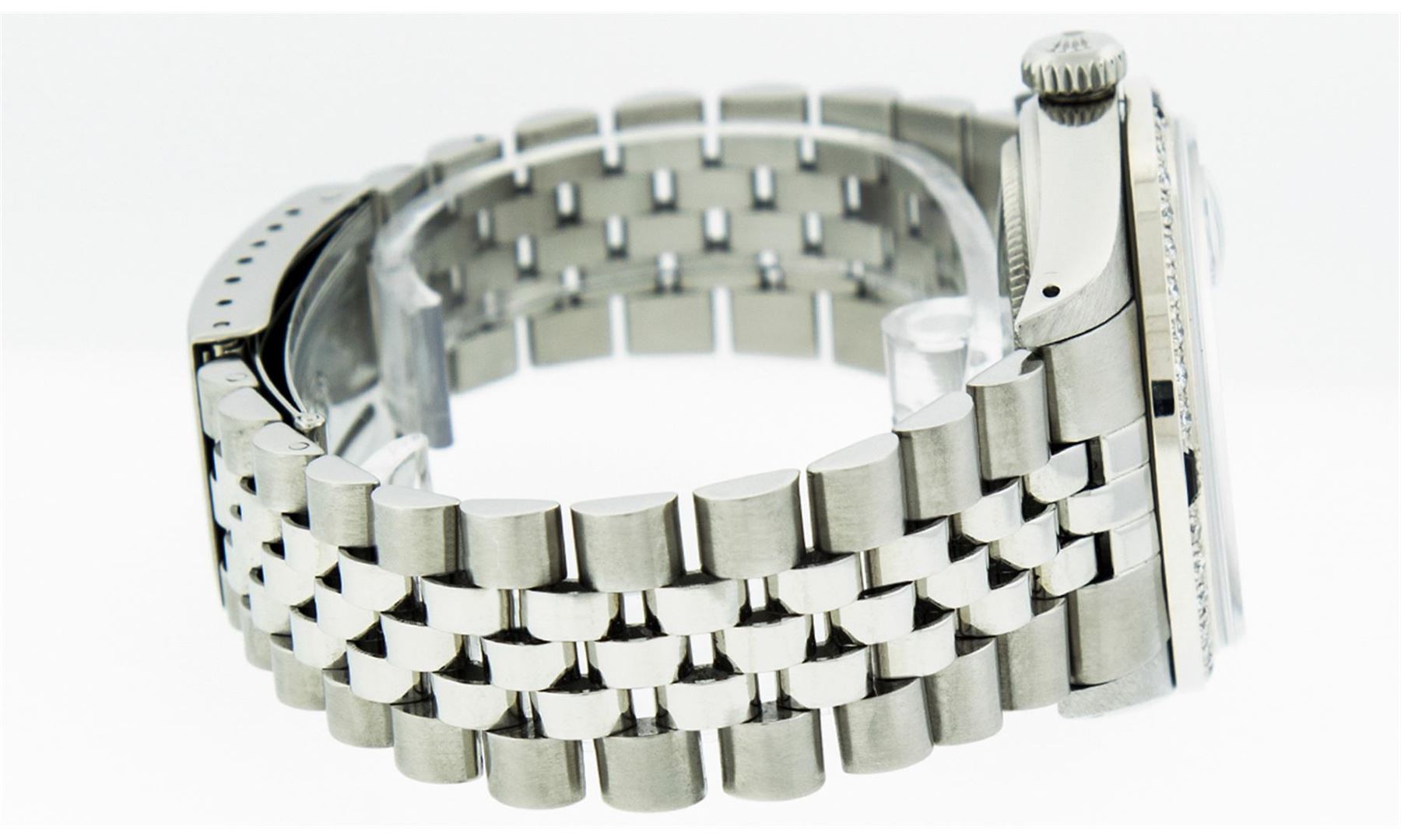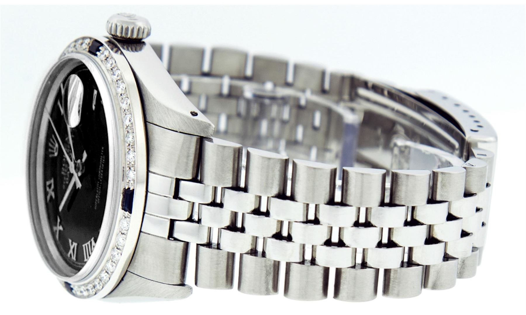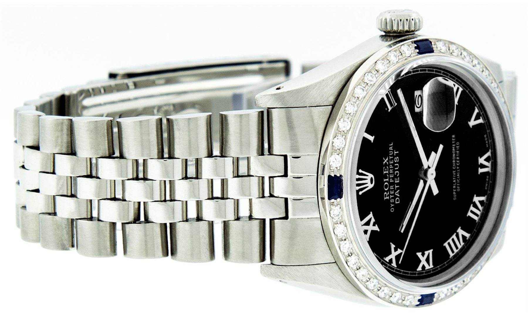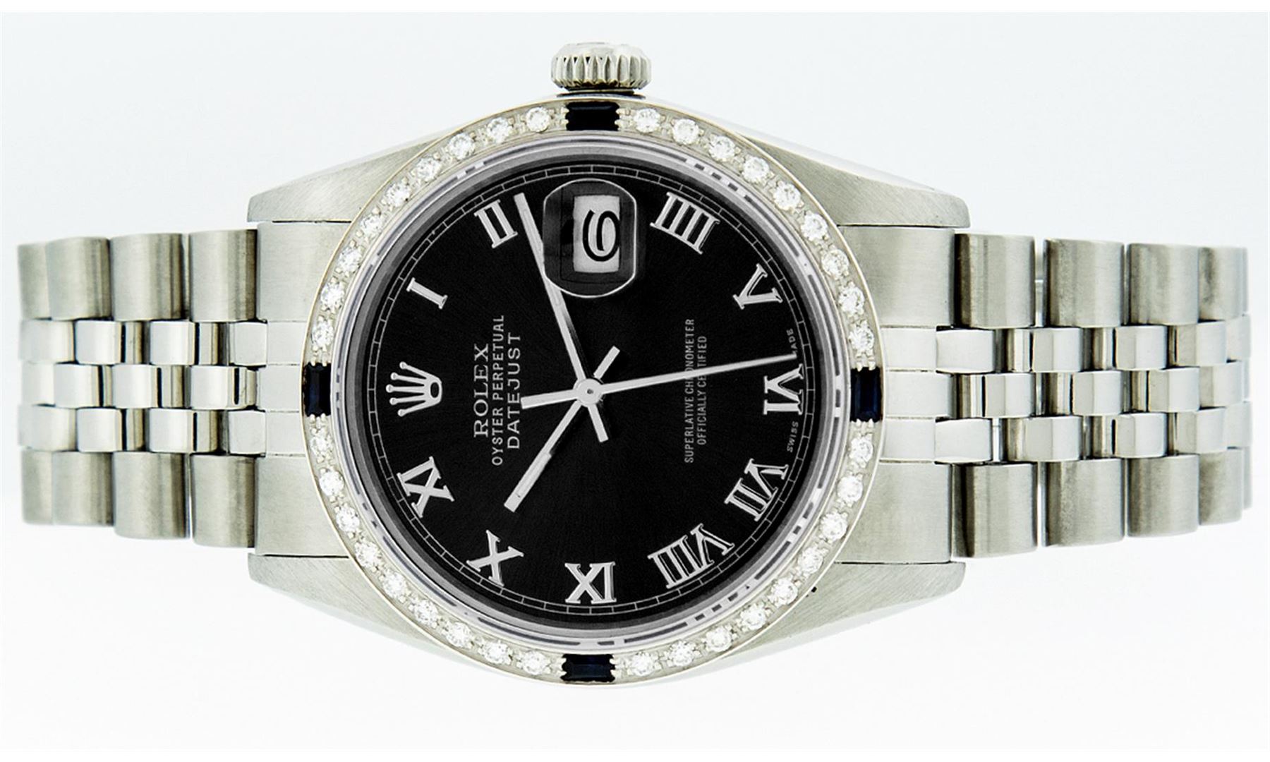 One Mens Rolex Datejust Polished Bright with Satin Finish, Serviced & Electronically Tested, Stainless Steel Case:36mm, Stainless Steel Crown, Custom Bezel: 18K White Gold Sapphire Beadset Diamond Bezel, Diamond + Gem Count: 36 Diamonds + 4 Sapphire. Total Weight 1.00 Carat, Clarity: Si-VS, Color: G to H. Custom Crystal: Synthetic Sapphire Cyclops Lens. Movement: Automatic Winding Movement Caliber 3035. Custom Dial: Black Roman Dial. Date Window: 3 O'Clock Position Date Display, Quickset, Model: Datejust. Condition: G-6 Extra Fine. Bracelet:Stainless Steel Jubilee. Bright Polish & Satin Finish. 7.0 Inch Length, Adjustable. Standard Clasp, With Rolex Logo.