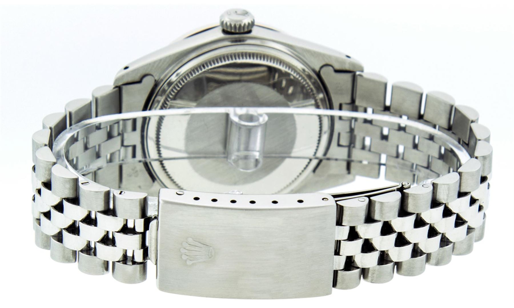 One Mens Rolex Datejust Polished Bright with Satin Finish, Serviced & Electronically Tested, Stainless Steel Case:36mm, Stainless Steel Crown, Custom Bezel: 18K White Gold Sapphire Beadset Diamond Bezel, Diamond + Gem Count: 36 Diamonds + 4 Sapphires. Total Weight 1.00 Carat, Clarity: Si-VS, Color: G to H. Custom Crystal: Synthetic Sapphire Cyclops Lens. Movement: Automatic Winding Movement Caliber 3035. Custom Dial: Purple Roman Dial With Square Track. Date Window: 3 O'Clock Position Date Display, Quickset, Model:Datejust. Condition: G-6 Extra Fine. Bracelet:Stainless Steel Jubilee. Bright Polish & Satin Finish. 7.0 Inch Length, Adjustable. Standard Clasp, With Rolex Logo.