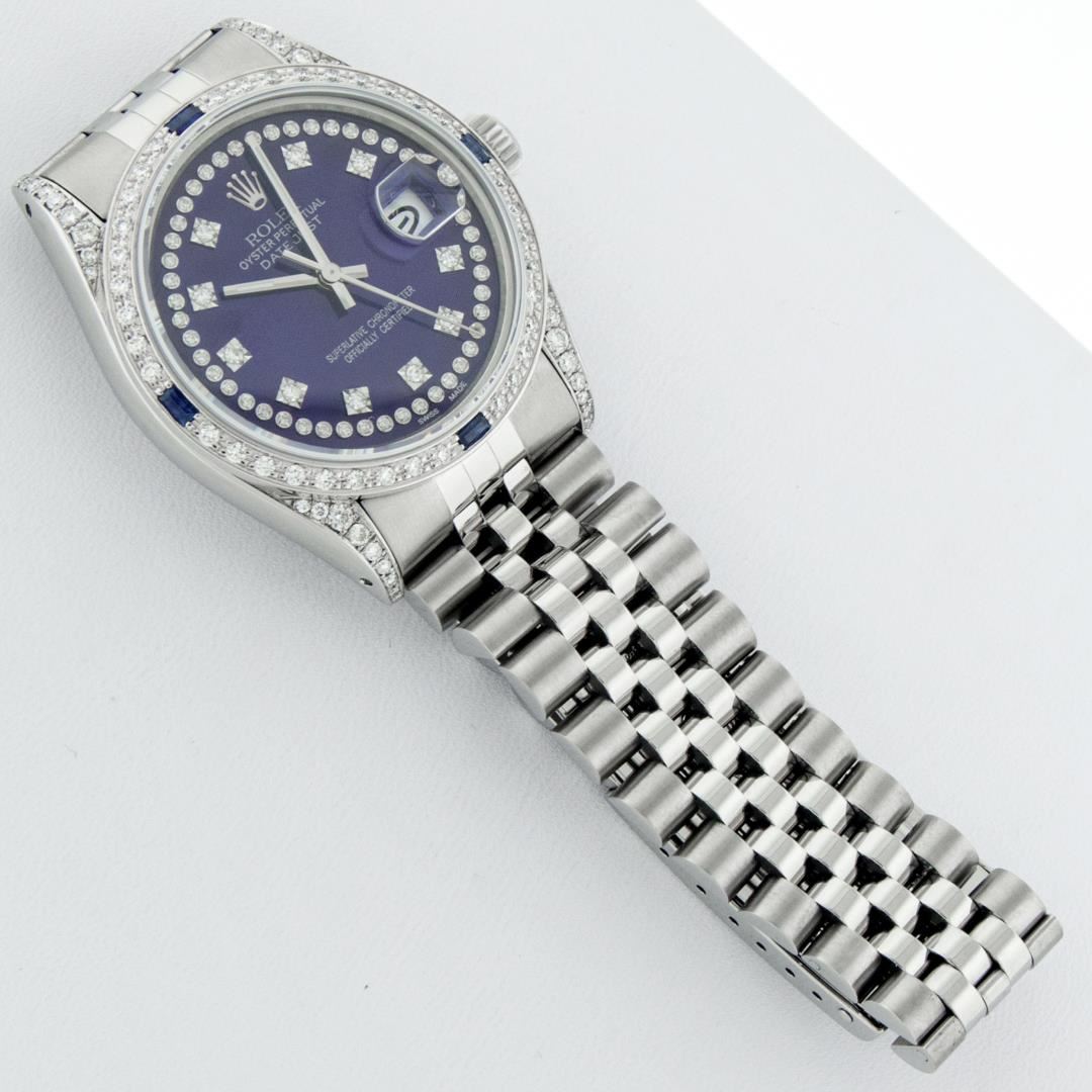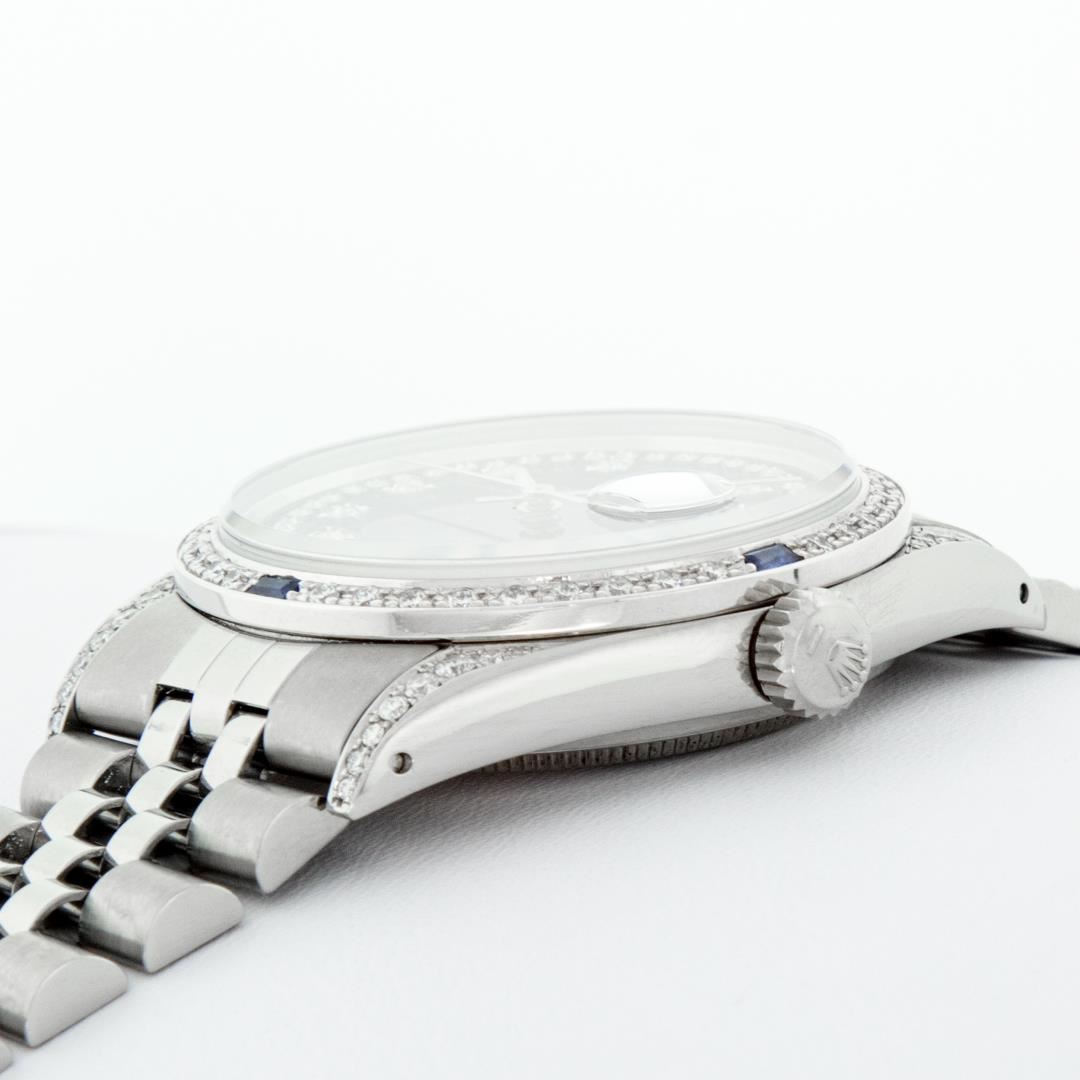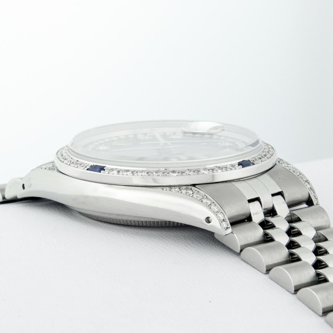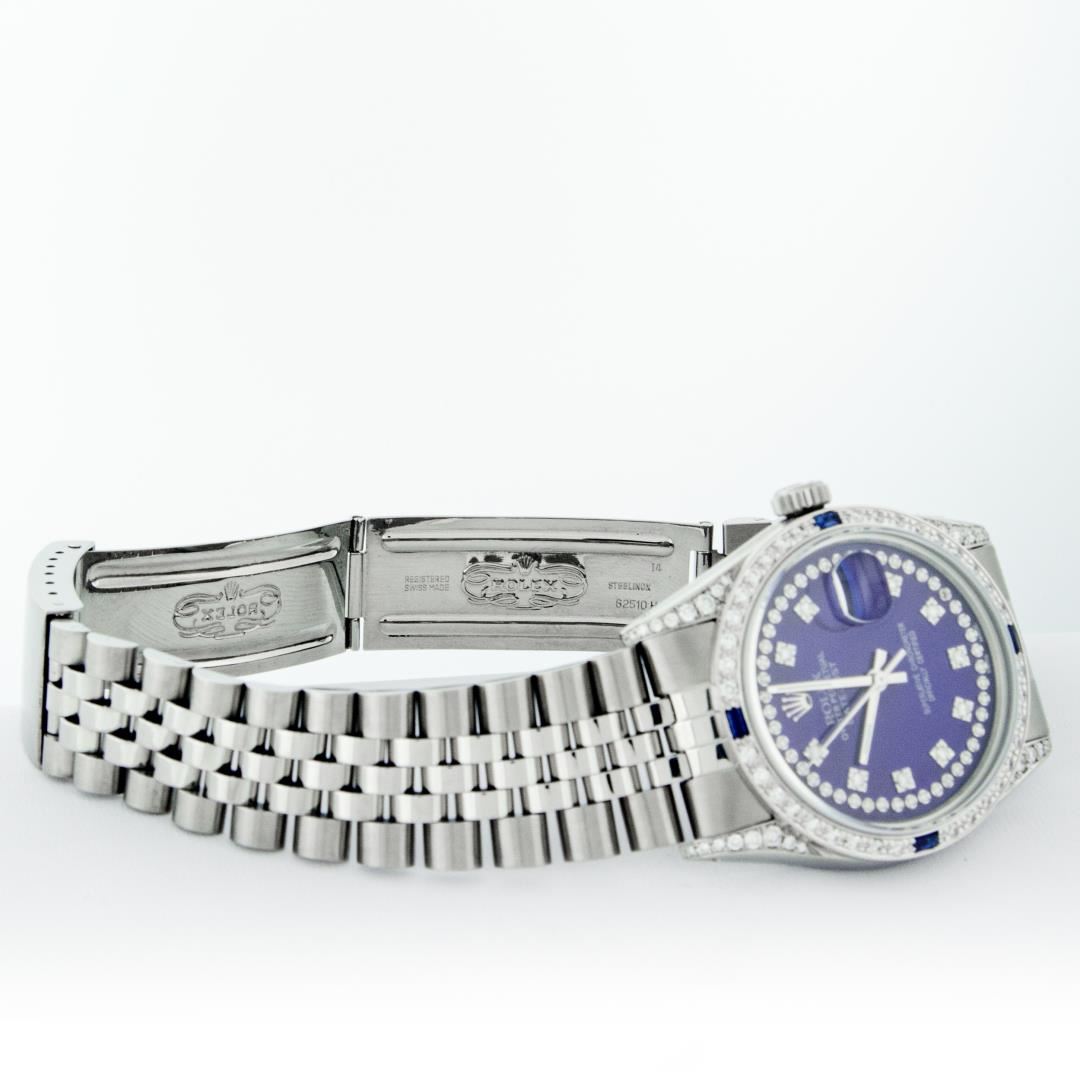 One Mens Pre Owned Rolex Datejust Polished Bright with Satin Finish, Serviced And Electronically Tested, Stainless Steel Case: 36mm, Custom Diamond Lugs: 28 Added Diamonds On Lugs. Stainless Steel Crown, Custom Bezel: 18K White Gold Diamond + Sapphire Beadset, Diamond Count: 36 Diamonds + 4 Sapphires. Custom Crystal: New Sapphire With Magnified Date Window. Custom Hands: New Luminescent Hands. Rolex Movement: Automatic Winding Movement 3035. Custom Dial: Custom Blue Dial With Added String Diamonds, Stone Count: 43 Diamonds On Dial. Date Window: 3 O'Clock Position Date Display, Quickset, Model: Quickset Datejust Condition: G-6 Extra Fine. Rolex Bracelet: Stainless Steel Jubilee Band. Bright Polish & Satin Finish. 7.0 Inch Length, Adjustable. Standard Clasp, With Rolex Logo. This Watch Has Been Serviced And Polished And Its Free Of All Dents And Scratches.