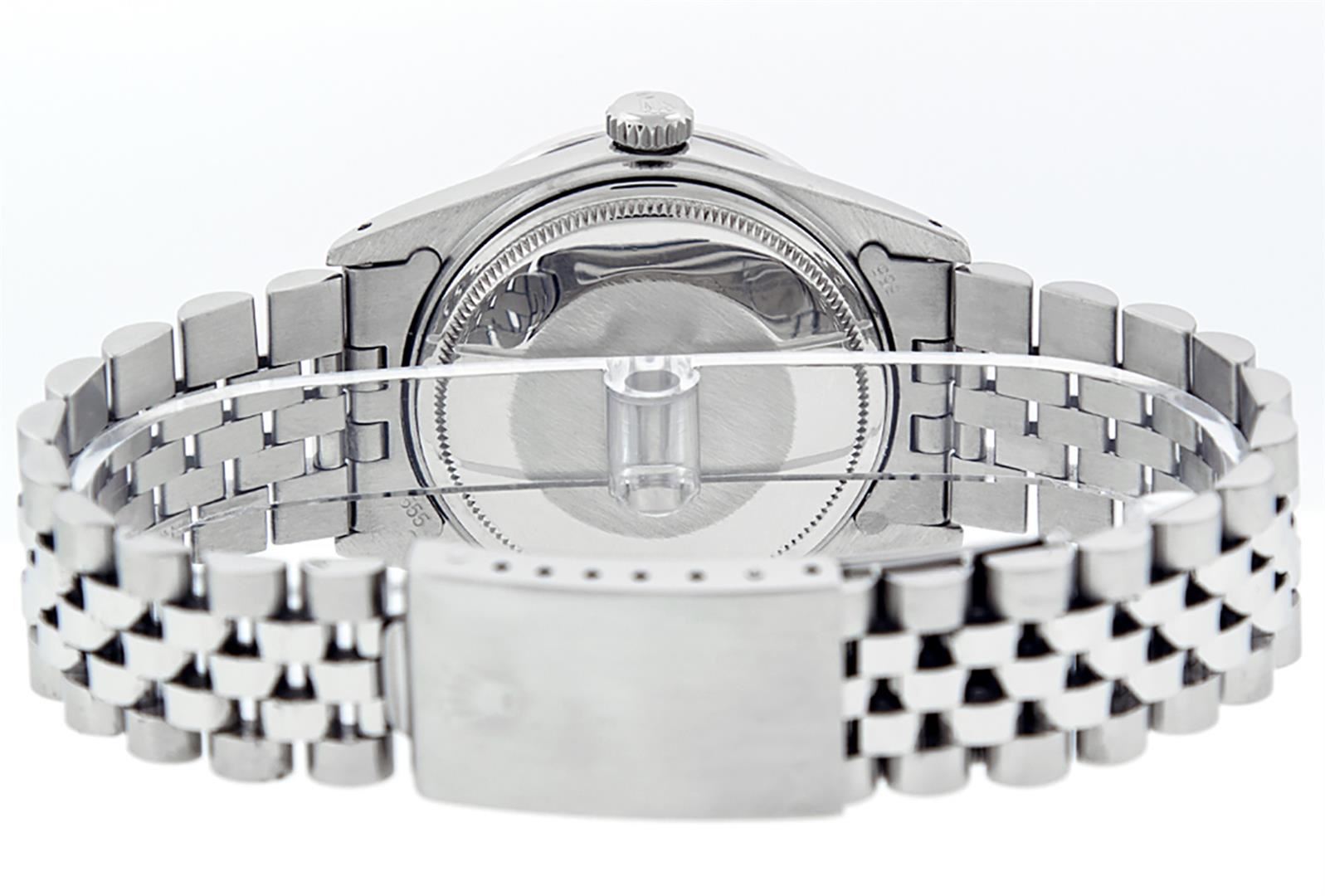 One Mens Stainless Steel Rolex Datejust Polished, Serviced & Electronically Tested, Stainless Steel Case: 36mm, Stainless Steel Crown, Custom Bezel: New 18K White Gold Beadset Diamond Bezel, Diamond Count: 44 Diamonds In Bezel, Total Weight 1.00 Carat, Clarity: SI-VS, Color: G to H. Custom Crystal: New Scratch Resistant Synthetic Sapphire Cyclops Lens. Custom Hands: New Luminescent Hands. Movement: Automatic Winding Movement Caliber 3035. Custom Dial: Silver Diamond Dial, Diamond Count: 10 Diamonds in Dial, G To H In Color, Clarity: SI-VS. Date Window: 3 O'Clock Position Date Display, Quickset, Model: Datejust. Condition: G-6 Extra Fine. Bracelet: Stainless Steel Jubilee Band. Bright Polish & Satin Finish. 7.0 Inch Length, Adjustable. Standard Clasp, With Rolex Logo. This Watch Has Been Serviced Time Tested And Is In Excellent Condition It Is Free Of All Scratches And Dents.
